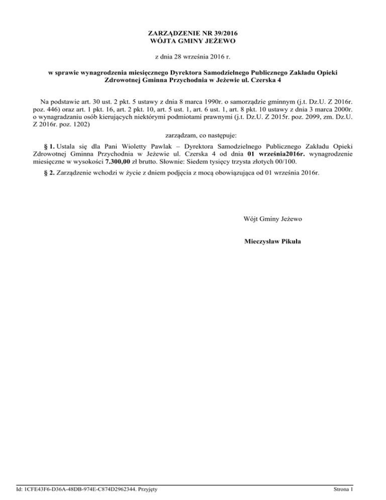 ZARZĄDZENIE NR 39/2016 WÓJTA GMINY JEŻEWO z dnia 28 września 2016 r. w sprawie wynagrodzenia miesięcznego Dyrektora Samodzielnego Publicznego Zakładu Opieki Zdrowotnej Gminna Przychodnia w Jeżewie ul. Czerska 4 Na podstawie art. 30 ust. 2 pkt. 5 ustawy z dnia 8 marca 1990r. o samorządzie gminnym (j.t. Dz.U. Z 2016r. poz. 446) oraz art. 1 pkt. 16, art. 2 pkt. 10, art. 5 ust. 1, art. 6 ust. 1, art. 8 pkt. 10 ustawy z dnia 3 marca 2000r. o wynagradzaniu osób kierujących niektórymi podmiotami prawnymi (j.t. Dz.U. Z 2015r. poz. 2099, zm. Dz.U. Z 2016r. poz. 1202) zarządzam, co następuje: § 1. Ustala się dla Pani Wioletty Pawlak – Dyrektora Samodzielnego Publicznego Zakładu Opieki Zdrowotnej Gminna Przychodnia w Jeżewie ul. Czerska 4 od dnia 01 września2016r. wynagrodzenie miesięczne w wysokości 7.300,00 zł brutto. Słownie: Siedem tysięcy trzysta złotych 00/100. § 2. Zarządzenie wchodzi w życie z dniem podjęcia z mocą obowiązująca od 01 września 2016r. Wójt Gminy Jeżewo Mieczysław Pikuła Id: 1CFE43F6-D36A-48DB-974E-C874D2962344. Przyjęty Strona 1 Uzasadnienie Zgodnie z art. 6 ust. 1, art. 5 oraz art. 8 pkt. 10 ustawy z dnia 3 marca 2000r. wynagradzaniu osób kierujących niektórymi podmiotami prawnymi (j.t. Dz.U. Z 2015r. poz. 2099, zm. Dz.U. Z 2016r. poz. 1202) organem właściwym do ustalania wynagrodzenia miesięcznego kierownika samodzielnego publicznego zakładu opieki zdrowotnej jest organ założycielski lub organ właściwy do reprezentowania Skarbu Państwa lub jednostki samorządu terytorialnego w podmiocie albo organ który utworzył lub nadzoruje dany podmiot, albo któremu podlega kierownik sp. zoz. Dyrektorowi SP ZOZ niezależnie od podstawy nawiązania stosunku pracy lub rodzaju umowy cywilnoprawnej stanowiącej podstawę zatrudnienia przysługuje wyłącznie wynagrodzenie miesięczne. (Ponadto-na warunkach określonych w w/wym. Ustawie Dyrektorowi może być przyznana nagroda roczna oraz świadczenia dodatkowe). Maksymalna wysokość wynagrodzenia miesięcznego nie może przekroczyć sześciokrotności przeciętnego miesięcznego wynagrodzenia w sektorze przedsiębiorstw bez wypłat z zysku w czwartym kwartale roku poprzedniego, ogłoszonego przez Prezesa GUS. Zgodnie z Obwieszczeniem Prezesa GUS z dnia 22 stycznia 2016r. przeciętne miesięczne wynagrodzenie w sektorze przedsiębiorstw bez wypłat nagród z zysku w czwartym kwartale roku 2015 wyniosło 4.280,39 (Dz.Urz. GUS z 2015r. poz. 2). Sześciokrotność w/wym. kwoty wynosi 25.682,34 zł. Słownie: Dwadzieścia pięć tysięcy sześćset osiemdziesiąt dwa złote 34/100. Wójt Gminy Jeżewo Mieczysław Pikuła Id: 1CFE43F6-D36A-48DB-974E-C874D2962344. Przyjęty Strona 1