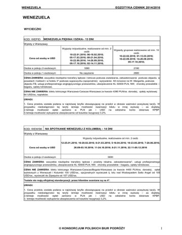 WENEZUELA EGZOTYKA CENNIK 2014/2016 WENEZUELA WYCIECZKI KOD: WEPID WENEZUELA PIĘKNA I DZIKA– 13 DNI Wyloty z Warszawy Wyjazdy indywidualne, realizowane od min. 2 osób 10-22.01.2016; 06-18.02.2016; 05-17.03.2016; 09-21.04.2016; 10-22.09.2016; 14-26.09.2016; 05-17.10.2016; 02-14.11.2016; Wyjazdy grupowe realizowane od min. 10 osób 10-22.02.2016; 01-13.03.2016; 10-22.09.2016; 14-26.09.2016; 05-17.10.2016; Osoba w pokoju 2-osobowym 1890 2190 Osoba w pokoju 1-osobowym Na zapytanie 2880 Cena od osoby w USD CENA ZAWIERA: wszystkie niezbędne transfery lądowe i lotnicze podczas zwiedzania, zakwaterowanie podczas objazdu w posadach i lodżach i w hotelu 3* podczas wypoczynku (opcjonalnie); wyżywienie All inclusive na W. Margarita, podczas objazdu FB, usługi profesjonalnego anglojęzycznego przewodnika, ubezpieczenie KL 50000 PLN, NW, choroby przewlekłe i bagażu, opłaty lotniskowe. CENA NIE ZAWIERA: biletu lotniczego Warszawa-Caracas-Warszawa (w kwocie 4390 PLN/os. dorosła), opłaty wylotowej 64 USD/os, napiwków. UWAGI: 1. Cena przelotu została podana w najniższej taryfie obowiązującej na przelot w okresie ważności powyższej taryfy. W przypadku niedostępności tej taryfy istnieje możliwość rezerwacji biletu w innej wyższej – za dopłatą. 2.Istnieje możliwość wpłat zarówno w PLN jak i USD na oddzielne konto dolarowe KPBP. 3.Istnieje możliwość wykupienia ubezpieczenia od kosztów rezygnacji 3,2%. KOD: WEWSK NA SPOTKANIE WENEZUELI Z KOLUMBIĄ – 14 DNI Wyloty z Warszawy Wyjazdy indywidualne, realizowane od min. 2 osób 12-25.01.2016; 16-29.02.2016; 8-21.03.2016; 5-18.04.2016; 10-23.05.2016; 7-20.06.2016; Cena od osoby w USD Osoba w pokoju 2-osobowym 20.09-03.10.2016; 11-24.10.2016; 8-21.11.2016; 22.11-05.12.2016 3000 CENA ZAWIERA: wszystkie niezbędne transfery lądowe i przeloty lokalne, zakwaterowanie*, usługi profesjonalnego anglojęzycznego przewodnika, ubezpieczenie KL 50000 PLN, NW, choroby przewlekłe i bagażu, opłaty lotniskowe. CENA NIE ZAWIERA: biletu lotniczego Warszawa-Caracas/Bogota-Warszawa (w kwocie 4400 PLN/os. dorosła), opłat wylotowych z Wenezueli i Kolumbii 100 USD/os., opcjonalnych wycieczek tj. lotu nad Wodospadem Salto Angel od 105 USD/os., wycieczki do Zipaquira od 107 USD/os. *hotele nie mają oficjalnej standaryzacji; przez klientów oceniane są na 4*. UWAGI: 1. Cena przelotu została podana w najniższej taryfie obowiązującej na przelot w okresie ważności powyższej taryfy. W przypadku niedostępności tej taryfy istnieje możliwość rezerwacji biletu w innej wyższej – za dopłatą. 2.Istnieje możliwość wpłat zarówno w PLN jak i USD na oddzielne konto dolarowe KPBP. 3. Istnieje możliwość wykupienia ubezpieczenia od kosztów rezygnacji 3,2%. © KONSORCJUM POLSKICH BIUR PODRÓŻY 1 WENEZUELA EGZOTYKA CENNIK 2014/2016 WYSPA MARGARITA I WYSPA COCHE HOTELE KOD: WEHIM HESPERIA ISLA MARGARITA***** (ALL INCLUSIVE) - WYSPA MARGARITA Wyloty z Warszawy 01.08-31.08.2016 01.09-31.10.2016 Cena od osoby w USD 9 dni / 7 nocy 16 dni / 14 nocy 9 dni / 7 nocy 16 dni / 14 nocy Osoba w pokoju 2-osobowym 1215 1975 985 1510 Osoba w pokoju 1-osobowym 1470 2490 1350 2240 Dziecko 2-12 lat z 2 os. dorosł. 1025 1600 740 1020 01.11-20.12.2016 Cena od osoby w USD 9 dni / 7 nocy 16 dni / 14 nocy Osoba w pokoju 2-osobowym 1180 1695 Osoba w pokoju 1-osobowym 1490 2490 Dziecko 2-12 lat z 2 os. dorosł. 925 1590 KOD: WEDUN DUNES PUERTO CRUZ**** (ALL INCLUSIVE) - WYSPA MARGARITA Wyloty z Warszawy 03.01-31.07.2016 01.08-20.12.2016 Cena od osoby w USD 9 dni / 7 nocy 16 dni / 14 nocy 9 dni / 7 nocy 16 dni / 14 nocy Osoba w pokoju 2-osobowym 840 1260 750 1080 Osoba w pokoju 1-osobowym 1130 1860 995 1570 Dziecko 7-12 lat z 2 os. dorosł. 580 850 600 770 KOD: WEHPA HESPERIA PLAYA EL AGUA**** (ALL INCLUSIVE) - WYSPA MARGARITA Wyloty z Warszawy 01.07-31.10.2016 05.01-31.07.2016; 1.11-20.12.15 Cena od osoby w USD 9 dni / 7 nocy 16 dni / 14 nocy 9 dni / 7 nocy 16 dni / 14 nocy Osoba w pokoju 2-osobowym 970 1530 1050 1695 Osoba w pokoju 1-osobowym 1315 2215 1610 2500 Dziecko 5-12 lat z 2 os. dorosł. 720 995 755 1100 KOD: WELGM LAGUNA MAR**** (ALL INCLUSIVE) - WYSPA MARGARITA Wyloty z Warszawy 27.03-05.04.2016 06.04-31.07.2016; 11.09-22.12.2016 Cena od osoby w USD 9 dni / 7 nocy 16 dni / 14 nocy 9 dni / 7 nocy 16 dni / 14 nocy Osoba w pokoju 2-osobowym 1080 1730 925 1450 Osoba w pokoju 1-osobowym 1320 2230 1165 1930 Dziecko 2-12 lat z 2 os. dorosł. 815 1225 725 1040 27.03-05.04.2016 01.08-10.09.2016 Cena od osoby w USD 9 dni / 7 nocy 16 dni / 14 nocy 9 dni / 7 nocy 16 dni / 14 nocy Osoba w pokoju 2-osobowym 1080 1760 1115 1830 Osoba w pokoju 1-osobowym 1320 2235 1370 2335 Dziecko 2-12 lat z 2 os. dorosł. 815 1225 850 1295 2 © KONSORCJUM POLSKICH BIUR PODRÓŻY WENEZUELA KOD: WETBS EGZOTYKA CENNIK 2014/2016 TIBISAY BOUTIQUE **** (ALL INCLUSIVE) - WYSPA MARGARITA Wyloty z Warszawy 05.01-30.06.2016 01.07-20.12.2016 Cena od osoby w USD 9 dni / 7 nocy 16 dni / 14 nocy 9 dni / 7 nocy 16 dni / 14 nocy Osoba w pokoju 2-osobowym 960 1270 905 1405 Osoba w pokoju 1-osobowym 1510 2610 1330 2250 KOD: WEICR ISLA CARIBE**** (ALL INCLUSIVE) - WYSPA MARGARITA Wyloty z Warszawy 01.04-31.07.2016 01.08-31.08.2016 Cena od osoby w USD 9 dni / 7 nocy 9 dni / 7 nocy 9 dni / 7 nocy 16 dni / 14 nocy Osoba w pokoju 2-osobowym 810 1210 900 1370 Trzecia os. na dostawce w pokoju 2-os. 820 1245 870 1320 Osoba w pokoju 1-osobowym 970 1540 1040 1650 Dziecko 2-12 lat z 2 os. dorosł. 615 830 670 905 01.09-20.12.2016 Cena od osoby w USD 9 dni / 7 nocy 16 dni / 14 nocy Osoba w pokoju 2-osobowym 820 1200 Trzecia os. na dostawce w pokoju 2-os. 790 1150 Osoba w pokoju 1-osobowym 960 1480 Dziecko 2-12 lat z 2 os. dorosł. 630 820 KOD: WEPTB PUNTA BLANCA OCEAN CLUB **** (ALL INCLUSIVE) - WYSPA COCHE Wyloty z Warszawy 05.01-31.08.2016 01.09-20.12.2016 Cena od osoby w USD 9 dni / 7 nocy 16 dni / 14 nocy 9 dni / 7 nocy 16 dni / 14 nocy Osoba w pokoju 2-osobowym 990 1485 930 1350 Osoba w pokoju 1-osobow