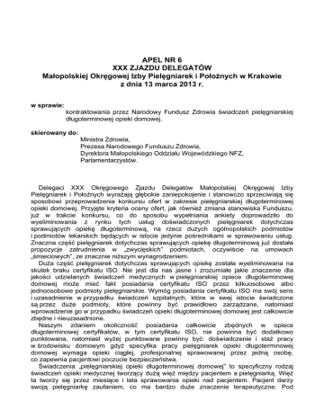 APEL NR 6 XXX ZJAZDU DELEGATÓW Małopolskiej Okręgowej Izby Pielęgniarek i Położnych w Krakowie z dnia 13 marca 2013 r. w sprawie: kontraktowania przez Narodowy Fundusz Zdrowia świadczeń pielęgniarskiej długoterminowej opieki domowej. skierowany do: Ministra Zdrowia, Prezesa Narodowego Funduszu Zdrowia, Dyrektora Małopolskiego Oddziału Wojewódzkiego NFZ, Parlamentarzystów. Delegaci XXX Okręgowego Zjazdu Delegatów Małopolskiej Okręgowej Izby Pielęgniarek i Położnych wyrażają głębokie zaniepokojenie i stanowczo sprzeciwiają się sposobowi przeprowadzenia konkursu ofert w zakresie pielęgniarskiej długoterminowej opieki domowej. Przyjęte kryteria oceny ofert, jak również zmiana stanowiska Funduszu, już w trakcie konkursu, co do sposobu wypełniania ankiety doprowadziło do wyeliminowania z rynku tych usług doświadczonych pielęgniarek dotychczas sprawujących opiekę długoterminową, na rzecz dużych ogólnopolskich podmiotów i podmiotów lekarskich będących w istocie jedynie pośrednikami w sprawowaniu usług. Znaczna część pielęgniarek dotychczas sprawujących opiekę długoterminową już dostała propozycje zatrudnienia w „zwycięskich” podmiotach, oczywiście na umowach „śmieciowych”, ze znacznie niższym wynagrodzeniem. Duża część pielęgniarek dotychczas sprawujących opiekę została wyeliminowana na skutek braku certyfikatu ISO. Nie jest dla nas jasne i zrozumiałe jakie znaczenie dla jakości udzielanych świadczeń medycznych w pielęgniarskiej opiece długoterminowej domowej może mieć fakt posiadania certyfikatu ISO przez kilkuosobowe albo jednoosobowe podmioty pielęgniarskie. Wymóg posiadania certyfikatu ISO ma swój sens i uzasadnienie w przypadku świadczeń szpitalnych, które w swej istocie świadczone są przez duże podmioty, które powinny być prawidłowo zarządzane, natomiast wprowadzenie go w przypadku świadczeń opieki długoterminowej domowej jest całkowicie zbędne i nieuzasadnione. Naszym zdaniem okoliczność posiadania całkowicie zbędnych w opiece długoterminowej certyfikatów, w tym certyfikatu ISO, nie powinna być dodatkowo punktowana, natomiast wyżej punktowane powinny być: doświadczenie i staż pracy w środowisku domowym gdyż specyfika pracy pielęgniarek opieki długoterminowej domowej wymaga opieki ciągłej, profesjonalnej sprawowanej przez jedną osobę, co zapewnia pacjentowi poczucie bezpieczeństwa. Świadczenia „pielęgniarskiej opieki długoterminowej domowej” to specyficzny rodzaj świadczeń opieki medycznej tworzący dużą więź między pacjentem a pielęgniarką. Więź ta tworzy się przez miesiące i lata sprawowania opieki nad pacjentem. Pacjent darzy swoją pielęgniarkę zaufaniem, co ma bardzo duże znaczenie terapeutyczne. Pod względem medycznym celowe jest aby świadczenia opieki długoterminowej domowej były wykonywane przez pielęgniarki, które pacjenci darzą zaufaniem. Dla pacjentów „opieki długoterminowej domowej” bardzo ważna jest stabilizacja udzielanych świadczeń. Pielęgniarki sprawujące dotychczas opiekę długoterminową domową znają swoich pacjentów i ich potrzeby zdrowotne, stąd mogą w sposób optymalny dobierać zakres i rodzaj sprawowanej opieki. „Opieka długoterminowa” to praca bardzo ciężka wymagająca dużego poświęcenia od wykonujących je pielęgniarek. Praca ta wymaga jednocześnie odpowiednich wysokich kwalifikacji zawodowych. Zmiana pielęgniarki i objęcie opieki nad pacjentami długoterminowymi przez personel zatrudniany przez duże firmy, z dużą dozą prawdopodobieństwa doprowadzi do pogorszenia się stanu zdrowia tych pacjentów i spowoduje wzrost kosztów ich leczenia ponoszonych przez NFZ. Pielęgniarki świadczące usługi w zakresie opieki długoterminowej domowej poczyniły znaczne nakłady finansowe na zakup nowoczesnego sprzętu, który jest niezbędny do pielęgnacji chorego, aby sprostać, coraz większym wymaganiom chorych i ich rodzin, dbają o jakość świadczeń udzielanych pacjentom stale podnosząc swoje kwalifikacje zawodowe. W świetle powyższych okoliczności postulujemy aby konkursy uzupełniające w zakresie opieki długoterminowej domowej zostały przeprowadzone w trybie rokowań skierowanych wyłącznie do pielęgniarek dotychczas sprawujących opiekę nad pacjentami. Postulujemy ponadto aby do kontraktowania świadczeń opieki długoterminowej domowej w przyszłości zastosować zasady wnioskowania przez pacjenta. Przyjęcie takich zasad jest racjonalne pod względem organizacyjnym, medycznym i finansowym, ponieważ pozwoli na uniknięcie zarówno stresu pacjentów spowodowanego koniecznością zmiany pielęgniarki, jak i dodatkowych kosztów związanych z leczeniem pacjentów powstałych w związku ze stresem wywołanym zmianą pielęgniarki sprawującej opiekę długoterminową domową. Wnioskujemy o zwiększenie w budżecie NFZ nakładów na pielęgniarską opiekę długoterminową domową. SEKRETARZ XXX Zjazdu Delegatów MOIPiP PRZEWODNICZĄCA XXX Zjazdu Delegatów MOIPiP mgr Halina Kolber-Sala mgr Danuta Adamek