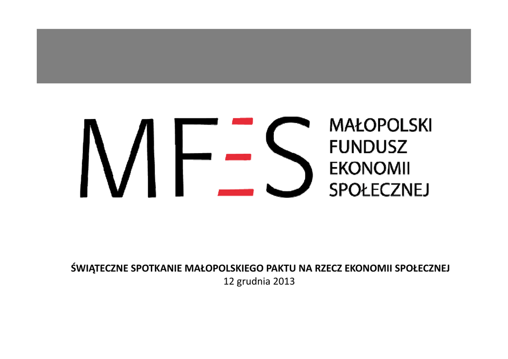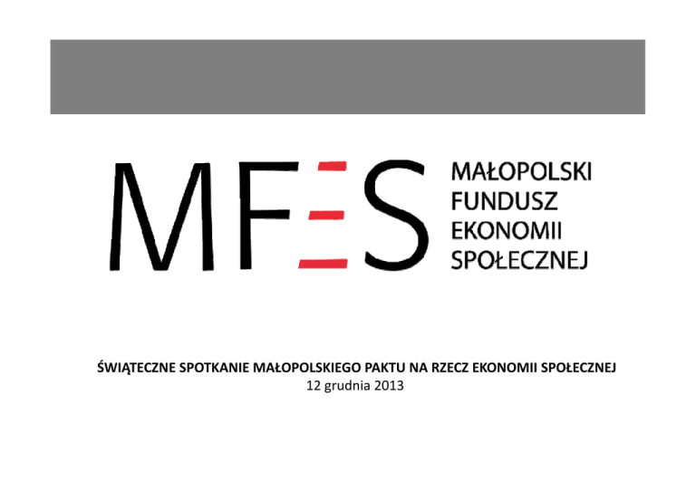 ŚWIĄTECZNE SPOTKANIE MAŁOPOLSKIEGO PAKTU NA RZECZ EKONOMII SPOŁECZNEJ 12 grudnia 2013 Oferta 1. Zwrotne źródła finansowania start-up - „Pierwszy Biznes – Wsparcie w Starcie” – rządowy program pożyczek dla start-up studentów i absolwentów 2. Poręczenia dla: - spółdzielni Socjalnych - ngo - osób rozpoczynających działalność gospodarczą Pierwszy Biznes – Wsparcie w starcie o programie Fundusz pożyczkowy dla studentów i absolwentów BGK na zlecenie Ministerstwa Pracy i Polityki Społecznej (MPiPS) wdraża pilotażowy Program "Pierwszy biznes - Wsparcie w starcie". W ramach Programu udzielane są niskooprocentowane pożyczki dla absolwentów i studentów ostatniego roku studiów wyższych na rozpoczęcie działalności gospodarczej, oraz na utworzenie stanowiska dla osoby bezrobotnej. Od 2013 r. pilotaż Programu obejmuje województwa małopolskie, mazowieckie i świętokrzyskie. Od 2014 r. Program będzie wdrażany w kolejnych województwach. Pierwszy Biznes – Wsparcie w starcie Dla kogo? O pożyczkę mogą ubiegać się pozostający bez pracy: 1. absolwenci szkół wyższych tj. I, II stopnia oraz jednolitych studiów magisterskich w okresie 48 miesięcy od dnia otrzymania dyplomu, 2. studenci ostatniego roku studiów wyższych tj. ostatniego roku studiów licencjackich lub magisterskich. Nie jest wymagany formalny status bezrobotnego. Pierwszy Biznes – Wsparcie w starcie Warunki pożyczki Podstawowe warunki pożyczki: - wartość pożyczki: do 60 tys. zł - okres spłaty: maks. 7 lat - możliwa karencja do 12 miesięcy - roczne oprocentowanie pożyczki: 0,25 stopy redyskonta weksli NBP (obecnie 0,69%) - oprocentowanie stałe w całym okresie kredytowania - pożyczkobiorca nie ponosi żadnych opłat i prowizji za czynności związane z udzieleniem i obsługą pożyczki - o pożyczkę mogą ubiegać się także osoby, które zamierzają prowadzić wspólnie działalność gospodarczą. Pierwszy Biznes – Wsparcie w starcie Pożyczka uzupełniająca Pożyczka na utworzenie stanowiska pracy dla bezrobotnego (pożyczka uzupełniająca): - Wartość pożyczki: do 20 tys. zł, - Termin wnioskowania: po 3 miesiącach spłacania rat kapitałowo-odsetkowych - Możliwość umorzenia pozostałej do spłaty kwoty kapitału, jeśli utworzone stanowisko pracy utrzymane zostało przez minimum 1 rok Pierwszy Biznes – Wsparcie w starcie Zabezpieczenie Pożyczki Prawne zabezpieczenie pożyczki stanowić będzie - weksel własny pożyczkobiorcy, - poręczenie dwóch osób fizycznych. W zależności od wyników oceny zdolności kredytowej i ryzyka kredytowego, przyznanie pożyczki będzie mogło być uzależnione od ustanowienia dodatkowego/innego zabezpieczenia spłaty. Poręczenia i pożyczki Dotychczasowe rezultaty Fundusz pożyczkowy dla studentów i absolwentów Do grudnia 2013 udzieliliśmy: - ponad 100 poręczeń i pożyczek na łączną kwotę prawie 5.400.000 zł, Pomogliśmy stworzyć 34 spółdzielnie socjalne i 35 mikroprzedsiębiorstwa Pozwoliło to utworzyć 253 miejsca pracy, w tym: - 237 dla osób bezrobotnych, - 20 dla osób niepełnosprawnych, - 124 dla kobiet. . MFES - kontakt Kontakt Małopolski Fundusz Ekonomii Społecznej Kraków, Rakowicka 10b/10 IIIp. www.mfes.pl