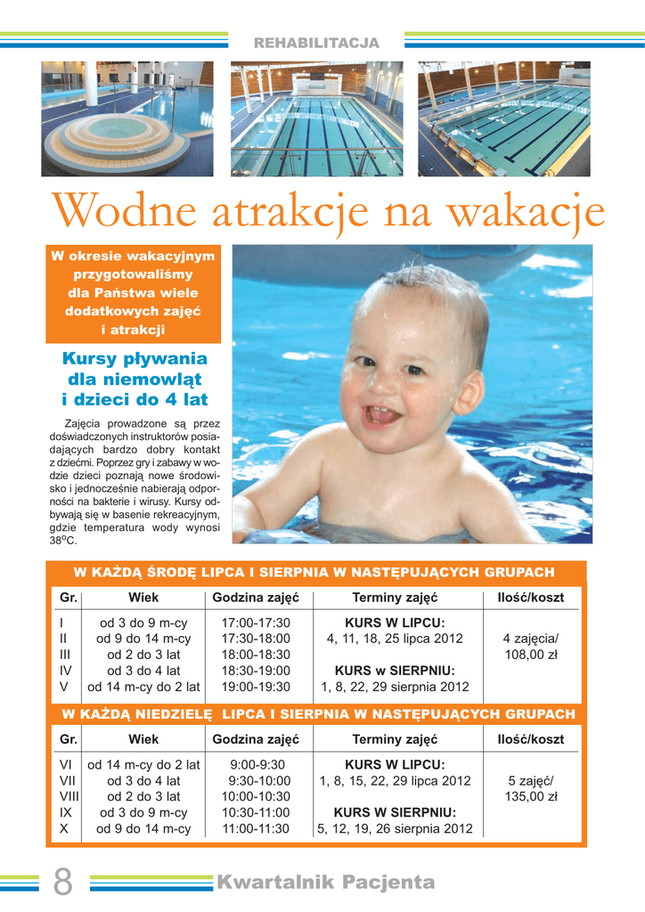 REHABILITACJA Wodne atrakcje na wakacje W okresie wakacyjnym przygotowaliśmy dla Państwa wiele dodatkowych zajęć i atrakcji Kursy pływania dla niemowląt i dzieci do 4 lat Zajęcia prowadzone są przez doświadczonych instruktorów posiadających bardzo dobry kontakt z dziećmi. Poprzez gry i zabawy w wodzie dzieci poznają nowe środowisko i jednocześnie nabierają odporności na bakterie i wirusy. Kursy odbywają się w basenie rekreacyjnym, gdzie temperatura wody wynosi 38oC. W KAŻDĄ ŚRODĘ LIPCA I SIERPNIA W NASTĘPUJĄCYCH GRUPACH Gr. Wiek Godzina zajęć Terminy zajęć I II III IV V od 3 do 9 m-cy od 9 do 14 m-cy od 2 do 3 lat od 3 do 4 lat od 14 m-cy do 2 lat 17:00-17:30 17:30-18:00 18:00-18:30 18:30-19:00 19:00-19:30 KURS W LIPCU: 4, 11, 18, 25 lipca 2012 Ilość/koszt 4 zajęcia/ 108,00 zł KURS w SIERPNIU: 1, 8, 22, 29 sierpnia 2012 W KAŻDĄ NIEDZIELĘ LIPCA I SIERPNIA W NASTĘPUJĄCYCH GRUPACH Gr. Wiek VI od 14 m-cy do 2 lat VII od 3 do 4 lat VIII od 2 do 3 lat IX od 3 do 9 m-cy X od 9 do 14 m-cy 8 Godzina zajęć Terminy zajęć 9:00-9:30 9:30-10:00 10:00-10:30 10:30-11:00 11:00-11:30 KURS W LIPCU: 1, 8, 15, 22, 29 lipca 2012 KURS W SIERPNIU: 5, 12, 19, 26 sierpnia 2012 Kwartalnik Pacjenta Ilość/koszt 5 zajęć/ 135,00 zł REHABILITACJA OKRES 01.07 – 31.08.2012, PONIEDZIAŁEK – ŚRODA (2 X W TYGODNIU) Gr. Wiek I II III IV V 6 – 10 6 – 10 od 11 lat od 11 lat DOROŚLI Początek kursu Godzina zajęć od od od od od 16.15 17.00 17.45 18.30 19.15 2 2 2 2 2 lipca lipca lipca lipca lipca – – – – – 17.00 17.45 18.30 19.15 20.00 Ilość/koszt 17 17 17 17 17 zajęć zajęć zajęć zajęć zajęć /255 /255 /255 /255 /255 Rodzaj zajęć * zł zł zł zł zł Nauka pływania Nauka i doskonalenie Nauka pływania Nauka i doskonalenie Nauka pływania OKRES 01.07 – 31.08.2012, WTOREK - CZWARTEK (2 X W TYGODNIU) Gr. Wiek VI 6 – 10 VII 6 – 10 VIII od 11 lat IX od 11 lat X DOROŚLI Początek kursu od 3 lipca od 3 lipca od 3 lipca od 3 lipca od 3 lipca Godzina zajęć 16.15 17.00 17.45 18.30 19.15 – – – – – 17.00 17.45 18.30 19.15 20.00 Ilość/koszt 18 18 18 18 18 zajęć zajęć zajęć zajęć zajęć /270 /270 /270 /270 /270 Rodzaj zajęć * zł zł zł zł zł Nauka pływania Nauka i doskonalenie Nauka pływania Nauka i doskonalenie Nauka i doskonalenie Wakacyjne zajęcia nauki pływania Wakacje do idealny moment by nauczyć się pływać albo udoskonalić swoje umiejętności. Przygotowaliśmy dla Ciebie dwa rodzaje kursów, po których będziesz mógł korzystać ze wszystkich wodnych atrakcji na wakacjach. Kurs nauki pływania przeznaczony dla osób nie pływających Obejmuje on oswajanie się ze środowiskiem wodnym, naukę ruchów napędowych nóg i ramion przygotowujących do kraula na grzbiecie i kraula na piersiach, poślizgi, zanurzenia, proste skoki. Kurs nauki i doskonalenia pływania Obejmuje on doskonalenie posiadanych umiejętności pływackich – ruchy napędowe ramion i nóg w stylach pływackich, ćwiczenia koordynacyjne, strzałki/poślizgi, skoki, nurkowania. Pływanie pod wodą i pokonywanie przeszkód. Zapraszamy Wszystkich na zajęcia fitness w wodzie HARMONOGRAM ZAJĘĆ OD 1 DO 31 LIPCA 2012 ROKU Godziny Poniedziałek Wtorek Środa Czwartek od 20.00 do 20.30 prowadzi Aqua Areobic p. Kasia Aqua Areobic p. Kasia Aqua Zumba p. Barbara Aqua Areobic p. Adrianna od 20.35 do 21.05 prowadzi Aqua Areobic p. Kasia Aqua Areobic p. Kasia Aqua Zumba p. Barbara Aqua Areobic p. Adrianna od 21.10 do 21.40 prowadzi Aqua Areobic p. Kasia Aqua Areobic p. Kasia Aqua Zumba p. Barbara Aqua Areobic p. Adrianna Szczegółowe regulaminy, cenniki znajdują się na stronie www.basen-muszelka.pl Kwartalnik Pacjenta 9