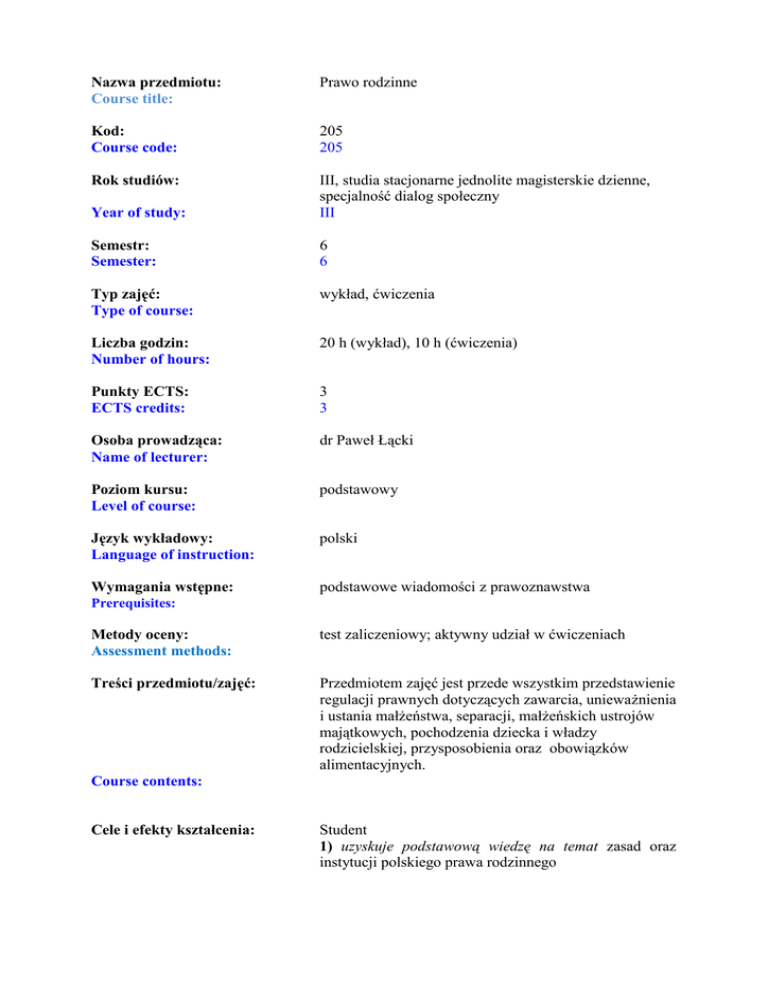 Nazwa przedmiotu: Prawo rodzinne Course title: Kod: 205 Course