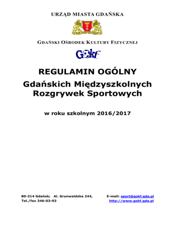 URZĄD MIASTA GDAŃSKA G DAŃSKI O ŚRODEK K ULTURY F IZYCZNEJ REGULAMIN OGÓLNY Gdańskich Międzyszkolnych Rozgrywek Sportowych w roku szkolnym 2016/2017 80-314 Gdańsk; Al. Grunwaldzka 244, Tel./fax 346-03-03 E-mail: [email protected] http://www.gokf.gda.pl Zasady Współzawodnictwa Gdańskich Międzyszkolnych Rozgrywek Sportowych I. 1. POSTANOWIENIA OGÓLNE Miejskie, gminne i powiatowe Gdańskie Rozgrywki Sportowe Młodzieży Szkolnej j gdańskich Szkół stanowią integralną część rozgrywek od szczebla szkolnego do szczebla centralnego /ogólnokrajowego/. 2. Gdańskie Rozgrywki organizowane są w trzech kategoriach wiekowych: a) Gdańskie Igrzyska Młodzieży Szkolnej - Mistrzostwa gdańskich Szkół Podstawowych b) Gdańska Gimnazjada - Mistrzostwa gdańskich Gimnazjów c) Gdańska Licealiada - Mistrzostwa gdańskich Szkół Ponadgimnazjalnych. 3. Szkolny Związek Sportowy w związku z zaleceniami Ministerstwa Sportu i Turystyki w bieżącym roku szkolnym wprowadza systemie współzawodnictwa sportowego szkół następujące zmiany dotyczące udziału szkół we współzawodnictwie międzyszkolnym. Zmiany te mają ułatwić transparentność realizowanego systemu zawodów jak również rozszerzyć możliwość uczestnictwa w zawodach uczniów o mniejszym potencjale sportowych umiejętności. - SYSTEM REJESTRACJI SZKÓŁ – obowiązek zgłaszania szkół do rozgrywek przez system SRS srs.szs.pl do 15.09.2016r. Zgłoszenia do zawodów tylko na wygenerowanych drukach z SRS –u. Bez wypełnionych prawidłowych zgłoszeń na zawody /rejestracja i wydruk SRS / zespoły nie mogą być dopuszczone do rozgrywek. 4. Współzawodnictwo sportowe gdańskich Szkół przebiegać będzie zgodnie z niniejszym „Regulaminem” oraz regulaminami zawartymi w Kalendarzu Imprez Sportowych SZS 5. W sprawach nie ujętych w niniejszym „Regulaminie”, a dotyczących sposobu przeprowadzenia zawodów sportowych, stosuje się przepisy zawarte w „Regulaminach Szczegółowych” dla poszczególnych dyscyplin sportowych oraz w przepisach Polskich Związków Sportowych. 6. Zasady awansu do poszczególnych etapów współzawodnictwa zawarte są w „Regulaminach Szczegółowych”. II. CEL WSPÓŁZAWODNICTWA 1. Celem współzawodnictwa jest upowszechnianie sportu wśród młodzieży szkolnej, aktywne uczestnictwo dzieci i młodzieży w szkolnych i międzyszkolnych imprezach sportowych stanowiących kontynuację celów i zadań wychowania fizycznego i zdrowotnego, propagowanie zdrowego stylu życia, oraz w wybranych dyscyplinach wyłonienie szkoły, która zdobędzie tytuł Mistrza Polski Szkół. III. FINANSOWANIE 1. Finansowanie poszczególnych etapów Igrzysk Sportowych: a) o Mistrzostwo Szkoły - Szkoły ze środków własnych, b) o Mistrzostwo Gdańska - Gdański Ośrodek Kultury Fizycznej ze środków Wydziału Rozwoju Społecznego Urzędu Miejskiego w Gdańsku, c) o Mistrzostwo Województwa Pomorskiego - Zarząd Pomorskiego Wojewódzkiego Szkolnego Związku Sportowego w Gdańsku - ze środków Urzędu Marszałkowskiego w Gdańsku, d) o Mistrzostwo Polski - Zarządy Wojewódzkie Szkolnych Związków Sportowych na zlecenie Zarządu Głównego Szkolnych Związków Sportowych ze środków Funduszu Rozwoju Kultury Fizycznej – Departamentu Sportu Powszechnego Ministerstwa Sportu i Turystyki. IV. ORGANIZACJA Organizatorem współzawodnictwa na wszystkich szczeblach jest Szkolny Związek Sportowy. 1. Nadzór nad całością systemu współzawodnictwa sportowego dzieci i młodzieży objętego niniejszym Kalendarzem sprawuje Szkolny Związek Sportowy. 2. Na poszczególnych szczeblach zawodów bezpośrednimi organizatorami imprez są: a. w szkole – nauczyciel wychowania fizycznego Szkolny Klub Sportowy, Uczniowski Klub Sportowy, b. w mieście (gmina/powiat) - Organizator Imprez – Gdański Ośrodek Kultury Fizycznej c. w województwie - Wojewódzki Szkolny Związek Sportowy d. finały krajowe - Zarząd Główny SZS we współpracy z Wojewódzkimi SZS. 3. Każda szkoła chcąca wziąć udział w międzyszkolnym współzawodnictwie sportowym ma obowiązek zarejestrowania się poprzez System Rejestracji Szkół (SRS) do 15.09.2016 r. oraz przesłanie wstępnego zgłoszenia na druku GOKF podpisanego przez dyrektora szkoły do koordynatora rozgrywek w Gdańskim Ośrodku kultury Fizycznej. Przed rozpoczęciem rozgrywek w danej dyscyplinie należy poprzez system SRS zgłosić zespół szkolny do zawodów poprzez wygenerowanie (wydruk zgłoszenia). Tylko na wygenerowanych drukach z SRS –u będą honorowane przez organizatora zawodów. Bez wypełnionych prawidłowych zgłoszeń na zawody /rejestracja i wydruk SRS / zespoły nie mogą być dopuszczone do rozgrywek. 4. Gdański Ośrodek Kultury Fizycznej opracowuje „Kalendarz Gdańskich Szkolnych Igrzysk Sportowych” oraz „Regulaminy Szczegółowe” dla poszczególnych dyscyplin sportowych w oparciu o „Wojewódzki Kalendarz Zawodów” oraz „Regulamin Szczegółowy” Pomorskiego Wojewódzkiego Szkolnego Związku Sportowego oraz przepisów Polskich Związków Sportowych. 5. Koordynację Gdańskich Szkolnych Igrzysk Sportowych w poszczególnych typach Szkół prowadzą wyznaczeni przez dyrektora Gdańskiego Ośrodka Kultury Fizycznej koordynatorzy dyscyplin sportowych. 6. Koordynator odpowiedzialny za daną dyscyplinę sportową przed rozpoczęciem rozgrywek powiadamia Szkoły o terminie ich rozpoczęcia. 7. W przypadku zainteresowania udziałem w danej dyscyplinie sportowej każda Szkoła ma bezwzględny obowiązek przed ich rozpoczęciem rozgrywek potwierdzić swój udział w terminie podanym w komunikacie. 8. Brak potwierdzenia i rejestracji wyklucza możliwość udziału reprezentantów Szkoły w rozgrywkach w danej dyscyplinie sportowej. 2 9. 10. 11. 12. a) b) c) d) 13. V. 1. 2. 3. 4. 5. 6. 7. 8. 9. 10. 11. 12. 13. VI. 1. 2. 3. 4. Współorganizatorami są wszystkie Szkoły uczestniczące w rozgrywkach, na których ciąży obowiązek zgodnego wspó