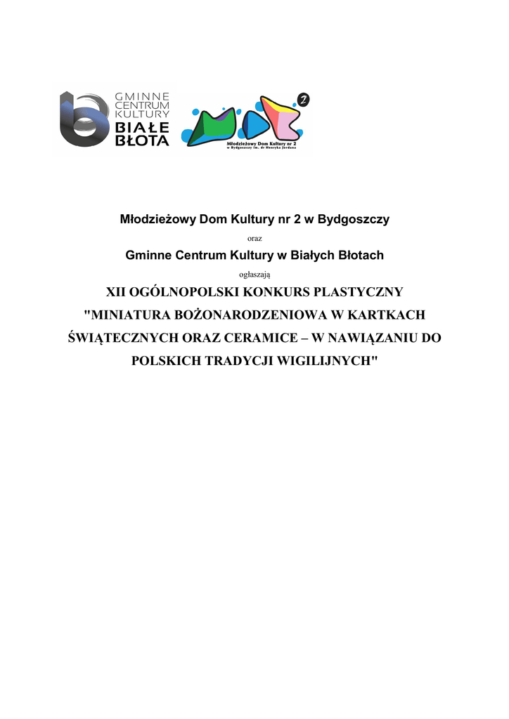 Młodzieżowy Dom Kultury nr 2 w Bydgoszczy oraz Gminne Centrum Kultury w Białych Błotach ogłaszają XII OGÓLNOPOLSKI KONKURS PLASTYCZNY "MINIATURA BOŻONARODZENIOWA W KARTKACH ŚWIĄTECZNYCH ORAZ CERAMICE – W NAWIĄZANIU DO POLSKICH TRADYCJI WIGILIJNYCH" ORGANIZATOR Młodzieżowy Dom Kultury nr 2 ul. St. Leszczyńskiego 42, 85-137 Bydgoszcz, tel. 52 373 17 95 [email protected], www.mdk2.bydgoszcz.pl WSPÓŁORGANIZATOR Gminne Centrum Kultury ul. Czysta 1a, 86-005 Białe Błota, tel. 668-106-965 [email protected] KOORDYNATOR DZIAŁAŃ KONKURSOWYCH Marlena Zabłocka – [email protected] CELE KONKURSU przybliżenie poprzez sztukę obrzędowości i tradycji Świąt Bożego Narodzenia, zachowanie tradycji ręcznego wykonywania kartek świątecznych oraz zainteresowanie oryginalnym łączeniem technik tradycyjnych np. z grafiką komputerową, rozwijanie zdolności, wrażliwości plastycznej i kreatywności u dzieci – poprzez eksperymentowanie z różnymi technikami plastycznymi, w tym własnymi, wymiana doświadczeń z zakresu zdobienia ceramiki, kształtowanie dyscypliny w pracach plastycznych poprzez realizację prac jako odpowiedzi na temat konkursowy, prezentacja kartek świątecznych wykonanych przez dzieci, młodzież oraz dorosłych z WTZ, prezentacja prac z ceramiki wykonanych przez dzieci, młodzież, dorosłych z WTZ oraz osób dorosłych zajmujących się ceramiką amatorsko, tworzenie prac oryginalnych i niepowtarzalnych. WARUNKI UCZESTNICTWA udział w konkursie oznacza akceptację regulaminu oraz zgodę na przeniesienie własności i praw autorskich na Organizatora oraz Współorganizatora konkursu, w tym zgodę na wykorzystywanie prac lub ich fragmentów do realizacji konkursu, każda nadesłana do Organizatora praca przechodzi na jego własność i nie podlega zwrotowi, przygotowanie prac zawierających elementy polskich tradycji wigilijnych np. ozdoby bożonarodzeniowe; choinka, stół wigilijny, obrzędy związane z obchodzeniem samej wigilii, świąt, szopki bożonarodzeniowe, pasterka, kolędnicy, itp.). DLA KARTEK ŚWIĄTECZNYCH: wykonanie kartek bożonarodzeniowych z motywami nawiązującymi do polskich tradycji wigilijnych, wielkość kartki złożonej: A6 oraz A5 (pozostałe rozmiary nie będą oceniane), tylko kartki składane, każdy uczestnik może wykonać jedną kartkę, technika dowolna płaska, w tym grafika komputerowa, bez prac wykonanych wyłącznie z kupnych, gotowych elementów i plasteliny, życzenia (nieobowiązkowo) na nieprzytwierdzonych kartkach bez imienia i nazwiska autora, do każdej kartki z tyłu należy trwale dołączyć wydrukowane drobnym drukiem na komputerze poniższe informacje: imię i nazwisko autora, wiek autora i klasa, nazwa, adres, e-mail i telefon placówki, imię i nazwisko nauczyciela, dołączenie do prac zbiorczej listy uczestników z podanym wiekiem i klasą oraz nazwą, adresem pocztowym placówki i nazwiskami nauczycieli (wg punktu powyżej). Mile widziane przesłanie zbiorczej listy uczestników także drogą mailową na adres koordynatora([email protected]). DLA CERAMIKI: wykonanie prac o tematyce "Misa wigilijna" jako forma przestrzenna, wykonanie pracy w formie płaskorzeźby-kafla, temat: „Ryba”, wielkość płaskorzeźby-kafla: około 15 cm x 15 cm, 15cm x 20 cm lub forma okrągła o średnicy do 20 cm, kafle powinny mieć dziurki umożliwiające ich zawieszenie, wielkość prac przestrzennych dowolna, każda praca musi być wypalona, każdy uczestnik może wykonać 2 prace np. misę i kafel, dwie misy, dwa kafle, każda z prac powinna być opisana indywidualnie według wzoru poniżej: imię i nazwisko autora, klasa i wiek autora, nazwa, adres, e-mail i telefon placówki, imię i nazwisko nauczyciela, dołączenie do prac zbiorczej listy uczestników z podanym wiekiem i klasą oraz nazwą, adresem pocztowym placówki i nazwiskami nauczycieli (wg punktu powyżej). Mile widziane przesłanie zbiorczej listy uczestników drogą mailową na adres koordynatora ([email protected]). KATEGORIE WIEKOWE Konkurs skierowany jest do uczniów przedszkoli, szkół podstawowych, gimnazjalnych, średnich oraz podopiecznych pracowni w placówkach kulturalno-oświatowych i Warsztatów Terapii Zajęciowej. Prace oceniane będą w pięciu kategoriach wiekowych: osobno kartki świąteczne i ceramika. Osoby niepełnosprawne będą oceniane razem z innymi uczestnikami, ale prosimy o podanie informacji o niepełnosprawności przy nazwisku na opisie pracy. W tym roku prace z ceramiki mogą również nadsyłać osoby dorosłe zajmujące się caramiką amatorsko. Dla laureatów przewidziano nagrody rzeczowe. Kartka świąteczna Przedszkole (0-6 lat) Klasy I-III (7-9 lat) Klasy IV-VI (10-12 lat) Gimnazjum (13-15 lat) Dorośli z WTZ Ceramika Klasy I-III (7-9 lat) Klasy IV-VI (10-12 lat) Gimnazjum (13-15 lat) Liceum (16-19 lat) Dorośli z WTZ oraz Dorośli amatorzy TERMIN DOSTARCZENIA PRAC (osobiście lub pocztą) UPŁYWA 24 listopada 2016. Prace nadesłane po tym terminie nie będą brały udziału w konkursie. NIE LICZY SIĘ DATA STEMPLA POCZTOWEGO, A TERMIN DOSTARCZENIA PRAC! na adres: Młodzieżowy Dom Kultury Nr 2 ul. St. Leszczyńskiego 42 85-137 Bydgoszcz z dopiskiem: „Konkurs plastyczny – Miniatura Bożonarodzeniowa” TERMIN ROZSTRZYGNIĘCIA KONKURSU I OTWARCIA WYSTAWY POKONKURSOWEJ 11 grudnia 2016 (niedziela), godz. 1600 MDK Nr 2, sala nr 2 godz. 1600 – wręczenie nagród i otwarcie wystawy godz. 1645 – sprzedaż kartek świątecznych oraz prac wykonanych z ceramiki INFORMACJE DODATKOWE Protokół pokonkursowy wraz z wynikami zostanie umieszczony na stronie internetowej Organizatora oraz Współorganizatora nie później niż na tydzień przed wernisażem. Nie wysyłamy informacji laureatom konkursu o przyznanych nagrodach, należy śledzić informacje umieszczane na podanych stronach internetowych Organizatora oraz Współorganizatora. W przypadku nieodebrania nagrody przyznanej w konkursie istnieje możliwość przesłani