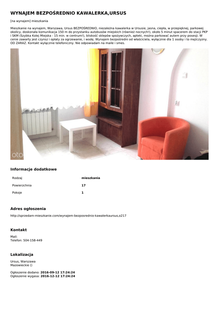WYNAJEM BEZPOŚREDNIO KAWALERKA,URSUS [na wynajem] mieszkania Mieszkanie na wynajem, Warszawa, Ursus BEZPOŚREDNIO, niezależna kawalerka w Ursusie, jasna, ciepła, w przepięknej, parkowej okolicy, doskonała komunikacja 150 m do przystanku autobusów miejskich (również nocnych!), około 5 minut spacerem do stacji PKP i SKM (Szybka Kolej Miejska - 15 min. w centrum!), bliskość sklepów spożywczych, apteki, można parkować autem przy posesji. W cenie zawarty jest czynsz i opłaty za ogrzewanie, i wodę. Wynajem bezpośredni od właściciela, wyłącznie dla 1 osoby i to mężczyzny. OD ZARAZ. Kontakt wyłącznie telefoniczny. Nie odpowiadam na maile i smes. Informacje dodatkowe Rodzaj mieszkania Powierzchnia 17 Pokoje 1 Adres ogłoszenia http://sprzedam-mieszkanie.com/wynajem-bezposrednio-kawalerkaursus,o217 Kontakt Mail: Telefon: 504-158-449 Lokalizacja Ursus, Warszawa Mazowieckie () Ogłoszenie dodano: 2016-09-12 17:24:24 Ogłoszenie wygasa: 2016-12-12 17:24:24 Powered by TCPDF (www.tcpdf.org)
