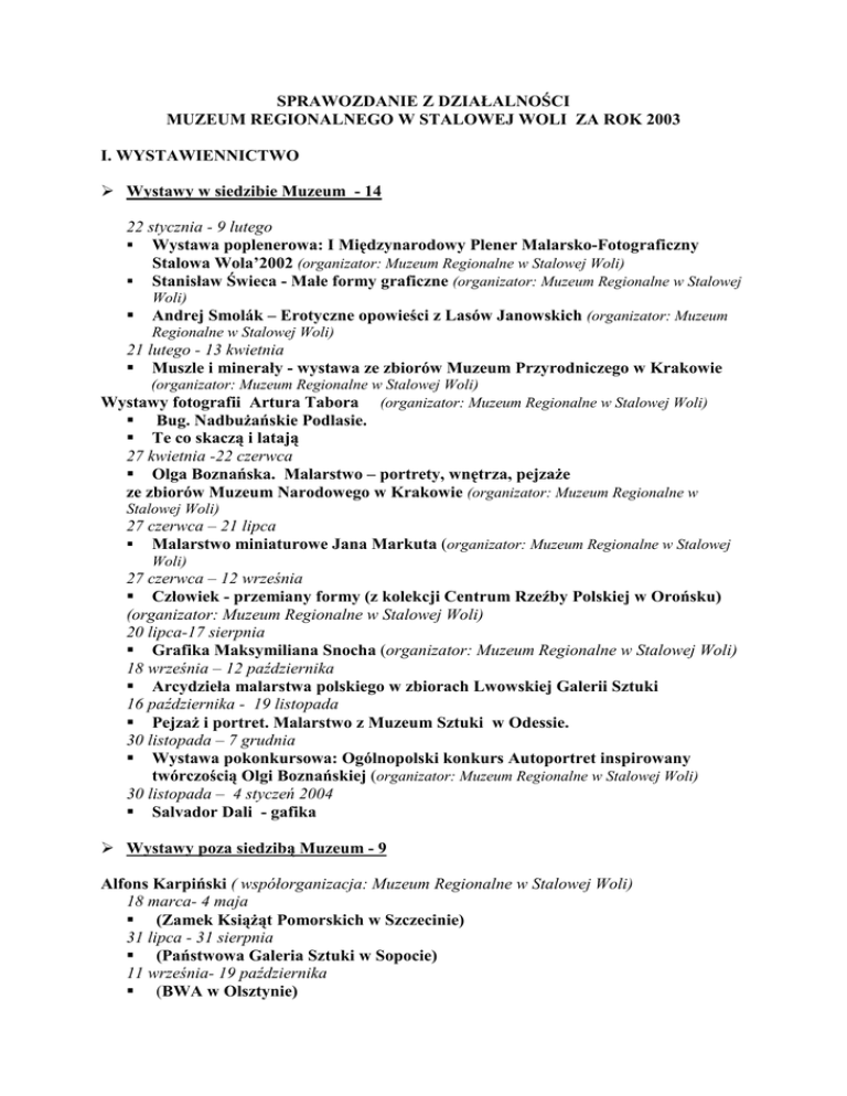 SPRAWOZDANIE Z DZIAŁALNOŚCI MUZEUM REGIONALNEGO W STALOWEJ WOLI ZA ROK 2003 I. WYSTAWIENNICTWO Wystawy w siedzibie Muzeum - 14 22 stycznia - 9 lutego Wystawa poplenerowa: I Międzynarodowy Plener Malarsko-Fotograficzny Stalowa Wola’2002 (organizator: Muzeum Regionalne w Stalowej Woli) Stanisław Świeca - Małe formy graficzne (organizator: Muzeum Regionalne w Stalowej Woli) Andrej Smolák – Erotyczne opowieści z Lasów Janowskich (organizator: Muzeum Regionalne w Stalowej Woli) 21 lutego - 13 kwietnia Muszle i minerały - wystawa ze zbiorów Muzeum Przyrodniczego w Krakowie (organizator: Muzeum Regionalne w Stalowej Woli) Wystawy fotografii Artura Tabora (organizator: Muzeum Regionalne w Stalowej Woli) Bug. NadbuŜańskie Podlasie. Te co skaczą i latają 27 kwietnia -22 czerwca Olga Boznańska. Malarstwo – portrety, wnętrza, pejzaŜe ze zbiorów Muzeum Narodowego w Krakowie (organizator: Muzeum Regionalne w Stalowej Woli) 27 czerwca – 21 lipca Malarstwo miniaturowe Jana Markuta (organizator: Muzeum Regionalne w Stalowej Woli) 27 czerwca – 12 września Człowiek - przemiany formy (z kolekcji Centrum Rzeźby Polskiej w Orońsku) (organizator: Muzeum Regionalne w Stalowej Woli) 20 lipca-17 sierpnia Grafika Maksymiliana Snocha (organizator: Muzeum Regionalne w Stalowej Woli) 18 września – 12 października Arcydzieła malarstwa polskiego w zbiorach Lwowskiej Galerii Sztuki 16 października - 19 listopada PejzaŜ i portret. Malarstwo z Muzeum Sztuki w Odessie. 30 listopada – 7 grudnia Wystawa pokonkursowa: Ogólnopolski konkurs Autoportret inspirowany twórczością Olgi Boznańskiej (organizator: Muzeum Regionalne w Stalowej Woli) 30 listopada – 4 styczeń 2004 Salvador Dali - gafika Wystawy poza siedzibą Muzeum - 9 Alfons Karpiński ( współorganizacja: Muzeum Regionalne w Stalowej Woli) 18 marca- 4 maja (Zamek KsiąŜąt Pomorskich w Szczecinie) 31 lipca - 31 sierpnia (Państwowa Galeria Sztuki w Sopocie) 11 września- 19 października (BWA w Olsztynie) 29 października – 31grudnia (Muzeum Okręgowe w Bydgoszczy) 8- 15 marca VII Złaz DruŜyn Harcerskich z okazji Dnia Myśli Braterskiej Wystawa: Nadsańskie klimaty - malarstwo (organizator: Muzeum Regionalne w Stalowej Woli) 4 – 6 kwietnia Promocja WyŜszej Szkoły Ekonomicznej w Stalowej Woli oraz gminy Zaleszany: Wystawy: (organizator: Muzeum Regionalne w Stalowej Woli) Zaleszańska sztuka ludowa Tkanina sizalowa – Iwona Katarzyna Jugo BagaŜ sentymentalny - rysunek Jadwigi Kukuły Złota nić – malarstwo Kazimiery Myk - Magdziak FREKWENCJA: Muzeum odwiedziło 20 500 osób, frekwencja na wystawach poza siedzibą Muzeum: 10 500 osób Razem: 30 100 osób PARTNERZY: Lwowskie Muzeum Historyczne WyŜsza Szkoła Ekonomiczna w Stalowej Woli Akademia Komercyjna we Lwowie WSPÓŁORGANIZATORZY WYSTAW Lwowska Galeria Sztuki (Ukraina) Muzeum Sztuki w Odessie (Ukraina) Galeria MIRO (Słowacja) Muzeum Przyrodnicze w Krakowie Muzeum Narodowe w Krakowie Centrum Rzeźby Polskiej w Orońsku Państwowa Galeria Sztuki w Sopocie Lep Art.Consulting II. KONKURSY Ogólnopolski konkurs Autoportret - inspirowany twórczością Olgi Boznańskiej dla uczniów i studentów szkół artystycznych - II edycja (na konkurs wpłynęło 699 prac, w tym 609 w kategorii szkół licealnych oraz 90 w kategorii uczelni wyŜszych) Moja przygoda w muzeum – eliminacje regionalne III. KONCERTY, POKAZY FILMOWE, SPOTKANIA AUTORSKIE Koncerty towarzyszące otwarciu wystaw: 20 maja - Chór Miejskiego Domu Kultury w Stalowej Woli 30 listopada - Polski Duet Gitarowy Pokazy filmowe i spotkania z autorami: 21 lutego – A. Tabor „Podlaski przełom Bugu” oraz „NadbuŜański Park Krajobrazowy” 27 kwietnia - P. Młyńczyk „Olga Boznańska” 20 maja - Spotkanie autorskie z Marią Rostworowską „Portret za mgłą. Opowieść o Oldze Boznańskiej” 29 czerwca -Promocja ksiąŜki Janusza Ciska Józef Piłsudski w Krakowie oraz dyskusja na temat: Porównanie norm Ŝycia publicznego II i III Rzeczypospolitej IV. SESJA ( współorganizacja) 14 czerwca - Transgraniczne targi artystyczne - sesja pn. Kultura polska i słowacka w relacjach z Europą V. DZIAŁALNOŚĆ WYDAWNICZA KSIĄśKI: S. Myszka „Radomyśl nad Sanem. Dzieje miasta i parafii” Rocznik Muzeum Regionalnego w Stalowej Woli. 2002-2003, nr 1/2 Przewodnik po powiecie stalowowolskim ( wydanie dwujęzyczne, polsko – angielskie) KATALOGI DO WYSTAW: I Międzynarodowy Plener Malarsko-Fotograficzny Stalowa Wola 2002 Stanisław Świeca - Małe formy graficzne Andrej Smolák - Erotyczne opowieści z Lasów Janowskich Muszle i minerały Olga Boznańska. Malarstwo – portrety, wnętrza, pejzaŜe Malarstwo miniaturowe Jana Markuta Grafika Maksymiliana Snocha Ogólnopolski konkurs inspirowany twórczością Olgi Boznańskiej FOLDERY: Fotografia Artura Tabora Człowiek - przemiany formy Muzeum Regionalne w Stalowej Woli ( w języku polskim i angielskim) VI. POZYSKIWANIE ZBIORÓW Prehistoria regionu – materiały z ratowniczych badań z Rudy Jastkowskiej Historia regionu- 73 Archiwum – 134 Archiwum fotograficzne - 20 Etnografia - 64 Sztuka - 56 DEPOZYTY: Prahistoria regionu: 77 Historia regionu: 92 Etnografia: 104 VII. BADANIA Ratownicze badania wykopaliskowe w Rudzie Jastkowskiej Nadsańskie kapliczki, krzyŜe i figury przydroŜne Sztuka ludowa i amatorska w regionie ( gmina Zaleszany) Ginące zawody – szewstwo (Rozwadów) VIII. UDOSTĘPNIANIE ZBIORÓW: materiały do prac licencjackich i magisterskich IX. DZIAŁALNOŚĆ EDUKACYJNA: Lekcje muzealne: 468 Ilość uczestników: 10 185 Trasy wycieczkowe o tematyce historycznej z przewodnikiem z muzeum: 6 Ilość uczestników: 156 X. PROJEKT REALIZOWANY W RAMACH PROGRAMU PHARE: Przyszłość wyrasta ze wspólnych korzeni (Projekt poświęcony osobie króla Jana III Sobieskiego) XI. INWESTYCJE: kontynuacja ogrodzenia terenu Muzeum od strony ul. Kopernika wykonanie projektu oraz instalacji elektrycznej ( zamontowanie oświetlenia zewnętrznego) montaŜ n