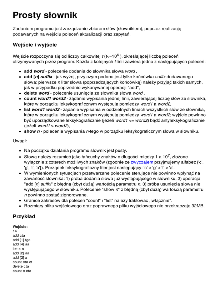Słowa należy rozumieć jako łańcuchy znaków o długości między 1 a 107, złożone