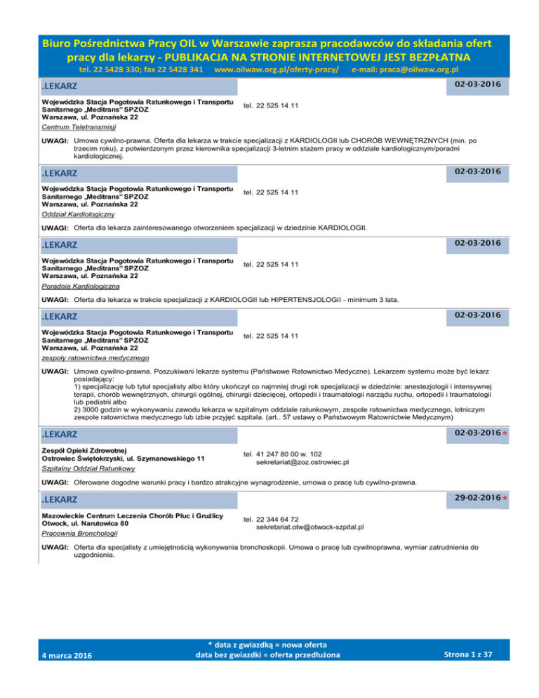 Biuro Pośrednictwa Pracy OIL w Warszawie zaprasza pracodawców do składania ofert pracy dla lekarzy - PUBLIKACJA NA STRONIE INTERNETOWEJ JEST BEZPŁATNA tel. 22 5428 330; fax 22 5428 341 www.oilwaw.org.pl/oferty-pracy/ e-mail: [email protected] 02-03-2016 .LEKARZ Wojewódzka Stacja Pogotowia Ratunkowego i Transportu Sanitarnego „Meditrans” SPZOZ Warszawa, ul. Poznańska 22 tel. 22 525 14 11 Centrum Teletransmisji UWAGI: Umowa cywilno-prawna. Oferta dla lekarza w trakcie specjalizacji z KARDIOLOGII lub CHORÓB WEWNĘTRZNYCH (min. po trzecim roku), z potwierdzonym przez kierownika specjalizacji 3-letnim stażem pracy w oddziale kardiologicznym/poradni kardiologicznej. 02-03-2016 .LEKARZ Wojewódzka Stacja Pogotowia Ratunkowego i Transportu Sanitarnego „Meditrans” SPZOZ Warszawa, ul. Poznańska 22 tel. 22 525 14 11 Oddział Kardiologiczny UWAGI: Oferta dla lekarza zainteresowanego otworzeniem specjalizacji w dziedzinie KARDIOLOGII. 02-03-2016 .LEKARZ Wojewódzka Stacja Pogotowia Ratunkowego i Transportu Sanitarnego „Meditrans” SPZOZ Warszawa, ul. Poznańska 22 tel. 22 525 14 11 Poradnia Kardiologiczna UWAGI: Oferta dla lekarza w trakcie specjalizacji z KARDIOLOGII lub HIPERTENSJOLOGII - minimum 3 lata. 02-03-2016 .LEKARZ Wojewódzka Stacja Pogotowia Ratunkowego i Transportu Sanitarnego „Meditrans” SPZOZ Warszawa, ul. Poznańska 22 tel. 22 525 14 11 zespoły ratownictwa medycznego UWAGI: Umowa cywilno-prawna. Poszukiwani lekarze systemu (Państwowe Ratownictwo Medyczne). Lekarzem systemu może być lekarz posiadający: 1) specjalizację lub tytuł specjalisty albo który ukończył co najmniej drugi rok specjalizacji w dziedzinie: anestezjologii i intensywnej terapii, chorób wewnętrznych, chirurgii ogólnej, chirurgii dziecięcej, ortopedii i traumatologii narządu ruchu, ortopedii i traumatologii lub pediatrii albo 2) 3000 godzin w wykonywaniu zawodu lekarza w szpitalnym oddziale ratunkowym, zespole ratownictwa medycznego, lotniczym zespole ratownictwa medycznego lub izbie przyjęć szpitala. (art.. 57 ustawy o Państwowym Ratownictwie Medycznym) .LEKARZ Zespół Opieki Zdrowotnej Ostrowiec Świętokrzyski, ul. Szymanowskiego 11 Szpitalny Oddział Ratunkowy 02-03-2016 * 29-02-2016 * tel. 41 247 80 00 w. 102 [email protected] UWAGI: Oferowane dogodne warunki pracy i bardzo atrakcyjne wynagrodzenie, umowa o pracę lub cywilno-prawna. .LEKARZ Mazowieckie Centrum Leczenia Chorób Płuc i Gruźlicy Otwock, ul. Narutowica 80 Pracownia Bronchologii tel. 22 344 64 72 [email protected] UWAGI: Oferta dla specjalisty z umiejętnością wykonywania bronchoskopii. Umowa o pracę lub cywilnoprawna, wymiar zatrudnienia do uzgodnienia. 4 marca 2016 * data z gwiazdką = nowa oferta data bez gwiazdki = oferta przedłużona Strona 1 z 37 Biuro Pośrednictwa Pracy OIL w Warszawie zaprasza pracodawców do składania ofert pracy dla lekarzy - PUBLIKACJA NA STRONIE INTERNETOWEJ JEST BEZPŁATNA tel. 22 5428 330; fax 22 5428 341 www.oilwaw.org.pl/oferty-pracy/ e-mail: [email protected] 24-02-2016 .LEKARZ Instytut "Pomnik - Centrum Zdrowia Dziecka" Warszawa, al. Dzieci Polskich 20 * tel. 22 815 16 35 [email protected] Zakład Medycyny Nuklearnej UWAGI: Pełny wymiar zatrudnienia, umowa na czas określony - stanowisko asystenta. Do zadań asystenta należał będzie nadzór nad badaniami scyntygraficznymi, ich opracowanie, interpretacja i opis. Wymagania: specjalizacja z medycyny nuklearnej ewentualnie w trakcie specjalizacji lub kandydaci chętni do rozpoczęcia specjalizacji z medycyny nuklearnej; znajomość języka angielskiego na poziomie dobrym; umiejętność obsługi urządzeń biurowych i pakietu MS Office; dobry kontakt z dziećmi; umiejętność współpracy w zespole. Oferujemy: zatrudnienie w prestiżowym szpitalu, będącym jednocześnie jednostką badawczą; możliwość zdobywania bogatego doświadczenia zawodowego w branży medycznej; przyjazną atmosferę pracy w zgranym zespole wysoko wykwalifikowanych specjalistów IPCZD; możliwość rozwoju kariery naukowej. 22-02-2016 .LEKARZ SZPZLO Praga Południe Warszawa, ul. Krypska 39 tel. 22 810 06 04 606 821 176 dyr. SZPZLO Hospicjum Domowe UWAGI: Etat - okres próbny, czas określony. Warunki wynagrodzenia do ustalenia. Oferta dla lekarza w trakcie specjalizacji w dziedzinie MEDYCYNY PALIATYWNEJ. 18-02-2016 .LEKARZ Powiatowe Centrum Zdrowia w Otwocku Sp. z o. o. Otwock, ul. Batorego 44 * tel. 22 778 26 10 Izba Przyjęć UWAGI: Forma i wymiar zatrudnienia do uzgodnienia. 12-02-2016 .LEKARZ Szpital Wojewódzki w Łomży Łomża, Al. Piłsudskiego 11 tel. 86 473 36 26 UWAGI: Oferta dla lekarzy chcących specjalizować się w dziedzinie: anestezjologii, rehabilitacji medycznej, neurologii lub radiologii (wolne miejsca specjalizacyjne). 10-02-2016 .LEKARZ Centralny Szpital Kliniczny MSW Warszawa, ul. Wołoska 137 * tel. 22 508 10 22 Klinika Chorób Wewnętrznych i Alergologii UWAGI: Oferta dla lekarza zainteresowanego rozpoczęciem specjalizacji w dziedzinie CHORÓB WEWNĘTRZNYCH lub ALERGOLOGII. Możliwość rozpoczęcia specjalizacji w stystemie modułowym. 10-02-2016 .LEKARZ Szpital Kolejowy w Pruszkowie Pruszków, ul. Warsztatowa 1 Izba Przyjęć tel. 22 770 93 02 [email protected] UWAGI: Poszukiwani lekarze specjaliści na dyżury w Izbie Przyjęć. Warunki zatrudnienia i umowa do uzgodnienia. 08-02-2016 .LEKARZ Szpital Specjalistyczny w Pile Piła, ul. Rydygiera 1 tel. 67 210 62 00 dyrektor 67 210 62 02 z-ca dyrektora 67 210 62 15 kadry [email protected] UWAGI: Szpital zatarudni: - lekarza na stanowisko kierownika Oddziału Chorób Wewnętrznych i Hematologii, - lekarzy w Oddziale Chorób Wewnętrznych i Hematologii. Warunki pracy i płacy do uzgodnienia. 4 marca 2016 * data z gwiazdką = nowa oferta data bez gwiazdki = oferta przedłużona Strona 2 z 37 * Biuro Pośrednictwa Pracy OIL w Warszawie zaprasza pracodawców do składania ofert pracy dla lekarzy - PUBLIKACJA NA STRONIE INTERNETOWEJ JEST BEZPŁATNA tel. 22 5428 330; fax 22