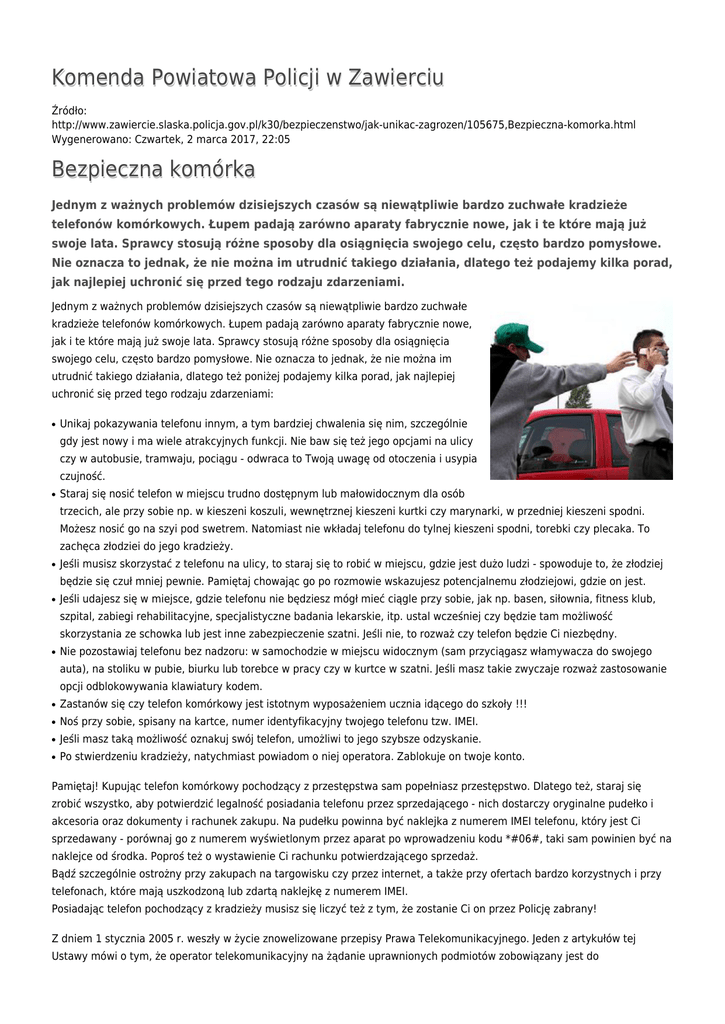 Komenda Powiatowa Policji w Zawierciu Źródło: http://www.zawiercie.slaska.policja.gov.pl/k30/bezpieczenstwo/jak-unikac-zagrozen/105675,Bezpieczna-komorka.html Wygenerowano: Czwartek, 2 marca 2017, 22:05 Bezpieczna komórka Jednym z ważnych problemów dzisiejszych czasów są niewątpliwie bardzo zuchwałe kradzieże telefonów komórkowych. Łupem padają zarówno aparaty fabrycznie nowe, jak i te które mają już swoje lata. Sprawcy stosują różne sposoby dla osiągnięcia swojego celu, często bardzo pomysłowe. Nie oznacza to jednak, że nie można im utrudnić takiego działania, dlatego też podajemy kilka porad, jak najlepiej uchronić się przed tego rodzaju zdarzeniami. Jednym z ważnych problemów dzisiejszych czasów są niewątpliwie bardzo zuchwałe kradzieże telefonów komórkowych. Łupem padają zarówno aparaty fabrycznie nowe, jak i te które mają już swoje lata. Sprawcy stosują różne sposoby dla osiągnięcia swojego celu, często bardzo pomysłowe. Nie oznacza to jednak, że nie można im utrudnić takiego działania, dlatego też poniżej podajemy kilka porad, jak najlepiej uchronić się przed tego rodzaju zdarzeniami: ● Unikaj pokazywania telefonu innym, a tym bardziej chwalenia się nim, szczególnie gdy jest nowy i ma wiele atrakcyjnych funkcji. Nie baw się też jego opcjami na ulicy czy w autobusie, tramwaju, pociągu - odwraca to Twoją uwagę od otoczenia i usypia czujność. ● Staraj się nosić telefon w miejscu trudno dostępnym lub małowidocznym dla osób trzecich, ale przy sobie np. w kieszeni koszuli, wewnętrznej kieszeni kurtki czy marynarki, w przedniej kieszeni spodni. Możesz nosić go na szyi pod swetrem. Natomiast nie wkładaj telefonu do tylnej kieszeni spodni, torebki czy plecaka. To zachęca złodziei do jego kradzieży. ● Jeśli musisz skorzystać z telefonu na ulicy, to staraj się to robić w miejscu, gdzie jest dużo ludzi - spowoduje to, że złodziej będzie się czuł mniej pewnie. Pamiętaj chowając go po rozmowie wskazujesz potencjalnemu złodziejowi, gdzie on jest. ● Jeśli udajesz się w miejsce, gdzie telefonu nie będziesz mógł mieć ciągle przy sobie, jak np. basen, siłownia, fitness klub, szpital, zabiegi rehabilitacyjne, specjalistyczne badania lekarskie, itp. ustal wcześniej czy będzie tam możliwość skorzystania ze schowka lub jest inne zabezpieczenie szatni. Jeśli nie, to rozważ czy telefon będzie Ci niezbędny. ● Nie pozostawiaj telefonu bez nadzoru: w samochodzie w miejscu widocznym (sam przyciągasz włamywacza do swojego auta), na stoliku w pubie, biurku lub torebce w pracy czy w kurtce w szatni. Jeśli masz takie zwyczaje rozważ zastosowanie opcji odblokowywania klawiatury kodem. ● Zastanów się czy telefon komórkowy jest istotnym wyposażeniem ucznia idącego do szkoły !!! ● Noś przy sobie, spisany na kartce, numer identyfikacyjny twojego telefonu tzw. IMEI. ● Jeśli masz taką możliwość oznakuj swój telefon, umożliwi to jego szybsze odzyskanie. ● Po stwierdzeniu kradzieży, natychmiast powiadom o niej operatora. Zablokuje on twoje konto. Pamiętaj! Kupując telefon komórkowy pochodzący z przestępstwa sam popełniasz przestępstwo. Dlatego też, staraj się zrobić wszystko, aby potwierdzić legalność posiadania telefonu przez sprzedającego - nich dostarczy oryginalne pudełko i akcesoria oraz dokumenty i rachunek zakupu. Na pudełku powinna być naklejka z numerem IMEI telefonu, który jest Ci sprzedawany - porównaj go z numerem wyświetlonym przez aparat po wprowadzeniu kodu *#06#, taki sam powinien być na naklejce od środka. Poproś też o wystawienie Ci rachunku potwierdzającego sprzedaż. Bądź szczególnie ostrożny przy zakupach na targowisku czy przez internet, a także przy ofertach bardzo korzystnych i przy telefonach, które mają uszkodzoną lub zdartą naklejkę z numerem IMEI. Posiadając telefon pochodzący z kradzieży musisz się liczyć też z tym, że zostanie Ci on przez Policję zabrany! Z dniem 1 stycznia 2005 r. weszły w życie znowelizowane przepisy Prawa Telekomunikacyjnego. Jeden z artykułów tej Ustawy mówi o tym, że operator telekomunikacyjny na żądanie uprawnionych podmiotów zobowiązany jest do niezwłocznego blokowania połączeń i uniemożliwienia użytkowania w jego sieci skradzionych telefonów. Informację o tym musi przekazać innym operatorom, aby ci uczynili to samo w swoich sieciach. Aby operator mógł jednak to zrobić, właściciel skradzionego telefonu musi dostarczyć zaświadczenie o kradzieży z policji oraz przedstawić numer identyfikacyjny - IMEI telefonu jak również dowód kupna, lub inne dokumenty identyfikujące właściciela. Policjanci zwalczający przestępczość kryminalną doskonale wiedzą o procederze zmiany numeru IMEI zablokowanych telefonów i przypominają o istnieniu art. 306 Kodeksu Karnego. Mówi on o odpowiedzialności karnej grożącej osobie, która usuwa, przerabia lub podrabia znaki identyfikacyjne urządzenia. Zagrożenie karą w takim przypadku może skończyć się nawet na 3 latach pozbawienia wolności. Osoby takie będą ścigane przez policjantów tak samo, jak złodzieje telefonów. Właściciele popularnych "komórek" powinni przechowywać ich dowody zakupu oraz dokumentację, gdzie zamieszczony jest m.in. marka, typ i numer IMEI, niezbędny do zablokowania aparatu. W przypadku jego braku, numer taki każdy właściciel telefonu może samodzielnie odczytać po wpisaniu odpowiedniej kombinacji znaków *#06# Należy unikać kupna telefonu z niewiadomego źródła, np. od przypadkowych osób, czy na różnego rodzaju giełdach, gdzie nie dostajemy żadnych dokumentów identyfikujących poprzedniego właściciela. W przypadku kupna kradzionego telefonu, nabywca naraża się na odpowiedzialność za paserstwo, za które grozi kara nawet do 2 lat pozbawienia wolności. Każda informacja dotycząca osób oferujących do sprzedaży telefony komórkowe niewiadomego pochodzeni