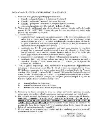 WYMAGANIA Z JĘZYKA ANGIELSKIEGO DLA KLAS I-III: 1. Uczeń na lekcji języka angielskiego powinien mieć: klasa I - podręcznik Treetops 1, ćwiczenia Treetops 1b klasa II - podręcznik Treetops 2, ćwiczenia Treetops 2 klasa III – podręcznik i ćwiczenia w jednym English Adventure 3 oraz zeszyt przedmiotowy (format A4 – jeden na 3 lata). 2. Ważne jest, aby każdy uczeń miał odpowiednio wyposażony piórnik w ołówek, kredki, gumkę, KLEJ i NOŻYCZKI. (Proszę od czasu do czasu sprawdzić, czy dzieci mają jeszcze klej, bo szybko się zużywa.) 3. Zadania domowe: uczniowie klas I mają zadawane zadania domowe tylko przed sprawdzianem; ich celem jest przygotowanie dzieci do testu - znajdują się one w końcowej części ćwiczeń; (może się zdarzyć, że dzieci będą kończyły zadania w domu, ale będzie to tylko uzupełnienie zadań wykonywanych podczas lekcji, których nie udało im się skończyć w wymaganym czasie pracy); uczniowie klas II i III mają regularnie zadawane prace domowe w zeszytach ćwiczeń lub w zeszytach przedmiotowych (może się zdarzyć, że dzieci które pracują szybciej, zdążą odrobić zadanie domowe podczas lekcji, w czasie gdy reszta grupy kończy ćwiczenia wykonywane podczas zajęć); prace domowe są regularnie sprawdzane, wybrane zadania mogą być ocenione; uczniowie, którzy nie odrobią zadania domowego lub nie przyniosą ćwiczeń z zadaniem, dostają ‘-‘; trzeci minus oznacza „C”, a ocena jest wpisywana do dzienniczka i dziennika; 4. Testy z języka angielskiego będą zapowiadane z tygodniowym wyprzedzeniem informacją w dzienniczku ucznia (klasy I i II) lub w zeszycie przedmiotowym (klasy III). Zakres wymaganego słownictwa można sprawdzić w podręcznikach: dla Treetops w dziale Word List (kl. I – strona 76; kl. II strony 87-88) oraz dla English Adventure w dziale Picture Dictionary (kl. III – strny 72-73) pod tytułem omawianego rozdziału. Sprawdzone prace uczniowie wklejają do zeszytów przedmiotowych i są one do Państwa wglądu. Z testów można uzyskać oceny: A B C materiał całkowicie opanowany materiał opanowany w stopniu dobrym materiał nie został przez ucznia przyswojony 5. Uczniowie są także oceniani za pracę na lekcji: aktywność, śpiewnie piosenek, recytowanie wierszyków, udział w grach oraz wykonywanie zadań indywidualnych. 6. Do zeszytów ćwiczeń są dołączone płyty z piosenkami z poszczególnych kursów. BARDZO PROSZĘ UMOŻLIWIĆ ODSŁUCHIWANIE TYCH PŁYT DZIECIOM W DOMU PODCZAS ZABAWY, ZASYPIANIA CZY INNYCH ZAJĘĆ RELAKSACYJNYCH. (Teksty piosenek można znaleźć na stronie 87 w podręczniku Song Lyrics (klasa I), 87 w ćwiczeniach Song Lyrics (klasa II) oraz na kolejnych stronach podręcznika (klasa III)). 7. Uczeń, który nie ma podczas lekcji książki, bądź jest nieobecny, powinien uzupełnić omawiane ćwiczenia w domu. Agnieszka Czaczyk nauczyciel języka angielskiego