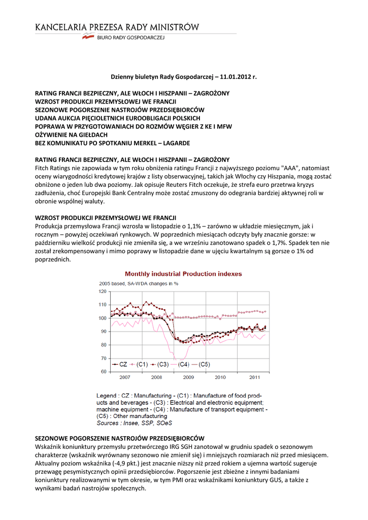 Dzienny biuletyn Rady Gospodarczej – 11.01.2012 r. RATING FRANCJI BEZPIECZNY, ALE WŁOCH I HISZPANII – ZAGROŻONY WZROST PRODUKCJI PRZEMYSŁOWEJ WE FRANCJI SEZONOWE POGORSZENIE NASTROJÓW PRZEDSIĘBIORCÓW UDANA AUKCJA PIĘCIOLETNICH EUROOBLIGACJI POLSKICH POPRAWA W PRZYGOTOWANIACH DO ROZMÓW WĘGIER Z KE I MFW OŻYWIENIE NA GIEŁDACH BEZ KOMUNIKATU PO SPOTKANIU MERKEL – LAGARDE RATING FRANCJI BEZPIECZNY, ALE WŁOCH I HISZPANII – ZAGROŻONY Fitch Ratings nie zapowiada w tym roku obniżenia ratingu Francji z najwyższego poziomu "AAA", natomiast oceny wiarygodności kredytowej krajów z listy obserwacyjnej, takich jak Włochy czy Hiszpania, mogą zostad obniżone o jeden lub dwa poziomy. Jak opisuje Reuters Fitch oczekuje, że strefa euro przetrwa kryzys zadłużenia, chod Europejski Bank Centralny może zostad zmuszony do odegrania bardziej aktywnej roli w obronie wspólnej waluty. WZROST PRODUKCJI PRZEMYSŁOWEJ WE FRANCJI Produkcja przemysłowa Francji wzrosła w listopadzie o 1,1% – zarówno w układzie miesięcznym, jak i rocznym – powyżej oczekiwao rynkowych. W poprzednich miesiącach odczyty były znacznie gorsze: w październiku wielkośd produkcji nie zmieniła się, a we wrześniu zanotowano spadek o 1,7%. Spadek ten nie został zrekompensowany i mimo poprawy w listopadzie dane w ujęciu kwartalnym są gorsze o 1% od poprzednich. SEZONOWE POGORSZENIE NASTROJÓW PRZEDSIĘBIORCÓW Wskaźnik koniunktury przemysłu przetwórczego IRG SGH zanotował w grudniu spadek o sezonowym charakterze (wskaźnik wyrównany sezonowo nie zmienił się) i mniejszych rozmiarach niż przed miesiącem. Aktualny poziom wskaźnika (-4,9 pkt.) jest znacznie niższy niż przed rokiem a ujemna wartośd sugeruje przewagę pesymistycznych opinii przedsiębiorców. Pogorszenie jest zbieżne z innymi badaniami koniunktury realizowanymi w tym okresie, w tym PMI oraz wskaźnikami koniunktury GUS, a także z wynikami badao nastrojów społecznych. UDANA AUKCJA PIĘCIOLETNICH EUROOBLIGACJI POLSKICH Na wtorkowym przetargu Ministerstwo Finansów sprzedało pięcioletnie obligacje o wartości 750 mln euro, przy popycie 1,3 mld euro i średniej rentowności 4,12%. Podczas pierwotnej emisji w marcu 2010 r. średnia rentownośd wyniosła 3,85%. Udana aukcja (dobry popyt i rentownośd poniżej zakładanej) miała korzystny wpływ na notowania złotego i obniżyła rynkowe rentowności polskich obligacji benchmarkowych. POPRAWA W PRZYGOTOWANIACH DO ROZMÓW WĘGIER Z KE I MFW Rząd Węgier w liście do KE zadeklarował gotowośd do ustępstw ws. kontrowersyjnego prawa o banku centralnym, co KE i MFW postawiły jako warunek pomocy finansowej. 20 stycznia w Brukseli w tej sprawie z węgierskim ministrem spotka się komisarz ds. walutowych. OŻYWIENIE NA GIEŁDACH Wczorajsza sesja przyniosła zdecydowane wzrosty europejskich indeksów giełdowych. DAX wzrósł o 2,4%, CAC40 o 2,7%. Pozytywne tendencje ominęły praktycznie jedynie giełdę grecką, co jest zapewne związane z umocnieniem przekonania o wychodzeniu amerykaoskiej gospodarki z fazy spowolnienia, spowodowanej korzystnymi danymi nadchodzącymi w ostatnich dniach zza Atlantyku. Wzmocniły one też korzystną wymowę niektórych z europejskich danych, w tym o wzroście produkcji we Francji oraz zapowiedzi Fitch utrzymania ratingu Francji na niezmienionym poziomie. Istotną rolę odgrywała dalsza poprawa nastrojów wokół Węgier – BUX zyskał 2,4% a forint kontynuował umacnianie się wobec głównych walut. Złoty poza poprawą atmosfery wokół Węgier wzmacniany był korzystnymi wynikami aukcji obligacji. Jednak handel w USA przyniósł spadek notowao euro, gdzie główna para walutowa EUR/USD o godzinie 18:30 osiągnęła minimum na poziomie 1.27629 USD. BEZ KOMUNIKATU PO SPOTKANIU MERKEL – LAGARDE Oświadczenie rzecznika rządu Niemiec ograniczyło się do stwierdzenia, że tematem wieczornych rozmów była między innymi „napięta sytuacja w Grecji i zbliżająca się Misji Trojki w Atenach”. Wcześniej szefowa MFW C. Lagarde rozmawiała z ministrem finansów i z ministrem gospodarki na temat „ratowania strefy euro i wdrożenia paktu fiskalnego”. Niemieccy dziennikarze podkreślają że „treśd rozmów nie została ujawniona”. Dziś szefowa MFW spotka się z prezydentem Francji. Przedstawiciele MFW, EBC i UE mają przyjechad do Aten 16 stycznia w celu ponownego skontrolowania dokumentów finansowych oraz przedsięwzięd oszczędnościowych. Rozmowy skupią się na nowym pakiecie ratunkowym w wysokości 130 mld euro finansowanym przez UE i MFW. Dziś: Decyzja RPP w sprawie stóp procentowych. KE przedstawi ocenę projektów budżetów na 2012 r. pięciu krajów objętych procedurą nadmiernego deficytu, w tym Polski; spotkanie Sarkozy – Lagarde, Niemcy – szacunki rocznej dynamiki PKB, Hiszpania – produkcja przemysłowa Dane: *12.01.12 Współpraca: Departament Analiz Strategicznych KPRM