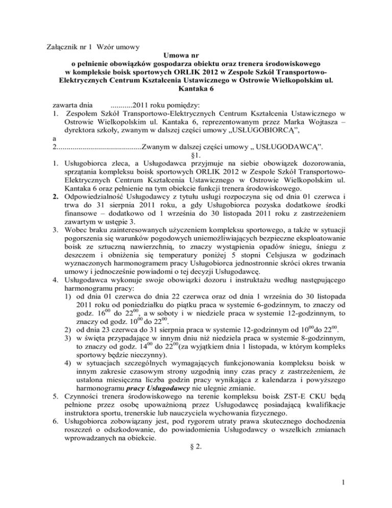 Załącznik nr 1 Wzór umowy Umowa nr o pełnienie obowiązków gospodarza obiektu oraz trenera środowiskowego w kompleksie boisk sportowych ORLIK 2012 w Zespole Szkół TransportowoElektrycznych Centrum Kształcenia Ustawicznego w Ostrowie Wielkopolskim ul. Kantaka 6 zawarta dnia ...........2011 roku pomiędzy: 1. Zespołem Szkół Transportowo-Elektrycznych Centrum Kształcenia Ustawicznego w Ostrowie Wielkopolskim ul. Kantaka 6, reprezentowanym przez Marka Wojtasza – dyrektora szkoły, zwanym w dalszej części umowy „USŁUGOBIORCĄ”, a 2...........................................Zwanym w dalszej części umowy „ USŁUGODAWCĄ”. §1. 1. Usługobiorca zleca, a Usługodawca przyjmuje na siebie obowiązek dozorowania, sprzątania kompleksu boisk sportowych ORLIK 2012 w Zespole Szkół TransportowoElektrycznych Centrum Kształcenia Ustawicznego w Ostrowie Wielkopolskim ul. Kantaka 6 oraz pełnienie na tym obiekcie funkcji trenera środowiskowego. 2. Odpowiedzialność Usługodawcy z tytułu usługi rozpoczyna się od dnia 01 czerwca i trwa do 31 sierpnia 2011 roku, a gdy Usługobiorca pozyska dodatkowe środki finansowe – dodatkowo od 1 września do 30 listopada 2011 roku z zastrzeżeniem zawartym w ustępie 3. 3. Wobec braku zainteresowanych użyczeniem kompleksu sportowego, a także w sytuacji pogorszenia się warunków pogodowych uniemożliwiających bezpieczne eksploatowanie boisk ze sztuczną nawierzchnią, to znaczy wystąpienia opadów śniegu, śniegu z deszczem i obniżenia się temperatury poniżej 5 stopni Celsjusza w godzinach wyznaczonych harmonogramem pracy Usługobiorca jednostronnie skróci okres trwania umowy i jednocześnie powiadomi o tej decyzji Usługodawcę. 4. Usługodawca wykonuje swoje obowiązki dozoru i instruktażu według następującego harmonogramu pracy: 1) od dnia 01 czerwca do dnia 22 czerwca oraz od dnia 1 września do 30 listopada 2011 roku od poniedziałku do piątku praca w systemie 6-godzinnym, to znaczy od godz. 1600 do 2200, a w soboty i w niedziele praca w systemie 12-godzinnym, to znaczy od godz. 1000 do 2200. 2) od dnia 23 czerwca do 31 sierpnia praca w systemie 12-godzinnym od 1000do 2200. 3) w święta przypadające w innym dniu niż niedziela praca w systemie 8-godzinnym, to znaczy od godz. 1400 do 2200(za wyjątkiem dnia 1 listopada, w którym kompleks sportowy będzie nieczynny). 4) w sytuacjach szczególnych wymagających funkcjonowania kompleksu boisk w innym zakresie czasowym strony uzgodnią inny czas pracy z zastrzeżeniem, że ustalona miesięczna liczba godzin pracy wynikająca z kalendarza i powyższego harmonogramu pracy Usługodawcy nie ulegnie zmianie. 5. Czynności trenera środowiskowego na terenie kompleksu boisk ZST-E CKU będą pełnione przez osobę upoważnioną przez Usługodawcę posiadającą kwalifikacje instruktora sportu, trenerskie lub nauczyciela wychowania fizycznego. 6. Usługobiorca zobowiązany jest, pod rygorem utraty prawa skutecznego dochodzenia roszczeń o odszkodowanie, do powiadomienia Usługodawcy o wszelkich zmianach wprowadzanych na obiekcie. § 2. 1 1. Za wynikające z niniejszej umowy wykonanie usługi strony ustalają wynagrodzenie w kwocie brutto .........zł (słownie:) za godzinę wykonanej usługi. 2. Usługodawca będzie wystawiał faktury do dnia ..... miesiąca następującego po miesiącu, za które ubiega się o wynagrodzenie. 3. Usługobiorca będzie realizował zapłatę przelewem na wskazany rachunek bankowy Usługodawcy, w terminie 7 dni licząc od dnia otrzymania prawidłowo wystawionej przez usługodawcę faktury. 4. Rachunek bankowy usługodawcy to:................................................................................... 5. Nieopłacenie należności za wykonaną usługę daje Usługodawcy podstawę do rozwiązania niniejszej umowy bez wypowiedzenia – ze skutkiem natychmiastowym i dochodzenia powstałej należności na drodze sądowej. 1. 2. 3. 4. 1. 2. 3. 4. 5. 6. § 3. Sposób i jakość wykonywania usług Usługobiorca kontroluje poprzez swoje służby nadzoru, upoważnionych przedstawicieli, mając zapewniony dostęp do prowadzonej przez Usługodawcę dokumentacji. Usługobiorca zobowiązany jest powiadomić Usługodawcę o każdym stwierdzonym przypadku niewłaściwego pełnienia obowiązków przez pracowników. Przyjęcie i zdanie obiektu przez pracownika, przy rozpoczęciu i zakończeniu pracy, odbywa się poprzez sprawdzenie zabezpieczenia i zamknięć ogrodzenia i pomieszczeń oraz stanu kłódek i zamków. Pracownik każdorazowo przyjęcie i przekazanie obiektu odnotowuje odpowiednim zapisem w odpowiednim zeszycie. Usługodawca zobowiązany jest najpóźniej w dniu podpisania umowy przekazać Usługobiorcy wykaz osób wraz z ich danymi, które będą wykonywać obowiązki wynikające z zakresu usługi, która jest przedmiotem niniejszej umowy, wraz z określeniem ich kwalifikacji. Usługodawca ma obowiązek każdorazowego aktualizowania wykazu, co najmniej na 24 godziny przed zmianą wykazu osób wykonujących dozór. § 4. W przyjętych przez Usługodawcę pod dozór obiekcie, podejmowane przez dozorujących działania i wykonywane czynności mają za zadanie ochronę powierzonego mienia przed kradzieżą, włamaniem oraz jego niszczeniem i dewastacją. Do obowiązków dozorującego należy również utrzymywanie w należytym porządku terenu kompleksu sportowego, w tym zaplecza socjalnego (szatni, toalet, natrysków, pomieszczenia gospodarza obiektu) urządzeń sportowych oraz podejmowanie działań informacyjnych i profilaktycznych w przypadku zagrożenia i niebezpieczeństwa powstania innych szkód, jak: zalanie pomieszczeń wodą, powstania pożaru itp. Do obowiązków Usługodawcy należy oszczędne gospodarowanie powierzonymi środkami czystości, energią elektryczną i wodą. Do obowiązków Usługodawcy należy prowadzenie instruktażu sportowego, organizacja imprez sportowych, użyczeń boisk i sprzętu sportowego poprzez obsługę osób 