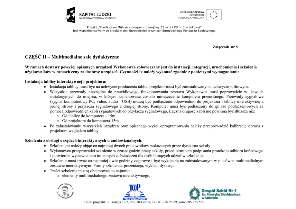 Projekt „Szkoła czyni Mistrza – program rozwojowy ZS nr 1 i ZS nr 3 w Łukowie” jest współfinansowany ze środków Unii Europejskiej w ramach Europejskiego Funduszu Społecznego Załącznik nr 5 CZĘŚĆ II – Multimedialne sale dydaktyczne W ramach dostawy powyżej opisanych urządzeń Wykonawca zobowiązany jest do instalacji, integracji, uruchomienia i szkolenia użytkowników w ramach ceny za dostawę urządzeń. Czynności te należy wykonać zgodnie z poniższymi wymaganiami: Instalacja tablicy interaktywnej i projektora: Instalacja tablicy musi być na uchwycie producenta tablic, projektor musi być zainstalowany na uchwycie sufitowym. Wszystkie przewody niezbędne do prawidłowego funkcjonowania zestawu Wykonawca musi poprowadzić w listwach instalacyjnych do miejsca, w którym zaplanowane zostało umieszczenie komputera przenośnego. Przewody sygnałowe (sygnał komputerowy PC, video, audio i USB) muszą być podłączone odpowiednio do projektora i tablicy interaktywnej z jednej strony i przyłącza sygnałowego z drugiej strony. Komputer musi być podłączony do gniazd podłączeniowych za pomocą odpowiednich kabli sygnałowych do przyłącza sygnałowego. Łączna długość kabli nie powinna być dłuższa niż: o Od tablicy do komputera - 15m o Od projektora do komputera 15m Po zainstalowaniu wszystkich urządzeń oraz opisanego wyżej oprogramowania należy przeprowadzić kalibrację obrazu z projektora względem tablicy. Szkolenia z obsługi urządzeń interaktywnych u audiowizualnych: Szkoleniem należy objąć co najmniej dwóch pracowników wskazanych przez dyrektora szkoły Wykonawca przeprowadzi szkolenie w czasie godzin pracy szkoły, przed terminem podpisania protokołu odbioru końcowego i potwierdzi wystawieniem imiennych zaświadczeń dla osób biorących udział w szkoleniu. Szkolenie musi trwać co najmniej dwie godziny zegarowe i być wykonane na zainstalowanym w placówce multimedialnym zestawie interaktywnym. Formy szkolenia: prezentacja, wykład, dyskusja. Treści szkolenia muszą obejmować co najmniej: o elementy multimedialnego zestawu interaktywnego, Biuro projektu: ul. 3-maja 12/2, 20-078 Lublin, Tel. 81 756 90 59, kom. 605 925 556 Projekt „Szkoła czyni Mistrza – program rozwojowy ZS nr 1 i ZS nr 3 w Łukowie” jest współfinansowany ze środków Unii Europejskiej w ramach Europejskiego Funduszu Społecznego o o o o sposób uruchomienie zestawu, sposób wykonania kalibracji tablicy, sposób obsługi wizualizera o zasady bezpiecznej pracy z zestawem prezentacyjnym. UWAGA: Gwarancja - Minimum 24 miesiące od daty podpisania protokołu odbioru bez zastrzeżeń Serwis - Wykonawca zapewni bezpłatny serwis na czas trwania gwarancji. Czas przystąpienia do naprawy nastąpi maksymalnie w ciągu 72h przy zgłoszeniu usterki faksem lub mailem. Naprawa nastąpi w miejscu użytkowania sprzętu, w przypadku konieczności wykonania naprawy poza miejscem użytkowania sprzętu Wykonawca zapewni na własny koszt odbiór sprzętu do naprawy i jego dostawę po dokonaniu naprawy oraz dostarczenie sprzętu zastępczego na czas naprawy. Miejsce dostawy: Zespół Szkół nr 3 im. Władysława Stanisława Reymonta w Łukowie, ul. Międzyrzecka 70, 21-400 Łuków Biuro projektu: ul. 3-maja 12/2, 20-078 Lublin, Tel. 81 756 90 59, kom. 605 925 556 Projekt „Szkoła czyni Mistrza – program rozwojowy ZS nr 1 i ZS nr 3 w Łukowie” jest współfinansowany ze środków Unii Europejskiej w ramach Europejskiego Funduszu Społecznego Lp. 1. Nazwa Ilość Tablica multimedialna 2 szt Parametry/warunki wymagane 1 Efektywna powierzchnia tablicy (obszar interaktywny), na której można dokonywać notatek, sterować pracą komputera i wyświetlać obraz z projektora min. 156.5 cm × 117.2 cm (przekątna min. 77 cali - 195.6 cm). 2 Format tablicy – 4 / 3 3 Waga – maksymalnie 24 kg 4 Powierzchnia tablicy twarda, odporna na uszkodzenia, dostosowana do projekcji i pisania po niej pisakami sucho ścieralnymi. Powierzchnia umożliwia również używanie magnesów w celu mocowania do jej powierzchni np. kartek (powierzchnia magnetyczna). 5 Technologia – podczerwieni, wielodotykowa. 6 Rozdzielczość tablicy nie mniej niż 32000 x 32000. 7 Komunikacja tablicy z komputerem i zasilanie – za pomocą przewodu USB. 8 Gwarancja producenta na tablicę – min 2 lata 9 Obsługa tablicy za pomocą załączonego pisaka i za pomocą palca. 10 Autoryzowany przez producenta tablicy serwis w Polsce, certyfikowany zgodnie z normą ISO 9001:2000 lub ISO 9001:2008 w zakresie urządzeń audiowizualnych. 11 Wraz z tablicą dostarczyć (w języku polskim) podręcznik użytkownika tablicy i przewodnik metodyczny dla nauczycieli dotyczący wykorzystywania tablicy w procesie dydaktycznym 12 Polska wersja językowa oprogramowania. 13 Możliwość wyświetlania dwóch slajdów (stron) jednocześnie np. w celu możliwości prezentacji treści zadania, danych, założeń i jego rozwiązania w przypadku gdy nie mieszczą się na jednej stronie. 14 Oprogramowanie do obsługi tablicy posiada własną przeglądarką internetową, którą można wstawić bezpośrednio do slajdu. Przenoszenie poprzez mechanizm przeciągnij i upuść grafiki oraz zaznaczonych fragmentów tekstów bezpośrednio z treści strony internetowej na slajd bez konieczności opuszczania okna z tym slajdem. Przeglądarka może automatycznie załadować wskazaną wcześniej przez użytkownika stronę po wyświetleniu slajdu z wstawioną Biuro projektu: ul. 3-maja 12/2, 20-078 Lublin, Tel. 81 756 90 59, kom. 605 925 556 Projekt „Szkoła czyni Mistrza – program rozwojowy ZS nr 1 i ZS nr 3 w Łukowie” jest współfinansowany ze środków Unii Europejskiej w ramach Europejskiego Funduszu Społecznego 15 przeglądarką. Możliwość pisania i rysowania po plikach PDF. Po naniesieniu notatek i rysunków możliwość zapisu całości do pliku PDF. 2 szt Rzutnik multimedialny 2. Parametry/ warunki wymagane: Jasność Rozdzielczo