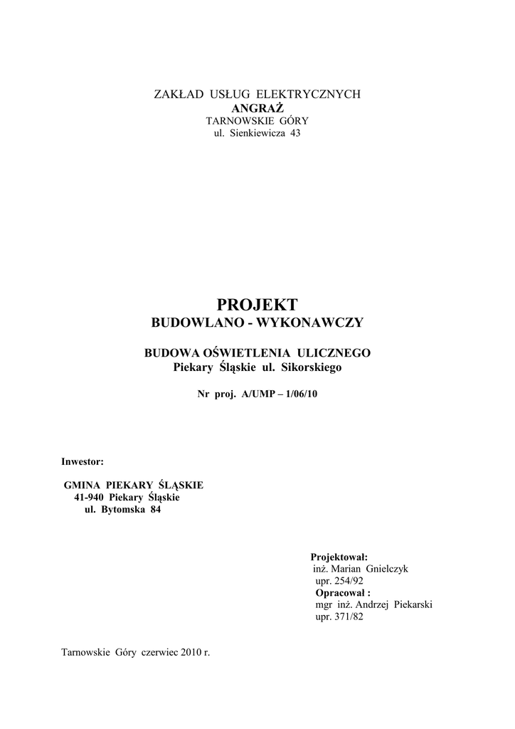 ZAKŁAD USŁUG ELEKTRYCZNYCH ANGRAś TARNOWSKIE GÓRY ul. Sienkiewicza 43 PROJEKT BUDOWLANO - WYKONAWCZY BUDOWA OŚWIETLENIA ULICZNEGO Piekary Śląskie ul. Sikorskiego Nr proj. A/UMP – 1/06/10 Inwestor: GMINA PIEKARY ŚLĄSKIE 41-940 Piekary Śląskie ul. Bytomska 84 Projektował: inŜ. Marian Gnielczyk upr. 254/92 Opracował : mgr inŜ. Andrzej Piekarski upr. 371/82 Tarnowskie Góry czerwiec 2010 r. -2- I. ZAWARTOŚĆ PROJEKTU. 1. 2. 3. 4. 5. Oświadczenie projektanta Kserokopia uprawnień projektanta 254/92 Kserokopia zaświadczenia o wpisie do ŚOIIB ( waŜne do 31.12.2010r. ) Sprawdzenie dokumentacji przez Vattenfall Gliwice. Warunki przyłączenia projektowanego oświetlenia ulicy Sikorskiego T/DJK/4205/2010 wydane przez Vattenfall Gliwice z dn. 23.04.2010r. 6. Opis techniczny. 7. Obliczenia techniczne. 8. Zestawienie materiałowe 9. Orientacja. 10. Projekt zagospodarowania terenu. Plan trasy oświetlenia. - rys. 1 11. Schemat ideowy oświetlenia - rys. 2 12. Uzgodnienie punktów osnowy geodezyjnej. 13. Opinia ZUD Gz.74420- 68/2010 z dnia 29.06.2010r. 14. Wypisy z ewidencji gruntów. 15. Zgody właścicieli gruntów. 16. Warunki prowadzenia robót w pasie drogowym wydane przez Referat Dróg Publicznych UM Piekary Śląskie. 17. Uzgodnienia branŜowe. 18. Obliczenia natęŜenia oświetlenia. 19. Informacja BIOZ. -3- OPIS TECHNICZNY 1. Opracowanie obejmuje projekt techniczny oświetlenia fragmentu ulicy Sikorskiego w Piekarach Śląskich - Dąbrówce Wielkiej. 2. Podstawa opracowania Projekt opracowano w oparciu o : zlecenie inwestora warunki przyłączenia oświetlenia ul. Sikorskliego T/DJK/4205/2010 , w Piekarach Śląskich z dnia 23.04.10 r wydane przez Vattenfall Gliwice. c) Miejscowy plan zagospodarowania przestrzennego Miasta Piekary Śląskie. d) wizję lokalną e) uzgodnienia z uŜytkownikami infrastruktury technicznej. f) uzgodnienia z właścicielami gruntów. g) obowiązujące przepisy i normy 3. Stan istniejącego oświetlenia ulicy Sikorskiego. W chwili obecnej ulica Sikorskiego nie posiada oświetlenia oświetlona na fragmencie od ulicy Dąbrówki do bloku nr 8. W poboczach ulicy Sikorskiego istnieją pozostałości po zdewastowanych słupach uprzednio istniejącego oświetlenia , które przewiduje się do demontaŜu. Rejon bloku nr 8 obecnie oświetlony jest oprawami zainstalowanymi na elewacji budynku. Po wykonaniu nowego oświetlenia w porozumieniu z administratorem bloku naleŜy je zdemontować. 4. Projektowane oświetlenie ulicy Sikorskiego Zgodnie z warunkami technicznymi przyłączenia oświetlenia zaprojektowano wybudowanie nowego odcinka oświetlenia od ulicy Dąbrówki do bloku nr 8. Plan projektowanej trasy oświetleniowej oraz rozmieszczenie ulicznych latarń przedstawiono na rysunku nr. 1. Zasilanie projektowanego oświetlenia naleŜy wykonać ziemną linią kablową YAKY 4 x 35 zasilając nowoprojektowany odcinek z nowoprojektowanej szafy oświetleniowej zasilanej ze złącza ZP1b wykonanego przez Vattenfall zgodnie z pkt 3a warunków przyłączenia. Dodatkowo końcówkę projektowanego oświetlenia przy ulicy Dąbrówki naleŜy połączyć mostkiem rezerwowym z istniejącym obwodem oświetleniowym ulicy Dąbrówki. Kabel ziemny układać na głębokości 0,8 m w podsypce piaskowej oraz przykryć folią ostrzegawczą koloru niebieskiego. W końcowych słupach oświetleniowych naleŜy wykonać uziemienia. Przejścia pod ulicami o nawierzchni asfaltowej wykonać metodą przewiertu. Dla oświetlenia zastosowano oprawy uliczne z wysokopręŜnymi lampami sodowymi SON-T + 100 W ( ul. Dąbrówki i główny ciąg ulicy Sikorskiego ) i 70W ( ul. Sikorskiego w rejonie bloku nr 8 i garaŜy ) w II klasie ochrony przeciwporaŜeniowej oraz IP > 54 i 5 – stopniowej regulacji odbłyśnika ( np. oprawa SGS Philips ) Projektowane oprawy zabudować na wysięgnikach na okrągłych , stalowych -4ocynkowanych słupach o wysokości zawieszenia lamp 8,3 m ( np. słup PIAST SENKO ). Proponuje się zastosowanie prefabrykowanych fundamentów pod słupy. Dzięki 5-stopniowej moŜliwości ustawienia odbłyśnika oraz wysięgników o kącie pochylenia 5 przy zaprojektowanym rozmieszczeniu słupów zostaje zachowana wymagana równomierność oświetlenia przy zachowaniu wymaganego poziomu natęŜenia oświetlenia. Pomiar zuŜycia energii w istniejącej szafie oświetleniowej pozostaje bez zmian. 5. Ochrona przeciwporaŜeniowa. Końcówkę nowowybudowanej sieci naleŜy uziemić. Jako system ochrony przeciwporaŜeniowej w sieci przewidziano zerowanie. Ze względu na zastosowanie opraw w II klasie ochrony lampy nie wymagają ochrony dodatkowej. Przed oddaniem wykonanej sieci do eksploatacji naleŜy wykonać pomiary stanu izolacji , oporności uziemień oraz skuteczności ochrony przeciwporaŜeniowej. 6. Ochrona przed korozją. Wszystkie stalowe konstrukcje i elementy naleŜy przed zabudowaniem ocynkować. 7. Uwagi dla wykonawcy. Przy wykonywaniu robót ziemnych naleŜy zastosować się do uwag zawartych w uzgodnieniach oraz zapewnić nadzór uŜytkowników istniejącego uzbrojenia. Przed wejściem w teren naleŜy uzyskać pozwolenie w Referacie Dróg Publicznych Wydziału Inwestycji i Remontów Urzędu Miejskiego Piekary Śląskie na zajęcie pasa drogowego oraz zastosować się do podanych warunków prowadzenia prac. Kolizje i zbliŜenia zabezpieczyć rurami osłonowymi zgodnie z obowiązującymi przepisami i normami budowy linii kablowych. 8. Postanowienia ogólne. Zgodnie z Rozporządzeniem Ministra Spraw Wewnętrznych i Administracji D.U. 126 Poz. 839 z dnia 24.09.1998 r. ustala się pierwszą kategorię geotechniczną projektowanego obiektu. Projektowana sieć oświetleniowa nie narusza istniejącej zieleni , nie wymagana więc jest jej inwentaryzacja. Projekt wykonano zgodnie z umową i jest on kompletny z punktu widzenia celu któremu ma słuŜyć. Odstępstwa podczas realizacji wymagają pisemnego uzgodnienia z projektantem zaś zmiany tras ponownych uzgodnień branŜowych i Z