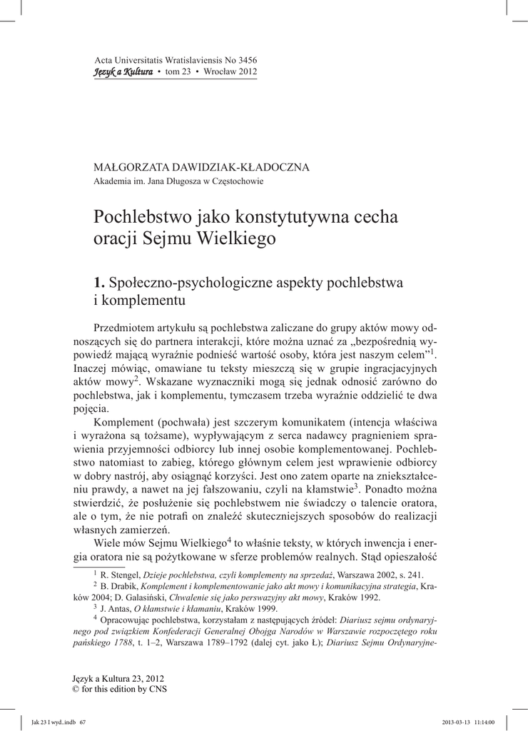 Acta Universitatis Pochlebstwo Wratislaviensis Nokonstytutywna 3456 jako cecha oracji Sejmu Wielkiego Jêzyk a Kultura • tom 23 • Wrocław 2012 67 MAŁGORZATA DAWIDZIAK-KŁADOCZNA Akademia im. Jana Długosza w Częstochowie Pochlebstwo jako konstytutywna cecha oracji Sejmu Wielkiego 1. Społeczno-psychologiczne aspekty pochlebstwa i komplementu Przedmiotem artykułu są pochlebstwa zaliczane do grupy aktów mowy odnoszących się do partnera interakcji, które można uznać za „bezpośrednią wypowiedź mającą wyraźnie podnieść wartość osoby, która jest naszym celem”1. Inaczej mówiąc, omawiane tu teksty mieszczą się w grupie ingracjacyjnych aktów mowy2. Wskazane wyznaczniki mogą się jednak odnosić zarówno do pochlebstwa, jak i komplementu, tymczasem trzeba wyraźnie oddzielić te dwa pojęcia. Komplement (pochwała) jest szczerym komunikatem (intencja właściwa i wyrażona są tożsame), wypływającym z serca nadawcy pragnieniem sprawienia przyjemności odbiorcy lub innej osobie komplementowanej. Pochlebstwo natomiast to zabieg, którego głównym celem jest wprawienie odbiorcy w dobry nastrój, aby osiągnąć korzyści. Jest ono zatem oparte na zniekształceniu prawdy, a nawet na jej fałszowaniu, czyli na kłamstwie3. Ponadto można stwierdzić, że posłużenie się pochlebstwem nie świadczy o talencie oratora, ale o tym, że nie potrafi on znaleźć skuteczniejszych sposobów do realizacji własnych zamierzeń. Wiele mów Sejmu Wielkiego4 to właśnie teksty, w których inwencja i energia oratora nie są pożytkowane w sferze problemów realnych. Stąd opieszałość 1 R. Stengel, Dzieje pochlebstwa, czyli komplementy na sprzedaż, Warszawa 2002, s. 241. Drabik, Komplement i komplementowanie jako akt mowy i komunikacyjna strategia, Kraków 2004; D. Galasiński, Chwalenie się jako perswazyjny akt mowy, Kraków 1992. 3 J. Antas, O kłamstwie i kłamaniu, Kraków 1999. 4 Opracowując pochlebstwa, korzystałam z następujących źródeł: Diariusz sejmu ordynaryjnego pod związkiem Konfederacji Generalnej Obojga Narodów w Warszawie rozpoczętego roku pańskiego 1788, t. 1–2, Warszawa 1789–1792 (dalej cyt. jako Ł); Diariusz Sejmu Ordynaryjne2 B. Język a Kultura 23, 2012 © for this edition by CNS Jak 23 I wyd..indb 67 2013-03-13 11:14:00 68 MAŁGORZATA DAWIDZIAK-KŁADOCZNA w pracach parlamentarnych, skupienie uwagi na formie wypowiedzi i kurtuazji, których jedną z konsekwencji jest stosowanie pochlebstw i komplementów. Kryterium, które decyduje o ich rozgraniczeniu, to jawność intencji. Głównym celem oratora werbalizującego komplement jest ‘sprawienie przyjemności osobie komplementowanej’ lub ‘oddanie należnej jej czci’. Wypowiedzi o takiej funkcji zdarzają się w mowach Sejmu Wielkiego, ale nie stanowią zbioru zbyt obszernego. Wszystkie pochlebstwa natomiast, choć występują jako autonomiczne akty mowy, są w rzeczywistości podporządkowane innym celom niż ‘sprawienie przyjemności odbiorcy’ albo przynajmniej intencja ta nie jest jedyna. Analiza pragmatyczna ich formy i funkcji stanie się przedmiotem niniejszego artykułu. 2. Wyrazy pochlebstwo, pochwała, komplementa w badanym materiale Wyraz pochlebstwo (podchlebstwo) pojawia się w analizowanych mowach, ale nigdy nie jest używany w odniesieniu do własnej wypowiedzi, co jest uzasadnione, zważywszy na konieczność ukrywania intencji przez nadawcę. Posługiwanie się takimi aktami mowy posłowie zauważają jednak u innych posłów, wyrażając tym samym sprzeciw, który świadczy o negatywnym wartościowaniu omawianego zjawiska i przeciwstawianiu intencji, jakie mu towarzyszą — szczerości5: go pod Związkiem Konfederacyi Generalnej Obojga Narodów w podwojonym Posłów Składzie Zgromadzonego w Warszawie od dnia 16 grudnia 1791 [sic!], t. 1, cz. 1–2, Warszawa 1791–1793 (dalej cyt. jako S); Diariusz Sejmu Czteroletniego, XML–Tei Edition encoded by Agnieszka Królczyk and Rafał T. Prinke, Biblioteka Kórnicka PAN, 2005, http://www.wbc.poznan.pl/dlibra/ publication/20152?tab=1 (dalej cyt. jako D). Po zacytowanych fragmentach pochodzących z wymienionych diariuszy w nawiasie podaję nazwisko mówcy, skrót odpowiadający diariuszowi stanowiącemu źródło tekstu oraz numer sesji sejmowej, podczas której został wygłoszony. Ponadto w cytowanych w tym artykule tekstach znajduje się fragment pochodzący z osobno wydanej mowy: Przymówienie się JW. Seweryna Potockiego […] na sessyi Sejmowej dnia 10. Września 1790 roku miane. Cytując fragmenty tego tekstu, podaję nazwisko mówcy i datę sesji sejmowej. 5 W XVIII-wiecznej polszczyźnie ogólnej wyrazy pochlebstwo oraz podchlebstwo i derywaty (pochlebca, podchlebca, pochlebnik, pochlebiacz, pochlebiać, podchlebiać) miały wyraźne negatywne nacechowanie. Świadczą o tym między innymi objaśnienia zawarte w słowniku Lindego: ‘Pochlebstwo jest fałszywe chwalenie, lubieżne w mowie przykrycie, łagodne błaganie uszu człowieczych’ oraz następujące połączenia językowe odnotowane przez wspomnianego leksykografa: podły, nikczemny pochlebca, zgraja pochlebców, szpetnie podchlebuje, a także przykłady użycia w zdaniach: „Pochlebnicy prawdy ci nie powiedzą”, „Pochlebstwo jest fałszywe chwalenie, lubieżne w mowie przykrycie”, „Pochlebstwo jako zwierciadło fałszywe”, „Różną twarz twych postępków tobie ukazuje”, „Pochlebstwo swemi ponęty zwodzi serca niebaczne”, „Pochlebstwo gorsze niż trucizna”, „Wolę gardło dać, niźliby tym, którzy imię święte bluźnią, miał pochlebować” (S.B. Linde, Słownik języka polskiego, Warszawa 1807–1814, t. 4, Język a Kultura 23, 2012 © for this edition by CNS Jak 23 I wyd..indb 68 2013-03-13 11:14:01 Pochlebstwo jako konstytutywna cecha oracji Sejmu Wielkiego 69 Gdy jednak, Miłościwy Panie! radząc o Ojczyźnie mojej, postanowiłem bardziej się nie podobać Tobie, niżeli usta skazić pochlebstwem albo być w uc