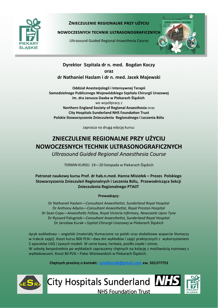 ZNIECZULENIE REGIONALNE PRZY UŻYCIU NOWOCZESNYCH TECHNIK ULTRASONOGRAFICZNYCH Ultrasound Guided Regional Anaesthesia Course Dyrektor Szpitala dr n. med. Bogdan Koczy oraz dr Nathaniel Haslam i dr n. med. Jacek Majewski Oddział Anestezjologii i Intensywnej Terapii Samodzielnego Publicznego Wojewódzkiego Szpitala Chirurgii Urazowej im. dra Janusza Daaba w Piekarach Śląskich we współpracy z Northern England Society of Regional Anaesthesia oraz City Hospitals Sunderland NHS Foundation Trust Polskie Stowarzyszenie Znieczulenia Regionalnego I Leczenia Bólu zaprasza na drugą edycję kursu: ZNIECZULENIE REGIONA REGIONALNE LNE PRZY UŻYCIU NOWOCZESNYCH TECHNIK ULTRASONOGRAFICZNYC ULTRASONOGRAFICZNYCH H Ultrasound Guided Regional Anaesthesia Course Ultrasound Guided Regional Anaesthesia Course TERMIN KURSU 19—20 listopada w Piekarach Śląskich Patronat naukowy kursu Prof. dr hab.n.med. Hanna Misiołek – Prezes Polskiego Stowarzyszenia Znieczuleń Regionalnych i Leczenia Bólu, Przewodnicząca Sekcji Znieczulenia Regionalnego PTAiIT Prowadzący: Dr Nathaniel Haslam—Consultant Anaesthetist, Sunderland Royal Hospital Dr Anthony Adams—Consultant Anaesthetist, Royal Preston Hospital Dr Sean Cope—Anaesthetic Fellow, Royal Victoria Infirmary, Newcastle Upon Tyne Dr Ryszard Palugniok—Consultant Anaesthetist, Sunderland Royal Hospital Dr Jarosław Kurak—Szpital Chirurgii Urazowej w Piekarach Śląskich Język wykładowy – angielski (materiały tłumaczone na polski oraz dodatkowe wsparcie tłumaczy w trakcie zajęć). Koszt kursu 800 PLN—dwa dni wykładów i zajęć praktycznych z wykorzystaniem 5 aparatów USG i żywych modeli. W cenie kawa, herbata, posiłki ciepłe i zimne. W sobotę bezpośrednio po wykładach zapraszamy chętnych na kolację z możliwością rozmowy z wykładowcami. Koszt 80 PLN – Pałac Wiśniewskich w Piekarach Śląskich. Chętnych prosimy o kontakt: [email protected] ew. 501377753