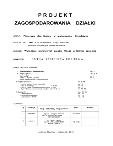PROJEKT ZAGOSPODAROWANIA Plenerowy plac fitness OBIEKT: DZIAŁKA NR: DZIAŁKI w miejscowości Orzechówka 1813 w m. Orzechówka, obręb Orzechówka, jednostka ewidencyjna Jasienica Rosielna Wykonanie plenerowych placów fitness w Gminie Jasienica ZADANIE: GMINA INWESTOR: JASIENICA ROSIELNA OPRACOWANIE ZAWIERA: 1. 2. Strona tytułowa i spis zawartości str. 1 Część opisowa str. 2 - 6 - Opis do PZT - Wypis z rejestru gruntów - Kopia zaktualizowanej mapy zasadniczej str. 7 str. 8 3. Część rysunkowa - str. 9 - 13 Strona tytułowa i spis rysunków Rys. 1 Orientacja 1:10 000 Rys. 2 Projekt zagospodarowania terenu 1 : 500 Rys. 3 Szkice proponowanych urządzeń siłowni fitness str. str. str. str. 4. Załączniki - strona tytułowa - uprawnienia budowlane - zaświadczenie POIIB 9 10 11 12 - 13 str. 14 - 16 str. 14 str. 15 str. 16 AUTORZY: Lp. Funkcja 1. Projektant 2. Asystent Imię i nazwisko, nr uprawnień mgr inŜ. Grzegorz Szabelski Upr. Nr UAN-2-8346-128/84 PDK/BO/0625/01 inŜ. Stefan Cwynar Upr. Nr ANB.V.7342-155/94 PDK/BD/1649/01 Data 10. 2013 r .10. 2013 r Jasienica Rosielna - październik 2013 r Podpis OPIS do projektu zagospodarow ania działki dla zadania: „Wykonanie plenerow ego placu fitness na działce nr 1813 w miejscow ości Orzechów ka” 1. PRZEDMIOT I CEL OPRACOWANIA Przedmiotem opracowania jest projekt budowy – wykonania plenerowego placu fitness na działce nr 1813 w miejscowości Orzechówka, gmina Jasienica Rosielna. Celem opracowania jest utworzenie plenerowego placu fitness – siłowni polowej wpływającej na zdrowie i wypoczynek mieszkańców, oraz na tworzenie moŜliwości kontaktów międzyludzkich w tym młodego pokolenia a takŜe na atrakcyjność i estetykę miejscowości . 2. PODSTAWA OPRACOWANIA Podstawą opracowania jest: 1. Umowa z Inwestorem. 2. Mapa zasadnicza z aktualnym stanem sytuacyjno –wysokościowym w skali 1 : 500 3. Pomiary w terenie 4. Obowiązujące normy i przepisy związane. 3. PRZEDMIOT INWESTYCJI Przedmiotem inwestycji jest: 1. Roboty przygotowawcze; roboty pomiarowe; 2. MontaŜ urządzeń fitness; 2.1. Urządzenie NORDIC WALKING 2.2. Urządzenie WYPYCHACZ – PRZYCIĄGACZ 2.3. Urządzenie BIODERKA 2.4. Urządzenie MOTYL – MOTYL 2.5. Urządzenie NARCIARZ 2.6. Urządzenie CHODZIK 3. Monitoring placu kpl. szt. szt. szt. szt. szt. szt. stanowisko 1, 1, 1, 1, 1, 1. 1 1 4. ISTNIEJĄCY STAN ZAGOSPODAROWANIA DZIAŁKI. 4.1. Zagospodarowanie otoczenia działki. Działka opracowania o numerze w ewidencji gruntów połoŜona jest w miejscowości 1813 , Orzechówka będąca przedmiotem niniejszego przy drodze gminnej Nr 115822R Orzechówka – Góra I, która stanowi bezpośrednie połączenie z drogą powiatową Nr 2030R Brzezianka - Orzechówka – Stara Wieś. Działka nr 1813 jest w większości zabudowana, centralnie nawierzchnią bitumiczną, od północnej strony graniczy z rowem melioracyjnym, południowej graniczy z działkami strony południowej natomiast od strony północno-wschodniej oraz zabudowanymi budynkami mieszkalnymi wolnostojącymi. Od działki znajduje się ogrodzony plac zabaw. Ogrodzenie obejmuje równieŜ wolną powierzchnię zieloną, na której planuje się plac fitness. Na terenie działki znajduje się gazociąg g65. Uzbrojenie to nie koliduje w planowanej budowie placu fitness. Działka posiada bezpośredni dostęp do drogi gminnej poprzez istniejący zjazd z rur φ 50 Przy granicy działki znajduje się zieleń wysoka – rząd drzew iglastych - świerki 4.2. Zestawienie powierzchni działki - istniejące - 2 Powierzchnia całkowita działki 4 400 m Powierzchnia zabudowy - utwardzenie placu – nawierzchnia bitumiczna na miejsca postojowe dla samochodów osobowych - teren placu zabaw - rów odwadniający - pozostałe powierzchnie zielone 4.3. Zakres rozbiórek Nie dotyczy. 5 PROJEKTOWANE ZAGOSPODAROWANIE TERENU . 5.1. Zestawienie powierzchni działki - projektowane 2 2 264,50 m 2 1 530,50 m 2 155,00 m 2 450,00 m Projektowany plenerowy plac fitness lokalizuje się , przy istniejącym placu zabaw, działce nr 1813, mającej bezpośrednie połączenie na z drogą gminną Orzechówka – Góra I, a która z kolei łączy się z drogą powiatową Brzezianka - Orzechówka – Stara Wieś. - 2 Powierzchnia całkowita działki 4 400 m Powierzchnia zabudowy - utwardzenie placu – nawierzchnia bitumiczna na miejsca postojowe 2 dla samochodów osobowych 2 264,50 m 2 - teren placu zabaw 1 530,50 m 2 - rów odwadniający 155,00 m 2 - pozostałe powierzchnie zielone 247,00 m 2 - projektowany plenerowy plac fitness 203,00 m 5.2. Zakres wykonywanych robót obejmuje: 5.2.1. Roboty przygotowawcze - roboty pomiarowe, 5.2.2. Roboty rozbiórkowe wg pkt 4.3. 5.2.3. Roboty montaŜowe Na roboty montaŜowe składać się będą: - wykopy i betonowanie punktowych fundamentów betonowych z zabetonowaniem części stalowych urządzeń, - montaŜ urządzeń fitness – siłowni polowej tj. 1. Urządzenie NORDIC WALKING szt. 1, 2. Urządzenie WYPYCHACZ – PRZYCIĄGACZ szt. 1, 3. Urządzenie BIODERKA szt. 1, 4. Urządzenie MOTYL – MOTYL szt. 1, 5. Urządzenie NARCIARZ szt. 1, 6. Urządzenie CHODZIK szt. 1. - wykonanie monitoringu placu fitness - instalowanie stanowiska szt. 1. 5.2.4. Zieleń w obrębie projektowanej działki. Zieleń w obrębie projektowanej działki - bez zmian. 5.2.5. Odwodnienie . Odwodnienie powierzchniowe działki zapewnione zostało poprzez spadek poprzeczny i podłuŜny placu, z którego woda deszczowa spływać będzie do istniejących rowów odwadniających. 5.2.6. Urządzenia obce Projektowana inwestycja nie przewiduje przebudowy istniejących podziemnych i nadziemnych urządzeń obcych. Uzbrojenie podziemne . - gazociąg g65 Uwaga ! Wszelkie wynikającymi roboty budowlane naleŜy prowadzić zgodnie ze zobowiązaniami z ustawy z dnia 7 lipca 1994 r Prawo budowlane ( t. jedn. Dz. U. z 2010r Nr 243, poz. 1623). Przy wykonywaniu robót ziemnych w obrębie urządzeń obcych (zwłaszcza wykopów) prace naleŜy wyko