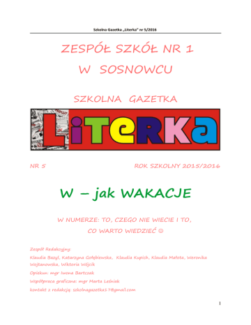 Szkolna Gazetka „Literka” nr 5/2016 ZESPÓŁ SZKÓŁ NR 1 W SOSNOWCU SZKOLNA GAZETKA NR 5 ROK SZKOLNY 2015/2016 W – jak WAKACJE W NUMERZE: TO, CZEGO NIE WIECIE I TO, CO WARTO WIEDZIEĆ Zespół Redakcyjny: Klaudia Bazyl, Katarzyna Gołębiewska, Klaudia Kupich, Klaudia Małota, Weronika Wojtanowska, Wiktoria Wójcik Opiekun: mgr Iwona Bartczak Współpraca graficzna: mgr Marta Leśniak kontakt z redakcją: [email protected] 1 Szkolna Gazetka „Literka” nr 5/2016 Wakacje !!! Najpiękniejszy czas w życiu ucznia!!! W tym roku wyjątkowo długi, bo już od 24 czerwca , aż do 1 września, jedynym zmartwieniem będzie to, jak miło i przyjemnie spędzić wolny czas. 2 Szkolna Gazetka „Literka” nr 5/2016 Może skorzystacie z naszych propozycji? Naszą wspólną propozycją na spędzenie czasu wakacyjnego jest wycieczka nad morze. Wiele osób twierdzi, że pobyt nad polskim morzem jest po prostu przereklamowany, jednak trzeba przyznać że ma ono wiele zalet. Między innymi są to właściwości lecznicze. Nadmorski klimat bardzo dobrze wpływa na nasze zdrowie i odporność. Trzeba jednak pamiętać ,że pobyt powinien trwać co najmniej 2 tygodnie, aby nasz organizm mógł z niego korzystać. Kolejną zaletą polskiego Morza Bałtyckiego są stragany, budki z przeróżnymi smakołykami, odgłosy brzdąkających cymbergrajów. Jednak najlepiej nad morzem smakują świderki ''kręcone do nieba'' które wszyscy uwielbiają. 3 Szkolna Gazetka „Literka” nr 5/2016 Według nas najlepszą miejscowością na spędzenie wakacji jest Sopot. Jest on położony na Pobrzeżu Gdańskim, pomiędzy Gdańskiem i Gdynią, z którymi tworzy Trójmiasto. Jest miastem uzdrowiskowym. Odpoczywając w Sopocie najwspanialszym miejscem jest plaża, która jest jedną z najlepiej utrzymanych nad Zatoką Gdańską. W tej wspaniałej miejscowości możemy rownież podziwiać niesmaowite Molo, które jest jednym z najpopularniejszych polskich obiektów rekreacyjno-imprezowych. Warto też również zwiedzić ''Krzywy Domek'' który jest najdziwniejszą budowlą świata, ''Muszla Koncertowa'', ''Planetarium'', ''Opera Leśna'', ''Park Wodny'' oraz ''Latarnia Morska''. To była nasza wspólna propozycja na spędzenie czasu wakacyjnego. Do zobaczenia nad morzem! Weronika Wojtanowska i Wiktoria Wójcik z klasy II a gim 4 Szkolna Gazetka „Literka” nr 5/2016 Moją propozycją spędzenia wolnego wakacyjnego czasu jest wycieczka... na rowerze. Dobrze, ale dlaczego akurat rower? Otóż dzięki niemu możemy zadbać o sylwetkę, zdrowie (ma pozytywny wpływ na układ krążenia i oddechowy) i kondycję. Pedałowanie nie jest dużym wysiłkiem , dzięki czemu możemy wybierać się na długie dystanse i przy okazji przejażdżki mamy okazję poznawać i zwiedzać okolicę oraz polepszać swoją orientację w terenie (zwłaszcza udając się w nowe trasy). 5 Szkolna Gazetka „Literka” nr 5/2016 Dla wielu ludzi, (w tym dla mnie) jazda na rowerze jest sposobem na zabicie czasu, odreagowanie stresu, rozrywkę, spędzenie miłych chwil z koleżankami, ucieczkę od problemów (czasem też i od obowiązków) oraz jest szansą na ogólny "reset". Dodatkowo po paru godzinach jeżdżenia można zauważyć zmniejszenie problemu z zasypianiem w nocy. Moim jedynym "problemem" jest to, że opalam się w czasie jazdy, a raczej nie ja, lecz mój zegarek Przejdźmy do praktyki: co warto zawsze mieć przy sobie i czego dopilnować by być bezpiecznym w drodze? Przede wszystkim należy dopilnować odpowiedniego wyposażenia roweru- rower musi posiadać światła pozycyjne- z przodu białe, z tyłu czerwone oraz czerwony odblask z tyłu ; przydatny jest też dzwonek. Należy również upewnić się czy koła są napompowane, hamulce sprawne, łańcuch naoliwiony i czy siodełko jest dobrze ustawione. Należy też pamiętać o kasku i odblaskach na elementach garderoby. Najlepszym wyjściem jest zabranie ze sobą plecaka, w którym weźmiemy potrzebne rzeczy, takie jak: coś do picia,, klucze czy telefon, narzędzia na wszelki wypadek (multinarzędzia rowerowe można kupić np. w Decathlonie) czy bluzę albo płaszcz przeciwdeszczowy (przy niepewnej pogodzie). Przydatną rzeczą jest również nawigacja w telefonie; nieraz uratowała mnie w czasie dalszych podróży, gdy nie wiedziałam ,jak trafić do celu. Jeśli ktoś ma problemy ze stawami, to polecam zaopatrzyć się w opaski neoprenowe, szczególnie na nadgarstki i kolana. Skoro wiemy już dlaczego warto uprawiać kolarstwo i jak przygotować się na wycieczkę to czas na zastanowienie się gdzie w ogóle można udać się na dwóch kółkach. Możliwości jest wiele. Ja preferuję poszukiwanie nowych tras, głównie do centrów sąsiadujących z Sosnowcem miast, ponieważ z nich łatwo jest się dostać w każde miejsce i zazwyczaj nieopodal nich znajdują się najciekawsze obiekty. Na pewno warto jest udać się nad najbliższe zbiorniki wodne, np. nad Stawiki, Morawę, Hubertusa albo Pogorię. Godne uwagi są również szlaki rowerowe w Sosnowcu, Dąbrowie Górniczej i Katowicach. Jednak 6 Szkolna Gazetka „Literka” nr 5/2016 moimi ulubionymi miejscami wycieczek jednośladem są centrum Będzina (szczególnie brzeg Czarnej Przemszy) oraz Park Grabek w Czeladzi, gdzie gorąco zapraszam czytelników. Zachęcam również do odwiedzenia Katowic, Siemianowic Śląskich, Chorzowa, Dąbrowy Górniczej czy Jaworzna oraz do odkrywania nowych dróg i poznawania ciekawych miejsc w czasie pogodnych i wolnych od obowiązków dni lata. Do zobaczenia na trasie! Klaudia Bazyl z klasy II a gim A jak Wy planujecie spędzić tegoroczne wakacje ? Napiszcie nam, gdzie byliście i co ciekawego zobaczyliście. Fotki mile widziane !!! Na autorów najciekawszych prac czekają nagrody niespodzianki A tymczasem Zespół Redakcyjny życzy naszym czytelnikom. Wspaniałych i Bezpiecznych Wakacji !!! Do zobaczenia w nowym roku szkolnym !!! 7