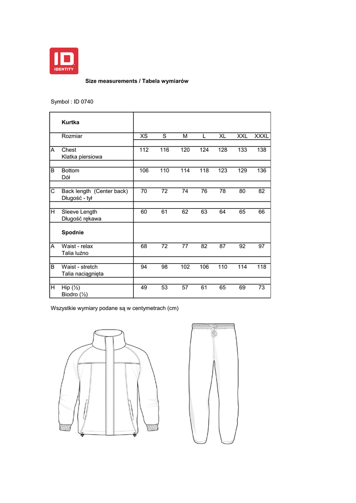 Size measurements / Tabela wymiarów Symbol : ID 0740 Kurtka Rozmiar XS S M L XL XXL XXXL A Chest Klatka piersiowa 112 116 120 124 128 133 138 B Bottom Dół 106 110 114 118 123 129 136 C Back length (Center back) Długość - tył 70 72 74 76 78 80 82 H Sleeve Length Długość rękawa 60 61 62 63 64 65 66 Spodnie A Waist - relax Talia luźno 68 72 77 82 87 92 97 B Waist - stretch Talia naciągnięta 94 98 102 106 110 114 118 H Hip (½) Biodro (½) 49 53 57 61 65 69 73 Wszystkie wymiary podane są w centymetrach (cm)