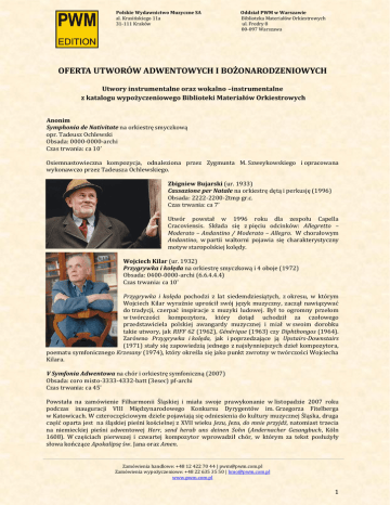 Polskie Wydawnictwo Muzyczne SA al. Krasińskiego 11a 31-111 Kraków Oddział PWM w Warszawie Biblioteka Materiałów Orkiestrowych ul. Fredry 8 00-097 Warszawa OFERTA UTWORÓW ADWENTOWYCH I BOŻONARODZENIOWYCH Utwory instrumentalne oraz wokalno –instrumentalne z katalogu wypożyczeniowego Biblioteki Materiałów Orkiestrowych Anonim Symphonia de Nativitate na orkiestrę smyczkową opr. Tadeusz Ochlewski Obsada: 0000-0000-archi Czas trwania: ca 10’ Osiemnastowieczna kompozycja, odnaleziona przez Zygmunta M. Szweykowskiego i opracowana wykonawczo przez Tadeusza Ochlewskiego. Zbigniew Bujarski (ur. 1933) Cassazione per Natale na orkiestrę dętą i perkusję (1996) Obsada: 2222-2200-2tmp gr.c. Czas trwania: ca 7’ Utwór powstał w 1996 roku dla zespołu Capella Cracoviensis. Składa się z pięciu odcinków: Allegretto – Moderato – Andantino / Moderato – Allegro. W chorałowym Andantino, w partii waltorni pojawia się charakterystyczny motyw staropolskiej kolędy. Wojciech Kilar (ur. 1932) Przygrywka i kolęda na orkiestrę smyczkową i 4 oboje (1972) Obsada: 0400-0000-archi (6.6.4.4.4) Czas trwania: ca 10' Przygrywka i kolęda pochodzi z lat siedemdziesiątych, z okresu, w którym Wojciech Kilar wyraźnie uprościł swój język muzyczny, zaczął nawiązywać do tradycji, czerpać inspiracje z muzyki ludowej. Był to ogromny przełom w twórczości kompozytora, który dotąd uchodził za czołowego przedstawiciela polskiej awangardy muzycznej i miał w swoim dorobku takie utwory, jak RIFF 62 (1962), Générique (1963) czy Diphthongos (1964). Zarówno Przygrywka i kolęda, jak i poprzedzające ją Upstairs-Downstairs (1971) stały się zapowiedzią jednego z najsłynniejszych dzieł kompozytora, poematu symfonicznego Krzesany (1974), który określa się jako punkt zwrotny w twórczości Wojciecha Kilara. V Symfonia Adwentowa na chór i orkiestrę symfoniczną (2007) Obsada: coro misto-3333-4332-batt (3esec) pf-archi Czas trwania: ca 45' Powstała na zamówienie Filharmonii Śląskiej i miała swoje prawykonanie w listopadzie 2007 roku podczas inauguracji VIII Międzynarodowego Konkursu Dyrygentów im. Grzegorza Fitelberga w Katowicach. W czteroczęściowym dziele pojawiają się odniesienia do kultury muzycznej Śląska, druga część oparta jest na śląskiej pieśni kościelnej z XVII wieku Jezu, Jezu, do mnie przyjdź, natomiast trzecia na niemieckiej pieśni adwentowej Herr, send herab uns deinen Sohn (Andernacher Gesangbuch, Köln 1608). W częściach pierwszej i czwartej kompozytor wprowadził chór, w którym za tekst posłużyły słowa kończące Apokalipsę św. Jana oraz Amen. Zamówienia handlowe: +48 12 422 70 44 | [email protected] Zamówienia wypożyczeniowe: +48 22 635 35 50 | [email protected] www.pwm.com.pl 1 Polskie Wydawnictwo Muzyczne SA al. Krasińskiego 11a 31-111 Kraków Oddział PWM w Warszawie Biblioteka Materiałów Orkiestrowych ul. Fredry 8 00-097 Warszawa Józef Kobierkowicz (XVIII w.) Pastorella Natalitia (Caelum gaude) na sopran, bas, dwoje skrzypiec, wiolonczelę i organy opr. Zygmunt Maria Szweykowski Obsada: S B soli-0000-0000-org-archi (2.2.0.1.0) Czas trwania: ca 7' Jest to jedna z dwunastu zachowanych pastorelli Kobierkowicza, polskiego kompozytora, który w latach 1731-1735 sprawował funkcję organisty u paulinów na Jasnej Górze w Częstochowie. Utwór został nagrany przez Zespół Muzyki Dawnej Kapela Jasnogórska pod dyrekcją Jana Tomasza Adamusa (wyd. Musicon, 2005). Witold Lutosławski (1913-1994) Dwadzieścia polskich kolęd na sopran, chór żeński unisono i orkiestrę Obsada: S solo-coro femminile ad unisono-1121-2110-batt (1esec) cel ar pf-archi (8.7.6.5.4) Czas trwania: ca 50’ Kolędy Lutosławskiego zdecydowanie wykraczają poza krąg środków techniki kompozytorskiej, charakterystycznej dla utworów tego typu. Choć ich melodie zostały zaczerpnięte z tradycyjnych śpiewników M. M. Mioduszewskiego oraz ze zbiorów O. Kolberga, nie są i nie mogły być pomyślane jako utwory do wykonywania domowego. Są to w całym tego słowa znaczeniu utwory koncertowe. [Jan Stęszewski] Jan Adam Maklakiewicz (1899-1954) Kolędy na chór mieszany i orkiestrę Obsada: coro misto-3333-4331-batt (3esec) ar-archi Czas trwania: ca 40' Zbiór jedenastu kolęd w opracowaniu Jana Adama Maklakiewicza. Sam autor miał do polskich kolęd szczególny stosunek, jak mówił od słów proboszczowych, w dzieciństwie zasłyszanych, od tych śpiewów w kościele dzwoniących, zrodziło się w sercu na zawsze uwielbienie, umiłowanie kolęd. Całe ich piękno z tych dni dzieciństwa zabrałem ze sobą w życie. Przez nie nauczyłem się kochać wszystko, co polskie, bo nigdy, tak po polsku, żadną modlitwą nie wymodli się Polak, jak w kolędach. Tradycyjna, lecz ciekawa harmonia zastosowana przez Maklakiewicza wpłynęła na dużą popularność zbioru, część z nich została nagrana przez Chór Akademicki Katolickiego Uniwersytetu Lubelskiego pod dyrekcją Grzegorza Pecki (wyd. Fanfara, 2002/2008). Jan Oleszkowicz (ur. 1947) Pastorałki polskie na chór mieszany, flety, kontrabasy i perkusję (1971) Obsada: coro misto-6(fl a becco)000-0000-batt (3esec)-archi (0.0.0.0.3) Czas trwania: ca 15' Zbiór pastorałek do tekstu Jerzego Harasymowicza na chór mieszany (z recytacją), flety proste, kontrabas i instrumenty perkusyjne: bębenek baskijski, triangel, kastaniety, tam-tam. Składa się z dwóch części, obejmujących pastorałki: Rodowód, Narodzenie, Pastyrze, Z gór i Z królami. Michał Orłowski (2. poł. XVIII w.) Pastorella in G Obsada: 2 ob, 2fg, 2 cor, 2 tr Czas trwania: ca 3’ Zamówienia handlowe: +48 12 422 70 44 | [email protected] Zamówienia wypożyczeniowe: +48 22 635 35 50 | [email protected] www.pwm.com.pl 2 Polskie Wydawnictwo Muzyczne SA al. Krasińskiego 11a 31-111 Kraków Oddział PWM w Warszawie Biblioteka Materiałów Orkiestrowych ul. Fredry 8 00-097 Warszawa Krótki utwór na zespół instrumentów dętych, rodzaj 