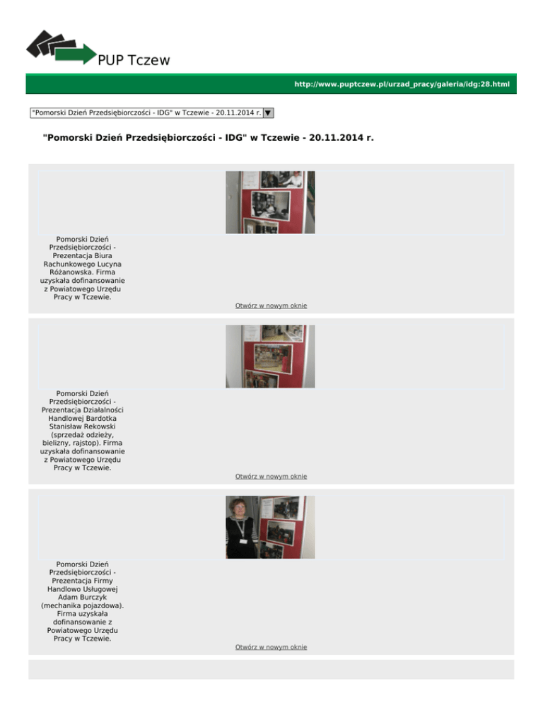 PUP Tczew http://www.puptczew.pl/urzad_pracy/galeria/idg:28.html "Pomorski Dzień Przedsiębiorczości - IDG" w Tczewie - 20.11.2014 r. ▼ "Pomorski Dzień Przedsiębiorczości - IDG" w Tczewie - 20.11.2014 r. Pomorski Dzień Przedsiębiorczości Prezentacja Biura Rachunkowego Lucyna Różanowska. Firma uzyskała dofinansowanie z Powiatowego Urzędu Pracy w Tczewie. Otwórz w nowym oknie Pomorski Dzień Przedsiębiorczości Prezentacja Działalności Handlowej Bardotka Stanisław Rekowski (sprzedaż odzieży, bielizny, rajstop). Firma uzyskała dofinansowanie z Powiatowego Urzędu Pracy w Tczewie. Otwórz w nowym oknie Pomorski Dzień Przedsiębiorczości Prezentacja Firmy Handlowo Usługowej Adam Burczyk (mechanika pojazdowa). Firma uzyskała dofinansowanie z Powiatowego Urzędu Pracy w Tczewie. Otwórz w nowym oknie Pomorski Dzień Przedsiębiorczości Prezentacja Kwiaciarni Ławeczka Anna Okoniewska. Firma uzyskała dofinansowanie z Powiatowego Urzędu Pracy w Tczewie. Otwórz w nowym oknie Pomorski Dzień Przedsiębiorczości Prezentacja Studia Fryzur Marcin Szuta. Firma uzyskała dofinansowanie z Powiatowego Urzędu Pracy w Tczewie. Otwórz w nowym oknie Pomorski Dzień Przedsiębiorczości Prezentacja Studia Fryzur Natalia Eich. Firma uzyskała dofinansowanie z Powiatowego Urzędu Pracy w Tczewie. Otwórz w nowym oknie Pomorski Dzień Przedsiębiorczości Prezentacja usług krawieckich Górny Anna Górna. Firma uzyskała dofinansowanie z Powiatowego Urzędu Pracy w Tczewie. Otwórz w nowym oknie Pomorski Dzień Przedsiębiorczości Stanowiska Urzędu Skarbowego (z lewej) i Urzędu Statystycznego (z prawej). Otwórz w nowym oknie Pomorski Dzień Przedsiębiorczości Stanowiska Urzędu Skarbowego (z lewej) oraz Urzędu Statystycznego (z prawej). Otwórz w nowym oknie Pomorski Dzień Przedsiębiorczości Stanowisko Kancelarii Prawnej Radcy Prawnego. Otwórz w nowym oknie Pomorski Dzień Przedsiębiorczości Stanowisko Powiatowego Urzędu Pracy w Tczewie, przy którym były udzielane informacje na temat dotacji na rozpoczęcie działalności gospodarczej dla osób bezrobotnych oraz refundacji dla pracodawców. Otwórz w nowym oknie Pomorski Dzień Przedsiębiorczości Stanowisko Powiatowego Urzędu Pracy w Tczewie. Otwórz w nowym oknie Pomorski Dzień Przedsiębiorczości Stanowisko Starostwa Powiatowego w Tczewie, przy którym można było uzyskać informacje na temat uzyskania środków z PFRON. Otwórz w nowym oknie Pomorski Dzień Przedsiębiorczości Stanowisko Urzędu Miejskiego w Tczewie, przy którym informacji udzielał pracownik merytoryczny z Domu Przedsiębiorcy w Tczewie. W tle widać stanowisko Urzędu Skarbowego w Tczewie. Otwórz w nowym oknie Pomorski Dzień Przedsiębiorczości Stanowisko Urzędu Miejskiego w Tczewie, przy którym udzielane były informacje na temat ewidencji działalności gospodarczej. Otwórz w nowym oknie Pomorski Dzień Przedsiębiorczości Stanowisko Urzędu Skarbowego w Tczewie. Otwórz w nowym oknie Pomorski Dzień Przedsiębiorczości Stanowisko Urzędu Statystycznego, przy którym udzielane były informacje m.in. na temat REGON. Otwórz w nowym oknie Pomorski Dzień Przedsiębiorczości Stanowisko Urzędu Statystycznego. Otwórz w nowym oknie Pomorski Dzień Przedsiębiorczości Stanowisko Urzędu Statystycznego. Otwórz w nowym oknie Pomorski Dzień Przedsiębiorczości Widok ogólny na salę. Na pierwszym planie widać stanowisko Urzędu Miejskiego, dalej Urzędu Skarbowego, a po prawej stronie Urzędu Statystycznego. Otwórz w nowym oknie