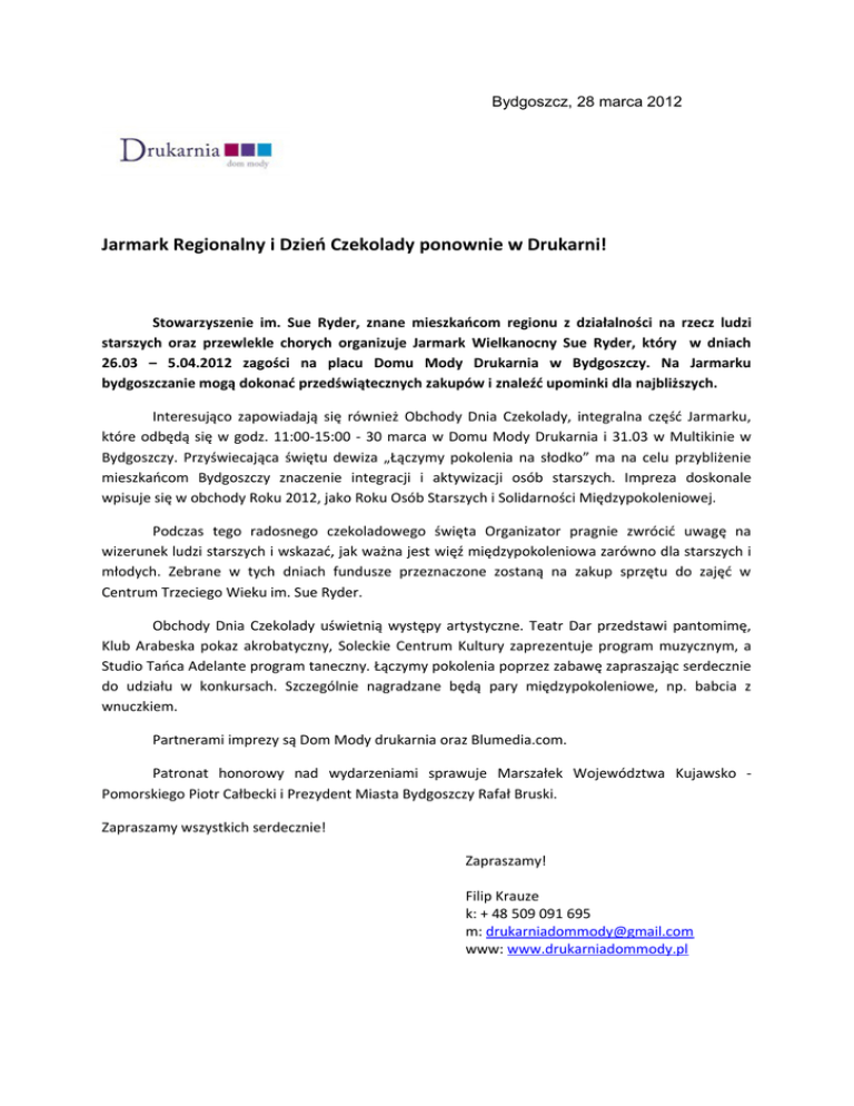 Bydgoszcz, 28 marca 2012 Jarmark Regionalny i Dzień Czekolady ponownie w Drukarni! Stowarzyszenie im. Sue Ryder, znane mieszkańcom regionu z działalności na rzecz ludzi starszych oraz przewlekle chorych organizuje Jarmark Wielkanocny Sue Ryder, który w dniach 26.03 – 5.04.2012 zagości na placu Domu Mody Drukarnia w Bydgoszczy. Na Jarmarku bydgoszczanie mogą dokonać przedświątecznych zakupów i znaleźć upominki dla najbliższych. Interesująco zapowiadają się również Obchody Dnia Czekolady, integralna część Jarmarku, które odbędą się w godz. 11:00-15:00 - 30 marca w Domu Mody Drukarnia i 31.03 w Multikinie w Bydgoszczy. Przyświecająca świętu dewiza „Łączymy pokolenia na słodko” ma na celu przybliżenie mieszkańcom Bydgoszczy znaczenie integracji i aktywizacji osób starszych. Impreza doskonale wpisuje się w obchody Roku 2012, jako Roku Osób Starszych i Solidarności Międzypokoleniowej. Podczas tego radosnego czekoladowego święta Organizator pragnie zwrócić uwagę na wizerunek ludzi starszych i wskazać, jak ważna jest więź międzypokoleniowa zarówno dla starszych i młodych. Zebrane w tych dniach fundusze przeznaczone zostaną na zakup sprzętu do zajęć w Centrum Trzeciego Wieku im. Sue Ryder. Obchody Dnia Czekolady uświetnią występy artystyczne. Teatr Dar przedstawi pantomimę, Klub Arabeska pokaz akrobatyczny, Soleckie Centrum Kultury zaprezentuje program muzycznym, a Studio Tańca Adelante program taneczny. Łączymy pokolenia poprzez zabawę zapraszając serdecznie do udziału w konkursach. Szczególnie nagradzane będą pary międzypokoleniowe, np. babcia z wnuczkiem. Partnerami imprezy są Dom Mody drukarnia oraz Blumedia.com. Patronat honorowy nad wydarzeniami sprawuje Marszałek Województwa Kujawsko Pomorskiego Piotr Całbecki i Prezydent Miasta Bydgoszczy Rafał Bruski. Zapraszamy wszystkich serdecznie! Zapraszamy! Filip Krauze k: + 48 509 091 695 m: [email protected] www: www.drukarniadommody.pl