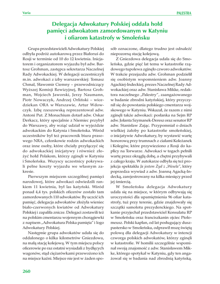 PALESTRA Varia Delegacja Adwokatury Polskiej oddała hołd pamięci adwokatom zamordowanym w Katyniu i ofiarom katastrofy w Smoleńsku Grupa przedstawicieli Adwokatury Polskiej odbyła podróż autokarową przez Białoruś do Rosji w terminie od 10 do 12 kwietnia. Inicjatorem i organizatorem wyjazdu był adw. Bartosz Grohman, zastępca sekretarza Naczelnej Rady Adwokackiej. W delegacji uczestniczyli m.in. adwokaci z izby warszawskiej: Tomasz Chmal, Sławomir Ciemny – przewodniczący Wyższej Komisji Rewizyjnej, Bartosz Grohman, Wojciech Jaworski, Jerzy Naumann, Piotr Nowaczyk, Andrzej Orliński – wicedziekan ORA w Warszawie, Artur Wdowczyk. Izbę rzeszowską reprezentował adw. Antoni Put. Z Monachium dotarł adw. Oskar Derkacz, który specjalnie z Niemiec przybył do Warszawy, aby wziąć udział w wyjeździe adwokackim do Katynia i Smoleńska. Wśród uczestników był też pracownik biura prasowego NRA, członkowie rodzin adwokackich oraz inne osoby, które chciały przyłączyć się do adwokackiej inicjatywy i również złożyć hołd Polakom, którzy zginęli w Katyniu i Smoleńsku. Wszyscy uczestnicy pokrywali pełne koszty wyjazdu we własnym zakresie. Pierwszym miejscem szczególnej pamięci narodowej, które adwokaci odwiedzili rankiem 11 kwietnia, był las katyński. Wśród ponad 4,4 tys. polskich oficerów zostało tam zamordowanych 110 adwokatów. By uczcić ich pamięć, delegacja adwokatów złożyła wieniec biało-czerwonych kwiatów od Adwokatury Polskiej i zapaliła znicze. Delegaci zostawili też na polskim cmentarzu wojennym chorągiewki z napisem „Adwokatura Polska pamięta” i logo Adwokatury Polskiej. Następnie grupa adwokatów udała się do oddalonego o kilka kilometrów Gniezdowa, na małą stację kolejową. W tym miejscu polscy oficerowie po raz ostatni wysiadali z bydlęcych wagonów, stąd ciężarówkami przewożono ich na miejsce kaźni. Miejsce nie jest w żaden spo- 260 sób oznaczone, dlatego trudno jest odnaleźć niepozorną stację kolejową. Z Gniezdowa delegacja udała się do Smoleńska, gdzie pięć lat temu w katastrofie rządowego tupolewa zginęło czworo adwokatów. W trakcie przejazdu adw. Grohman podzielił się osobistym wspomnieniem adw. Joanny Agackiej-Indeckiej, prezes Naczelnej Rady Adwokackiej oraz adw. Stanisława Mikke, redaktora naczelnego „Palestry”, zaangażowanego w badanie zbrodni katyńskiej, który przyczynił się do powstania polskiego cmentarza wojskowego w Katyniu. Wskazał, że razem z nimi zginęli także adwokaci: posłanka na Sejm RP adw. Jolanta Szymanek-Deresz oraz senator RP adw. Stanisław Zając. Przypomniał o dniach wielkiej żałoby po katastrofie smoleńskiej, o inicjatywie Adwokatury, by wystawić wartę honorową przy trumnach z ciałami Koleżanek i Kolegów, które przywieziono z Rosji do kaplicy na Torwarze. Adwokaci w togach pełnili wartę przez okrągłą dobę, a chętni przybywali z całego kraju. W autokarze odbyła się też projekcja spektaklu Ja jestem Żyd z „Wesela”, który poprzedza wywiad z adw. Joanną Agacką-Indecką, zarejestrowany na kilka miesięcy przed jej śmiercią. W Smoleńsku delegacja Adwokatury udała się na miejsce, w którym odbywają się uroczystości dla upamiętnienia 96 ofiar katastrofy, tuż przy terenie, gdzie znajdowały się szczątki samolotu prezydenckiego. Na spotkanie przyjechał przedstawiciel Konsulatu RP w Smoleńsku oraz franciszkanin ojciec Ptolomeusz. Polski kapłan, od lat posługujący duszpastersko w Smoleńsku, odprawił mszę świętą polową dla delegacji Adwokatury w intencji czworga polskich adwokatów, którzy zginęli w katastrofie. W homilii szczególnie wspominał swoją znajomość z adw. Stanisławem Mikke, którego spotykał w Katyniu, gdy ten angażował się w badania nad zbrodnią katyńską. Varia 5–6/2015 – Miałem szczęście poznać Pana Mecenasa, tak samo wy mieliście szczęście poznać adwokatów, którzy zginęli w tej katastrofie, pracować z nimi, być ich przyjaciółmi – mówił. – To, co dzisiaj możemy zrobić, to pamiętać o nich, modlić się za nich, wspierać duchowo ich rodziny. Po zakończeniu mszy świętej polska delegacja złożyła wieniec od Adwokatury Polskiej i zapaliła znicze pod pamiątkowym kamieniem oraz pozostawiła chorągiewki. Trzydniowy wyjazd autokarowy do Katynia i Smoleńska przygotowało biuro turystyczne „Bezkresy”. Prócz dwóch kluczowych celów wyjazdu w programie znalazły się także inne punkty związane z historią Polski – między innymi zwiedzanie samego Smoleńska. Delegacja nocowała w Orszy na Białorusi, a następnie w Mińsku. W Berezie Kartuskiej uczestnicy wyjazdu obejrzeli pozostałości po polskim obozie, miejscu odosobnienia, w którym osadzano głównie więźniów politycznych w latach 30. ubiegłego wieku. Delegacja obejrzała też ruiny po klasztorze kartuzów – największym, jaki istniał w Rzeczypospolitej Polskiej w XVII wieku. Na weekend 10–12 kwietnia przypadła Wielkanoc świętowana przez Kościoły wschodnie. Stąd można było obserwować świąteczne przygotowania liturgiczne w cerkwiach, mijanych na Białorusi i w Rosji. 11 kwietnia dla prawosławnych był dniem Wielkiej Soboty. W soborze Zaśnięcia Matki Bożej w Smoleńsku trwały uroczystości poświęcenia pokarmów i adorowania „płaszczenicy” – płótna z wizerunkiem umarłego Chrystusa. 12 kwietnia to prawosławny poranek Wielkanocny. Tego dnia uczestnicy wyprawy zwiedzali stolicę Białorusi, a następnie Nieśwież, gdzie znajduje się zrekonstruowana siedziba Radziwiłłów oraz ich nekropolia. W drodze powrotnej odwiedzono także Mir, magnacką siedzibę na dawnych Kresach. Na zakończenie adw. Bartosz Grohman podziękował wszystkim uczestnikom za udział w wyjeździe, stwierdzając, że takie inicjatywy są potrzebne, aby upamiętniać miejsca kaźni narodu polskiego i wiedzę o tych wydarzeniach przybliżać kolejnym pokoleniom Polaków, nie zapominają