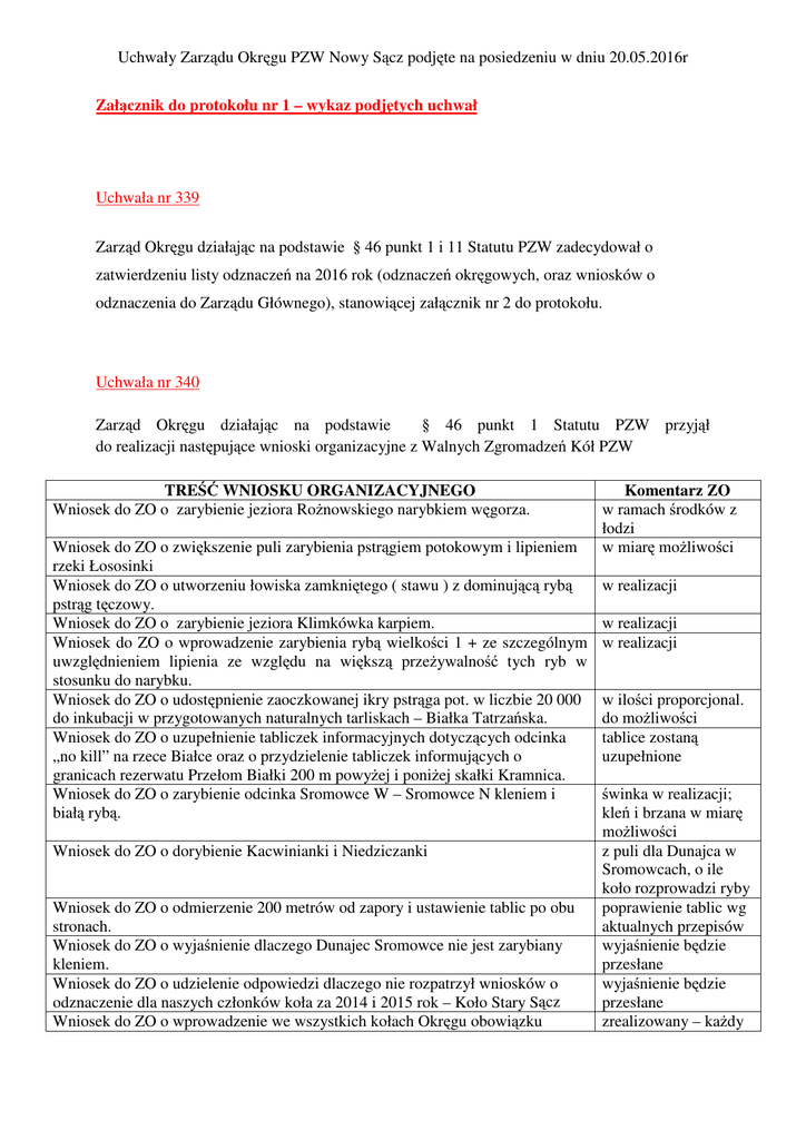 Uchwały Zarz du Okr gu PZW Nowy S cz podj te na posiedzeniu w dniu 20.05.2016r Zał cznik do protokołu nr 1 – wykaz podj tych uchwał Uchwała nr 339 Zarz d Okr gu działaj c na podstawie § 46 punkt 1 i 11 Statutu PZW zadecydował o zatwierdzeniu listy odznacze na 2016 rok (odznacze okr gowych, oraz wniosków o odznaczenia do Zarz du Głównego), stanowi cej zał cznik nr 2 do protokołu. Uchwała nr 340 § 46 punkt 1 Statutu PZW przyj ł Zarz d Okr gu działaj c na podstawie do realizacji nast puj ce wnioski organizacyjne z Walnych Zgromadze Kół PZW TRE WNIOSKU ORGANIZACYJNEGO Wniosek do ZO o zarybienie jeziora Ro nowskiego narybkiem w gorza. Wniosek do ZO o zwi kszenie puli zarybienia pstr giem potokowym i lipieniem rzeki Łososinki Wniosek do ZO o utworzeniu łowiska zamkni tego ( stawu ) z dominuj c ryb pstr g t czowy. Wniosek do ZO o zarybienie jeziora Klimkówka karpiem. Wniosek do ZO o wprowadzenie zarybienia ryb wielko ci 1 + ze szczególnym uwzgl dnieniem lipienia ze wzgl du na wi ksz prze ywalno tych ryb w stosunku do narybku. Wniosek do ZO o udost pnienie zaoczkowanej ikry pstr ga pot. w liczbie 20 000 do inkubacji w przygotowanych naturalnych tarliskach – Białka Tatrza ska. Wniosek do ZO o uzupełnienie tabliczek informacyjnych dotycz cych odcinka „no kill” na rzece Białce oraz o przydzielenie tabliczek informuj cych o granicach rezerwatu Przełom Białki 200 m powy ej i poni ej skałki Kramnica. Wniosek do ZO o zarybienie odcinka Sromowce W – Sromowce N kleniem i biał ryb . Wniosek do ZO o dorybienie Kacwinianki i Niedziczanki Wniosek do ZO o odmierzenie 200 metrów od zapory i ustawienie tablic po obu stronach. Wniosek do ZO o wyja nienie dlaczego Dunajec Sromowce nie jest zarybiany kleniem. Wniosek do ZO o udzielenie odpowiedzi dlaczego nie rozpatrzył wniosków o odznaczenie dla naszych członków koła za 2014 i 2015 rok – Koło Stary S cz Wniosek do ZO o wprowadzenie we wszystkich kołach Okr gu obowi zku Komentarz ZO w ramach rodków z łodzi w miar mo liwo ci w realizacji w realizacji w realizacji w ilo ci proporcjonal. do mo liwo ci tablice zostan uzupełnione winka w realizacji; kle i brzana w miar mo liwo ci z puli dla Dunajca w Sromowcach, o ile koło rozprowadzi ryby poprawienie tablic wg aktualnych przepisów wyja nienie b dzie przesłane wyja nienie b dzie przesłane zrealizowany – ka dy Uchwały Zarz du Okr gu PZW Nowy S cz podj te na posiedzeniu w dniu 20.05.2016r wykonywania pracy na rzecz koła lub wniesienie ekwiwalentu. Zgodnie z wnioskiem składki na zagospodarowanie i ochron wód s niewystarczaj ce aby utrzyma wła ciwy stan ekosystemów wodnych. Dlatego wspólna praca członków koła zwi kszy poczucie bycia gospodarzem na podległych wodach. Wniosek do ZO o ograniczenie waha lustra wody na J. Czorsztyn w okresie tarła ryb i inkubacji ikry. Wahania wody powoduj du e straty ikry i wyl gu a ograniczenie waha wpłynie pozytywie na rybostan jeziora. Wniosek do ZO o prowadzenie cisłej kontroli materiału zarybieniowego pod wzgl dem jako ci i ilo ci narybku. Wniosek do ZO o udro nienie potoku Szczawnik poprzez przebudow progu pod mostem kolejowym. Ponowienie wniosku z lat ubiegłych. Wniosek do ZO o podj cie prób zarybienia potoku Zimne na Majdanie narybkiem pstr ga potokowego. Wniosek do ZO o przeprowadzenie zarybie potoku Muszynka narybkiem, wyl giem wiosennym + 1 i starszym. Wniosek do ZO o wyja nienie zapisu w RAPR dział 6 p4 ochrona ryb i zapisu dotycz cego skrócenia okresu ochronnego jesiotra ostronosego. Gatunek ten podlega całkowitemu zakazowi połowów w dkarskich zgodnie z pkt. 5 wi c jaki był sens umieszcza jego nazw w pkt. 4. Wniosek do ZO o zarybienie jeziora Czorsztyn karpiem. Wniosek do ZO o mo liwo zarybienia zb. Czorsztyn karpiem według obligu Okr gu. Wniosek do ZO o obowi zku upominania przez stra ryback o utrzymaniu czysto ci na stanowiskach w dkarskich. Wniosek do ZO o wzmo enie kontroli na wodach Okr gu Nowy S cz przez stra Okr gu. Wniosek do ZO o dokonanie odłowu pstr ga na potoku Obidzkim i Brzy skim na dług. 500 m na ka dym potoku, a nast pnie zarybianie tych fragmentów wyl giem pstr ga potokowego – Koło Ł cko Wniosek do ZO o monitorowanie przepławki na progu MEW w winiarsku celem stwierdzenia jej skuteczno ci. Wniosek do ZO o zarybianie zbiornika Klimkówka karpiem i w gorzem. Wniosek do ZO o zarybianie w dalszym ci gu rzeki Raby narybkiem pstr ga i lipienia. Wniosek do ZO o objecie rzeki Raby ochron przez etatow Stra Ryback . Wniosek do ZO o powiadamianie kół o terminach zarybie sandaczem i szczupakiem aby koła mogły w nich uczestniczy – Koło Chabówka Wniosek do ZO o zarybienie J. Czorsztyn w 2016 r. narybkiem jesiennym sandacza, szczupaka oraz kroczkiem karpia. Wniosek do ZO o nawi zanie współpracy z lokalnymi kołami łowieckimi w celu zredukowania populacji kormoranów na J. Czorsztyn na podstawie wydanego zezwolenia – Koło Nad Zalewem Kluszkowce Wniosek do ZO o pozyskanie zaoczkowanej ikry pstr ga pot. do zarybie rzeki członek PZW ma statutowy obowi zek pracy społecznej na rzecz Zwi zku w realizacji w realizacji zostanie przesłane pismo do RZGW z puli dla Popradu lub Muszynki, o ile koło rozprowadzi ryby w realizacji uwaga zostanie przesłana do ZG w realizacji w realizacji w realizacji w realizacji w uzgodnieniu i przy pomocy Koła stan przepławki b dzie monitorowany karp – w realizacji; w gorz - odrzucony w realizacji w realizacji w realizacji zgodnie z instrukcj zarybie ; Koło Chabówka dopisane do listy zarybie j. Czorsztyn w realizacji w realizacji; Koło mo e wskaza dodatkowych my liwych zrealizowany Uchwały Zarz du Okr gu PZW Nowy S cz podj te na posiedzeniu w dniu 20.05.2016r Białej Tarnowskiej. Wniosek do ZO o zarybienie rzeki Białej Tarnowskiej narybkiem brzany pozyskanym od Okr gu PZW Nowy S cz lub zakupionym za pieni dze Koła Grybów. Wniosek do ZO o mo liwo u ywania silnika spalinowego na j. Czorsztyn ( szczególnie w przypadkach zagro enia ycia lub zdro