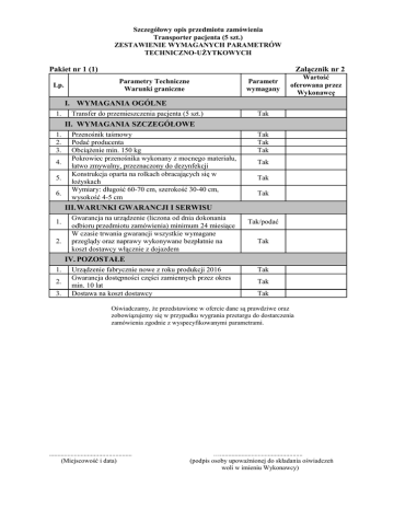 Szczegółowy opis przedmiotu zamówienia Transporter pacjenta (5 szt.) ZESTAWIENIE WYMAGANYCH PARAMETRÓW TECHNICZNO-UŻYTKOWYCH Pakiet nr 1 (1) Lp. Załącznik nr 2 Parametry Techniczne Warunki graniczne Parametr wymagany Wartość oferowana przez Wykonawcę I. WYMAGANIA OGÓLNE 1. Transfer do przemieszczenia pacjenta (5 szt.) Tak II. WYMAGANIA SZCZEGÓŁOWE 1. 2. 3. 4. 5. 6. Przenośnik taśmowy Podać producenta Obciążenie min. 150 kg Pokrowiec przenośnika wykonany z mocnego materiału, łatwo zmywalny, przeznaczony do dezynfekcji Konstrukcja oparta na rolkach obracających się w łożyskach Wymiary: długość 60-70 cm, szerokość 30-40 cm, wysokość 4-5 cm Tak Tak Tak Tak Tak Tak III.WARUNKI GWARANCJI I SERWISU 1. 2. Gwarancja na urządzenie (liczona od dnia dokonania odbioru przedmiotu zamówienia) minimum 24 miesiące W czasie trwania gwarancji wszystkie wymagane przeglądy oraz naprawy wykonywane bezpłatnie na koszt dostawcy włącznie z dojazdem Tak/podać Tak IV. POZOSTAŁE 1. 2. 3. Urządzenie fabrycznie nowe z roku produkcji 2016 Gwarancja dostępności części zamiennych przez okres min. 10 lat Dostawa na koszt dostawcy Tak Tak Tak Oświadczamy, że przedstawione w ofercie dane są prawdziwe oraz zobowiązujemy się w przypadku wygrania przetargu do dostarczenia zamówienia zgodnie z wyspecyfikowanymi parametrami. .................................................. (Miejscowość i data) ….................................................. (podpis osoby upoważnionej do składania oświadczeń woli w imieniu Wykonawcy) Szczegółowy opis przedmiotu zamówienia Wózek reanimacyjny (1 szt.) ZESTAWIENIE WYMAGANYCH PARAMETRÓW TECHNICZNO-UŻYTKOWYCH Pakiet nr 1 (2) Lp. Załącznik nr 2 Parametry Techniczne Warunki graniczne Parametr wymagany Wartość oferowana przez Wykonawcę I. WYMAGANIA OGÓLNE 1. 2. 3. Wózek reanimacyjny dla Oddziału IOM Dzieci (1 szt.) Podać model Podać producenta Tak Tak Tak II. WYMAGANIA SZCZEGÓŁOWE 1. 2. 3. 4. 5. 6. 7. 8. 9. 10. 11. 12. 13. 14. 15. Wózek wyposażony w 3 szuflady o wysokości min. 10 cm, 2 szuflady o wysokości min. 15 cm z przegrodami na leki i sprzęt Półka ze stali nierdzewnej Półka na defibrylator/monitor Pojemnik na rękawice W wyposażeniu wózka butla z tlenem medycznym o pojemności 10 l z reduktorem Blokada centralna szuflad Wieszak do kroplówki Wózek na podstawie jezdnej z kółkami o średnicy min. 10 cm nie brudzącymi wykładzin podłogowych – dwa koła z blokadą Możliwość wyboru kolorystyki wózka przez zamawiającego przed dostawą – kolor zbliżony do turkusu Chowana półka na dokumentacje Nadstawka z min. 10 przezroczystymi pojemnikami Pojemnik na zużyte igły Kosz na odpadki Pojemnik na butelki Szuflada na leki ratujące życie Tak Tak Tak Tak Tak Tak Tak Tak Tak Tak Tak Tak Tak Tak Tak III.WARUNKI GWARANCJI I SERWISU 1. 2. Gwarancja na urządzenie (liczona od dnia dokonania odbioru przedmiotu zamówienia) minimum 36 miesięcy W czasie trwania gwarancji wszystkie wymagane przeglądy oraz naprawy wykonywane bezpłatnie na koszt dostawcy włącznie z dojazdem Tak/podać Tak IV. POZOSTAŁE 1. 2. 3. 4. Urządzenie fabrycznie nowe z roku produkcji 2016 Gwarancja dostępności części zamiennych przez okres min. 10 lat Instrukcja obsługi w języku polskim w wersji papierowej oraz elektronicznej Dostawa na koszt dostawcy .................................................. (Miejscowość i data) Tak Tak Tak Tak ….................................................. (podpis osoby upoważnionej do składania oświadczeń woli w imieniu Wykonawcy) Szczegółowy opis przedmiotu zamówienia Wózek opatrunkowy (1 szt.) ZESTAWIENIE WYMAGANYCH PARAMETRÓW TECHNICZNO-UŻYTKOWYCH Pakiet nr 1 (3) Lp. Załącznik nr 2 Parametry Techniczne Warunki graniczne Parametr wymagany Wartość oferowana przez Wykonawcę I. WYMAGANIA OGÓLNE 1. 2. 3. Wózek opatrunkowy dla Oddziału IOM Dzieci (1 szt.) Podać model Podać producenta Tak Tak Tak II. WYMAGANIA SZCZEGÓŁOWE 1. 2. 3. 4. 5. 6. 7. 8. Wózek o wymiarach: wysokość min.1000 mm bez nadstawki, głębokość 500 mm, szerokość 650 mm Wózek wyposażony w min. 3 szuflady z przegrodami do segregacji sprzętu i materiałów opatrunkowych Centralna blokada wszystkich szuflad na klucz Uchwyt na pojemniki na zużyte ostre przedmioty Min. 2 pojemniki na rękawiczki Min. 2 pojemniki na odpady Blat ze stali kwasoodpornej odpornej na korozję Wózek wyposażony w cztery koła o średnicy min. 7,5 cm nie brudzące wykładzin podłogowych – dwa z blokadą Tak Tak Tak Tak Tak Tak Tak Tak III. WARUNKI GWARANCJI I SERWISU 1. Gwarancja na urządzenie (liczona od dnia dokonania odbioru przedmiotu zamówienia) minimum 36 miesięcy 2. W czasie trwania gwarancji wszystkie naprawy wykonywane bezpłatnie na koszt dostawcy włącznie z dojazdem Tak/podać okres gwarancji Tak IV. POZOSTAŁE 1. 2. 3. 4. Urządzenie fabrycznie nowe z roku produkcji 2016 Gwarancja dostępności części zamiennych przez okres min. 10 lat Instrukcja obsługi w języku polskim w wersji papierowej Dostawa na koszt dostawcy Tak Tak Tak Tak Oświadczamy, że przedstawione w ofercie dane są prawdziwe oraz zobowiązujemy się w przypadku wygrania przetargu do dostarczenia zamówienia zgodnie z wyspecyfikowanymi parametrami. .................................................. (Miejscowość i data) ….................................................. (podpis osoby upoważnionej do składania oświadczeń woli w imieniu Wykonawcy) Szczegółowy opis przedmiotu zamówienia Wielofunkcyjny wózek oddziałowy (1 szt.) ZESTAWIENIE WYMAGANYCH PARAMETRÓW TECHNICZNO-UŻYTKOWYCH Pakiet nr 1 (4) Lp. Załącznik nr 2 Parametry Techniczne Warunki graniczne Parametr wymagany Wartość oferowana przez Wykonawcę I. WYMAGANIA OGÓLNE 1. 2. 3. Wielofunkcyjny wózek oddziałowy dla Oddziału IOM Dzieci (1 szt.) Podać model Podać producenta Tak Tak Tak II. WYMAGANIA SZCZEGÓŁOWE 1. 2. 3. 4. 5. 6. 7. 8. 9. 10. 11. Wózek o 