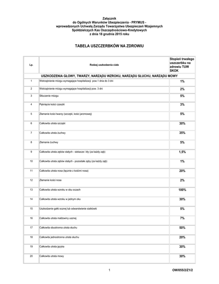 Ubezpieczenie PRYMUS - Tabela uszczerbków na zdrowiu.