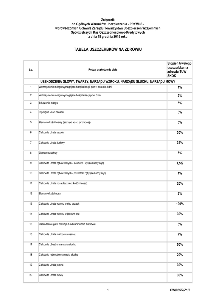 Załącznik do Ogólnych Warunków Ubezpieczenia - PRYMUS wprowadzonych Uchwałą Zarządu Towarzystwa Ubezpieczeń Wzajemnych Spółdzielczych Kas Oszczędnościowo-Kredytowych z dnia 18 grudnia 2015 roku TABELA USZCZERBKÓW NA ZDROWIU Lp. Rodzaj uszkodzenia ciała Stopień trwałego uszczerbku na zdrowiu TUW SKOK USZKODZENIA GŁOWY, TWARZY, NARZĄDU WZROKU, NARZĄDU SŁUCHU, NARZĄDU MOWY 1 Wstrząśnienie mózgu wymagające hospitalizacji pow.1 dnia do 3 dni 1% 2 Wstrząśnienie mózgu wymagające hospitalizacji pow. 3 dni 2% 3 Stłuczenie mózgu 5% 4 Pęknięcie kości czaszki 3% 5 Złamanie kości twarzy (szczęki, kości jarzmowej) 5% 6 Całkowita utrata szczęki 30% 7 Całkowita utrata żuchwy 35% 8 Złamanie żuchwy 5% 9 Całkowita utrata zębów stałych - siekacze i kły (za każdy ząb) 10 Całkowita utrata zębów stałych - pozostałe zęby (za każdy ząb) 1% 11 Całkowita utrata nosa (łącznie z kośćmi nosa) 20% 12 Złamanie kości nosa 2% 13 Całkowita utrata wzroku w obu oczach 100% 14 Całkowita utrata wzroku w jednym oku 30% 15 Uszkodzenie gałki ocznej lub odwarstwienie siatkówki 5% 16 Całkowita utrata małżowiny usznej 7% 17 Całkowita obustronna utrata słuchu 50% 18 Całkowita jednostronna utrata słuchu 20% 19 Całkowita utrata języka 30% 20 Całkowita utrata mowy 30% 1,5% 1 OW/055/2/Z1/2 USZKODZENIA SZYI, KRTANI, TCHAWICY, PRZEŁYKU 3% za trzon 21 Złamanie kręgosłupa szyjnego ze zniekształceniem i ograniczeniem ruchomości 22 Uszkodzenie krtani, powodujące konieczność stałego stosowania rurki tchawicznej 25% 23 Uszkodzenie krtani pozwalające na obchodzenie się bez rurki tchawicznej 5% 24 Uszkodzenie tchawicy 2% 25 Uszkodzenie przełyku powodujące całkowitą niedrożność przełyku ze stałą przetoką żołądkową 30% 26 Złamanie kręgosłupa piersiowo-lędźwiowego ze zniekształceniem i ograniczeniem ruchomości (z wyłączeniem kości ogonowej) 27 Złamanie łopatki 2% 28 Złamanie obojczyka 2% 29 Złamanie mostka 2% 30 Złamanie żebra (1% za każde żebro, max 10%) 1% 31 Złamanie kości miednicy 10% 32 Złamanie dna panewki 5% 33 Całkowita utrata gruczołu piersiowego 10% 34 Uszkodzenie płuc z niewydolnością oddechową 10% 35 Przepukliny urazowe 5% 36 Całkowita utrata żołądka 20% 37 Uszkodzenie żołądka lub jelit z zaburzeniami trawienia 8% 38 Przetoki jelitowe 15% 39 Uszkodzenie zwieracza odbytu 5% 40 Utrata śledziony 10% 41 Uszkodzenie wątroby lub dróg żółciowych z zaburzeniami czynności 10% 42 Uszkodzenie trzustki z zaburzeniami czynności 10% 43 Utrata nerki 20% 44 Uszkodzenie moczowodu 10% 45 Uszkodzenie pęcherza 5% 46 Uszkodzenie cewki moczowej 5% 47 Utrata macicy 20% USZKODZENIA KLATKI PIERSIOWEJ, TUŁOWIA, NARZĄDÓW WEWNĘTRZNYCH 2 2% za trzon OW/055/2/Z1/2 48 Utrata jajnika lub jądra 10% 49 Utrata obu jajników lub obu jąder 20% 50 Całkowita utrata prącia 20% 51 Uszkodzenie krocza 5% USZKODZENIA KOŃCZYNY GÓRNEJ 52 Utrata kończyny górnej na wysokości ramienia 50% 53 Utrata kończyny górnej powyżej stawu łokciowego 50% 54 Utrata kończyny górnej na wysokości przedramienia 40% 55 Utrata kończyny górnej na wysokości nadgarstka 30% 56 Utrata kciuka (w przypadku utraty częściowej - 1/2 wartości za każdy paliczek) 5% 57 Utrata palca wskazującego (w przypadku utraty częściowej - 1/3 wartości za każdy paliczek) 4% 58 Utrata palca dłoni od III do V (za każdy palec, w przypadku utraty częściowej - 1/3 wartości za każdy paliczek) 3% 59 Złamanie nasady bliższej kości ramiennej 1,5% 60 Złamanie trzonu kości ramiennej 1,5% 61 Złamanie (śródstawowe) nasady dalszej kości ramiennej lub nasady bliższej kości promieniowej lub nasady bliższej kości łokciowej 1,5% 62 Zwichnięcie stawu barkowego 63 Złamanie trzonu kości łokciowej lub trzonu kości promieniowej 2,5 % 64 Złamanie (śródstawowe) nasady dalszej kości łokciowej lub nasady dalszej kości promieniowej 2,5 % 65 Złamanie (śródstawowe) nasad dalszych kości promieniowej i kości łokciowej (obu kości przedramienia) 5% 66 Zwichnięcie stawu łokciowego 1% 67 Złamanie kości nadgarstka 1% 68 Złamanie kości śródręcza 1% 69 Złamanie palca (za każdy palec) 1% 70 Utrata kończyny dolnej na wysokości powyżej połowy uda 50% 71 Utrata kończyny dolnej do wysokości połowy uda 50% 72 Utrata kończyny dolnej na wysokości poniżej kolana 40% 73 Utrata kończyny dolnej na wysokości do połowy łydki 30% 74 Utrata stopy 20% 1% USZKODZENIA KOŃCZYNY DOLNEJ 3 OW/055/2/Z1/2 75 Utrata palucha (w przypadku utraty częściowej - 1/2 wartości za każdy paliczek) 6% 76 Całkowita utrata palca stopy od II do V (za każdy palec) 1% 77 Zwichnięcie stawu biodrowego 5% 78 Złamanie kości udowej 5% 79 Pęknięcie rzepki 1% 80 Zwichnięcie stawu kolanowego 1% 81 Złamanie kości piszczelowej 5% 82 Złamanie kości strzałki 2% 83 Złamanie kości piszczelowej i kości strzałki (obu kości podudzia) 5% 84 Złamanie kości piętowej 3% 85 Złamanie kości skokowej 3% 86 Zwichnięcie w stawach skokowych 1% 87 Złamanie kości stępu 1% 88 Złamanie kości śródstopia 1% 89 Złamanie palców stopy (za każdy palec) 1% USZKODZENIA UKŁADU NERWOWEGO 90 Uszkodzenie rdzenia kręgowego z całkowitym porażeniem czterech kończyn 100% 91 Porażenie całkowite obu kończyn górnych bez porażenia kończyn dolnych 80% 92 Niedowład kończyn dolnych bez uszkodzenia kończyn górnych 80% 93 Jednostronne uszkodzenie nerwu twarzowego 5% 94 Dwustronne uszkodzenie nerwu twarzowego 10% USZKODZENIA POWŁOK CIAŁA 1% 95 Uszkodzenia powłok twarzy pozostawiające trwałe blizny lub ubytki 96 Oparzenie II stopnia rozległość max do 10% całej powierzchni ciała (za każdy 1% powierzchni ciała) 1% Max.10% 97 Oparzenie III stopnia rozległość max do 30% całej powierzchni ciała (za każdy 1% powierzchni ciała) 1% Max.30% 98 Pogryzienie przez psa o ile pobyt Ubezpieczonego w szpitalu, w związku z pogryzieniem, trwał nieprzerwanie powyżej 1 dn