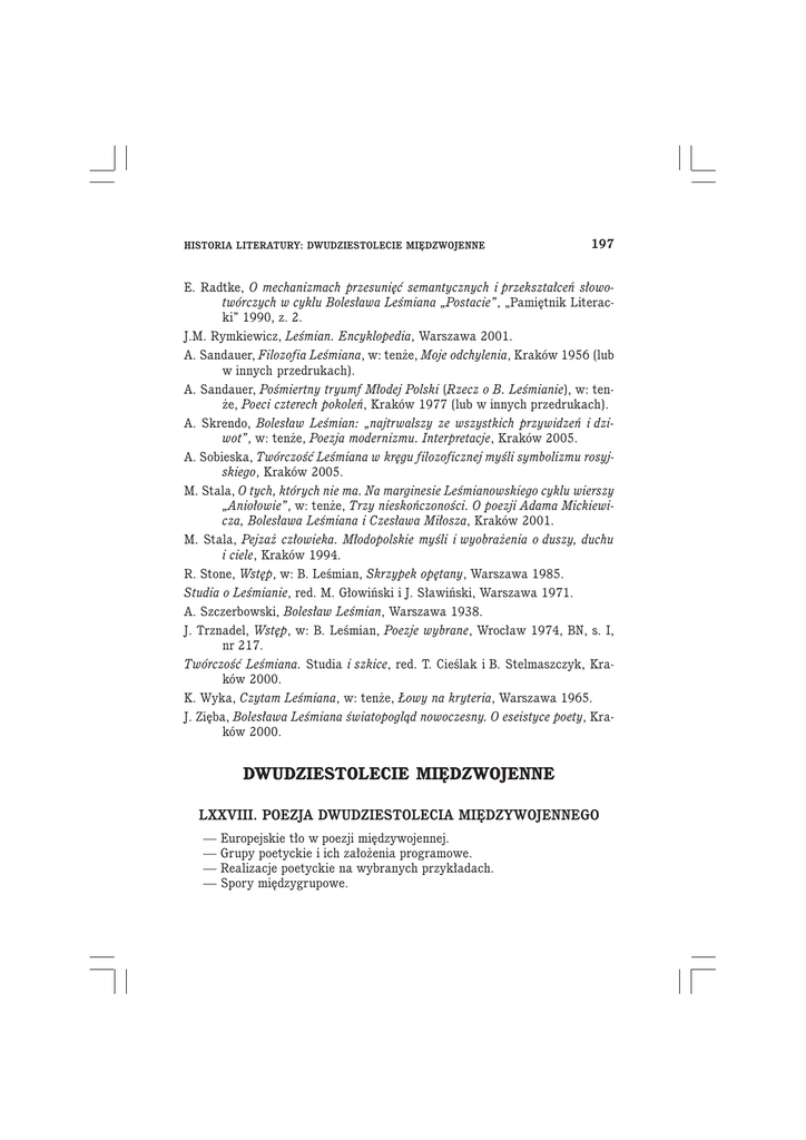 HISTORIA LITERATURY: DWUDZIESTOLECIE MIĘDZWOJENNE 197 E. Radtke, O mechanizmach przesunięć semantycznych i przekształceń słowotwórczych w cyklu Bolesława Leśmiana „Postacie”, „Pamiętnik Literacki” 1990, z. 2. J.M. Rymkiewicz, Leśmian. Encyklopedia, Warszawa 2001. A. Sandauer, Filozofia Leśmiana, w: tenże, Moje odchylenia, Kraków 1956 (lub w innych przedrukach). A. Sandauer, Pośmiertny tryumf Młodej Polski (Rzecz o B. Leśmianie), w: tenże, Poeci czterech pokoleń, Kraków 1977 (lub w innych przedrukach). A. Skrendo, Bolesław Leśmian: „najtrwalszy ze wszystkich przywidzeń i dziwot”, w: tenże, Poezja modernizmu. Interpretacje, Kraków 2005. A. Sobieska, Twórczość Leśmiana w kręgu filozoficznej myśli symbolizmu rosyjskiego, Kraków 2005. M. Stala, O tych, których nie ma. Na marginesie Leśmianowskiego cyklu wierszy „Aniołowie”, w: tenże, Trzy nieskończoności. O poezji Adama Mickiewicza, Bolesława Leśmiana i Czesława Miłosza, Kraków 2001. M. Stala, Pejzaż człowieka. Młodopolskie myśli i wyobrażenia o duszy, duchu i ciele, Kraków 1994. R. Stone, Wstęp, w: B. Leśmian, Skrzypek opętany, Warszawa 1985. Studia o Leśmianie, red. M. Głowiński i J. Sławiński, Warszawa 1971. A. Szczerbowski, Bolesław Leśmian, Warszawa 1938. J. Trznadel, Wstęp, w: B. Leśmian, Poezje wybrane, Wrocław 1974, BN, s. I, nr 217. Twórczość Leśmiana. Studia i szkice, red. T. Cieślak i B. Stelmaszczyk, Kraków 2000. K. Wyka, Czytam Leśmiana, w: tenże, Łowy na kryteria, Warszawa 1965. J. Zięba, Bolesława Leśmiana światopogląd nowoczesny. O eseistyce poety, Kraków 2000. DWUDZIESTOLECIE MIĘDZWOJENNE LXXVIII. POEZJA DWUDZIESTOLECIA MIĘDZYWOJENNEGO — — — — Europejskie tło w poezji międzywojennej. Grupy poetyckie i ich założenia programowe. Realizacje poetyckie na wybranych przykładach. Spory międzygrupowe. 198 PRZEWODNIK PO TEMATACH OLIMPIADY LITERATURY I JĘZYKA POLSKIEGO — Charakterystyka poszczególnych nurtów i indywidualności poetyckich (sposoby kształtowania wierszy: właściwości leksykalne, gatunkowe, kompozycyjne i wersyfikacyjne). — Koncepcje języka poetyckiego. — Ewolucje programów i poetyk między 1918 a 1939 rokiem. Utwory: Wybór wierszy: W. Broniewskiego, J. Czechowicza, K.I. Gałczyńskiego, Z. Ginczanki, K. Iłłakowiczówny, J. Iwaszkiewicza, B. Jasieńskiego, M. Pawlikowskiej-Jasnorzewskiej, J. Lechonia, B. Leśmiana, J. Lieberta, J. Łobodowskiego, Cz. Miłosza, S. Młodożeńca, T. Peipera, J. Przybosia, W. Sebyły, A. Słonimskiego, L. Staffa, A. Sterna, J. Tuwima, A. Ważyka, K. Wierzyńskiego, J. Wittlina. Zalecana antologia: Poezja polska okresu międzywojennego, wybór i wstęp M. Głowiński i J. Sławiński, przypisy oprac. J. Stradecki, Wrocław 1987, BN, s. I, nr 253, cz. I i II. Ponadto wybrane utwory: A. Achmatowej, G. Apolinaire’a, W. Audena, R. Chara, T.S. Eliota, P. Eluarda, M. Jacoba, S. Jesienina, W. Majakowskiego, O. Mandelsztama, E. Pounda, R.M. Rilkego, G. Trakla. Opracowania: Antologia polskiego futuryzmu i Nowej Sztuki, oprac. Z. Jarosiński, Wrocław 1978, BN, s. I, nr 230. A. Araszkiewicz, Wypowiadam wam moje życie. Malancholia Zuzanny Ginczanki, Warszawa 2001. E. Balcerzan, Systemy i przemiany gatunkowe w polskiej liryce lat 1918–1928, w: Problemy literatury polskiej 1918–1939, red. H. Kirchner i Z. Żabicki przy współudziale M.R. Pragłowskiej, Wrocław 1974. M. Baranowska, Surrealna wyobraźnia i poezja, Warszawa 1984. S. Bereś, Ostatnia wileńska plejada. Szkice o poezji kręgu Żagarów, Warszawa 1990. E. Boniecki, Archaiczny świat Bolesława Leśmiana. Studium historycznoliterackie, Gdańsk 2008. Józef Czechowicz. Od awangardy do nowoczesności, red. J. Święch, Lublin 2004. Czechowicz – w poszukiwaniu ukrytego miasta, numery monograficzne „Scriptores” (nr 30, 31, 32), Lublin 2006–2008. J. Czechowicz, Wyobraźnia stwarzająca, oprac. T. Kłak, Lublin 1972. M. Głowiński, Przyboś: najwięcej słów, „Teksty” 1975, nr 1. M. Głowiński, Zaświat przedstawiony, Warszawa 1981 i wyd. nast. HISTORIA LITERATURY: DWUDZIESTOLECIE MIĘDZWOJENNE 199 A. Hutnikiewicz, Od czystej formy do literatury faktu. Główne teorie i programy literackie XX stulecia, wyd. 5 uzup., Warszawa 1988. Z. Jarosiński, Literatura i nowe społeczeństwo. Idee polskiej lewicy literackiej, Warszawa 1984. Z. Jarosiński, Postacie poezji, Warszawa 1985. K. Jaworski, Dandys. Słowo o Brunonie Jasieńskim, Warszawa 2009. S. Jaworski, Między awangardą a nadrealizmem, Kraków 1976. A. Kluba, Autoteliczność, referencyjność, niewyrażalność. O nowoczesnej poezji polskiej (1918–1939),Wrocław 2004 T. Kłak, Wstęp, w: J. Czechowicz, Wybór poezji, Wrocław 1970, BN, s. I, nr 199. J. Kryszak, Katastrofizm ocalający. Z problemów poezji tzw. drugiej awangardy, Toruń 1978. J. Kwiatkowski, Literatura Dwudziestolecia, Warszawa 1990. J. Kwiatkowski, Poezja Jarosława Iwaszkiewicza na tle dwudziestolecia międzywojennego, Warszawa 1975. J. Kwiatkowski, Świat poetycki Juliana Przybosia, Warszawa 1972. A. Lam, Polska awangarda poetycka. Programy lat 1917–1923, t. I–II, Kraków 1969. Liryka polska. Interpretacje, red. J. Sławiński i J. Prokop, wyd. 2, Kraków 1972. Literatura polska 1918–1975, t. I: 1918–1932, Warszawa 1975 (odpowiednie rozdziały); t. II: 1933–1944, Warszawa 2002. Łobodowski, numer monograficzny „Scriptores” (nr 35), Lublin 2009. Cz. Miłosz, Przygody młodego umysłu. Publicystyka i proza 1931–1939, zebrała i opracowała A. Stawiarska, Kraków 2003. A. Nasiłowska, Kazimierz Wierzyński, Warszawa 1991. A. Nasiłowska, Trzydziestolecie 1914–1944, Warszawa 1997. A. Nawarecki, Rzeczy i marzenia. Studia o wyobraźni poetyckiej skamandrytów, Katowice 1993. Obraz literatury polskiej. Literatura polska w okresie międzywojennym, t. II, red. K. Wyka..., J. Kądziela i in., Kraków 1979. A. Okopień-Sławińska, Wiersz awangardowy dwudziestolecia międz