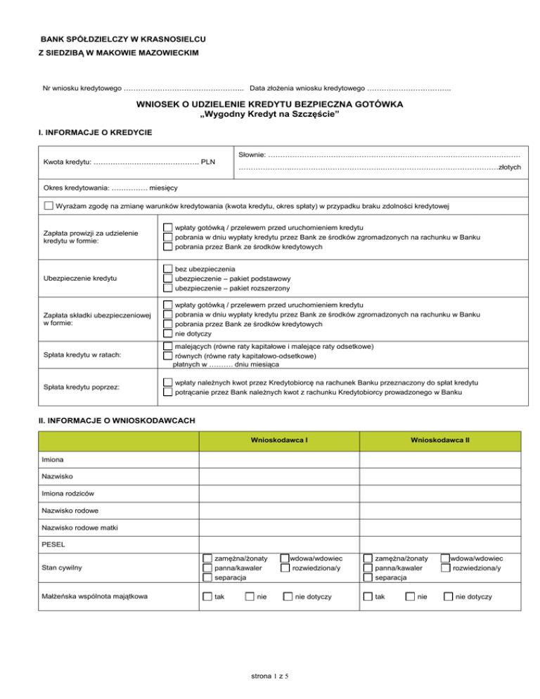 BANK SPÓŁDZIELCZY W KRASNOSIELCU Z SIEDZIBĄ W MAKOWIE MAZOWIECKIM Nr wniosku kredytowego ………………………………………….. Data złożenia wniosku kredytowego …………………………….. WNIOSEK O UDZIELENIE KREDYTU BEZPIECZNA GOTÓWKA „Wygodny Kredyt na Szczęście” I. INFORMACJE O KREDYCIE Kwota kredytu: …………….………………………. PLN Słownie: ……………………………..…………………….……………………………………… ………………….………………………………..…………………………………………złotych Okres kredytowania: …………… miesięcy Wyrażam zgodę na zmianę warunków kredytowania (kwota kredytu, okres spłaty) w przypadku braku zdolności kredytowej Zapłata prowizji za udzielenie kredytu w formie: wpłaty gotówką / przelewem przed uruchomieniem kredytu pobrania w dniu wypłaty kredytu przez Bank ze środków zgromadzonych na rachunku w Banku pobrania przez Bank ze środków kredytowych Ubezpieczenie kredytu bez ubezpieczenia ubezpieczenie – pakiet podstawowy ubezpieczenie – pakiet rozszerzony Zapłata składki ubezpieczeniowej w formie: wpłaty gotówką / przelewem przed uruchomieniem kredytu pobrania w dniu wypłaty kredytu przez Bank ze środków zgromadzonych na rachunku w Banku pobrania przez Bank ze środków kredytowych nie dotyczy Spłata kredytu w ratach: Spłata kredytu poprzez: malejących (równe raty kapitałowe i malejące raty odsetkowe) równych (równe raty kapitałowo-odsetkowe) płatnych w ………. dniu miesiąca wpłaty należnych kwot przez Kredytobiorcę na rachunek Banku przeznaczony do spłat kredytu potrącanie przez Bank należnych kwot z rachunku Kredytobiorcy prowadzonego w Banku II. INFORMACJE O WNIOSKODAWCACH Wnioskodawca I Wnioskodawca II Imiona Nazwisko Imiona rodziców Nazwisko rodowe Nazwisko rodowe matki PESEL Stan cywilny zamężna/żonaty panna/kawaler separacja Małżeńska wspólnota majątkowa tak nie strona 1 z 5 wdowa/wdowiec rozwiedziona/y nie dotyczy zamężna/żonaty panna/kawaler separacja tak nie wdowa/wdowiec rozwiedziona/y nie dotyczy Wnioskodawca I Cechy dokumentu tożsamości Adres zameldowania Adres do korespondencji Nr telefonu (do wyboru) Wnioskodawca II Nazwa: …………………………………………. Nazwa: ………………………….………………. Seria…………………………………………….. Seria…………………………….……………….. Nr dokumentu: ……………….………………… Nr dokumentu: …………….…….……………… Wydany przez: ................................................ Wydany przez: ................................................. Ulica: ………………………….…………………. Ulica: ……………………………………………... Nr domu: ………………….…………………….. Nr domu: …………………………………………. Nr lokalu………………….……………………… Nr lokalu: …………………….…………………… Kod: ……………………………………………... Kod: …………………………….………………… Miejscowość: …………………….……………… Miejscowość………………….………………….. Kraj: ……………………………………………... Kraj: ………………………….…………………… Ulica……...………………………….…………… Ulica……...…………………….….……………… Nr domu: ……...………………………………… Nr domu: ……...…………………….…………… Nr lokalu: ……...……………...………………… Nr lokalu: ……...…………….…………………… Kod……...………….……….…………………… Kod……...………..…………….………………… Miejscowość: ……...…………………………… Miejscowość: …………....……………………… Kraj: ……...……………………………………… Kraj: ……...…………….………………………… stacjonarny…………………………….………… stacjonarny: ……………………………………… komórkowy: ………………………….………….. komórkowy: ……………………….……………… E-mail: Wykształcenie wyższe magisterskie licencjat/inżynier średnie zasadnicze zawodowe podstawowe/gimnazjalne wyższe magisterskie licencjat/inżynier średnie zasadnicze zawodowe podstawowe/gimnazjalne nie posiadam posiadam ................. nie posiadam posiadam ................. Wykonywany zawód Rachunek III. INFORMACJE O DOCHODACH I WYDATKACH Wnioskodawca I Wnioskodawca II Całkowity staż pracy (w latach) Okres zatrudnienia u obecnego pracodawcy/czas prowadzenia obecnej dział. gospodarczej (w latach) Informacje o pracodawcy (nazwa, adres) Stanowisko Miesięczny dochód netto: Źródła dochodu właściciel firmy wyższa kadra zarządzająca średnia kadra zarządzająca urzędnik specjalista pracownik inne właściciel firmy wyższa kadra zarządzająca średnia kadra zarządzająca urzędnik specjalista pracownik inne ..................................... PLN, w tym: ..................................... PLN, w tym: umowa o pracę: ................................... emerytura: ........................................... renta: ................................................... zasiłek przedemerytalny: ..................... wolne zawody: ..................................... działalność gospodarcza: .................... działalność rolnicza: ............................ strona 2 z 5 umowa o pracę: ................................... emerytura: ........................................... renta: ................................................... zasiłek przedemerytalny: ..................... wolne zawody: ...........