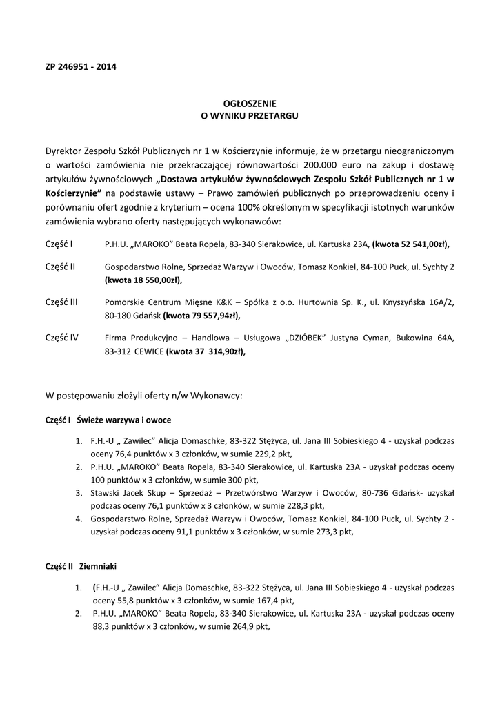 ZP 246951 - 2014 OGŁOSZENIE O WYNIKU PRZETARGU Dyrektor Zespołu Szkół Publicznych nr 1 w Kościerzynie informuje, że w przetargu nieograniczonym o wartości zamówienia nie przekraczającej równowartości 200.000 euro na zakup i dostawę artykułów żywnościowych „Dostawa artykułów żywnościowych Zespołu Szkół Publicznych nr 1 w Kościerzynie” na podstawie ustawy – Prawo zamówień publicznych po przeprowadzeniu oceny i porównaniu ofert zgodnie z kryterium – ocena 100% określonym w specyfikacji istotnych warunków zamówienia wybrano oferty następujących wykonawców: Część I P.H.U. „MAROKO” Beata Ropela, 83-340 Sierakowice, ul. Kartuska 23A, (kwota 52 541,00zł), Część II Gospodarstwo Rolne, Sprzedaż Warzyw i Owoców, Tomasz Konkiel, 84-100 Puck, ul. Sychty 2 (kwota 18 550,00zł), Część III Pomorskie Centrum Mięsne K&K – Spółka z o.o. Hurtownia Sp. K., ul. Knyszyńska 16A/2, 80-180 Gdańsk (kwota 79 557,94zł), Część IV Firma Produkcyjno – Handlowa – Usługowa „DZIÓBEK” Justyna Cyman, Bukowina 64A, 83-312 CEWICE (kwota 37 314,90zł), W postępowaniu złożyli oferty n/w Wykonawcy: Część I Świeże warzywa i owoce 1. F.H.-U „ Zawilec” Alicja Domaschke, 83-322 Stężyca, ul. Jana III Sobieskiego 4 - uzyskał podczas oceny 76,4 punktów x 3 członków, w sumie 229,2 pkt, 2. P.H.U. „MAROKO” Beata Ropela, 83-340 Sierakowice, ul. Kartuska 23A - uzyskał podczas oceny 100 punktów x 3 członków, w sumie 300 pkt, 3. Stawski Jacek Skup – Sprzedaż – Przetwórstwo Warzyw i Owoców, 80-736 Gdańsk- uzyskał podczas oceny 76,1 punktów x 3 członków, w sumie 228,3 pkt, 4. Gospodarstwo Rolne, Sprzedaż Warzyw i Owoców, Tomasz Konkiel, 84-100 Puck, ul. Sychty 2 uzyskał podczas oceny 91,1 punktów x 3 członków, w sumie 273,3 pkt, Część II Ziemniaki 1. 2. (F.H.-U „ Zawilec” Alicja Domaschke, 83-322 Stężyca, ul. Jana III Sobieskiego 4 - uzyskał podczas oceny 55,8 punktów x 3 członków, w sumie 167,4 pkt, P.H.U. „MAROKO” Beata Ropela, 83-340 Sierakowice, ul. Kartuska 23A - uzyskał podczas oceny 88,3 punktów x 3 członków, w sumie 264,9 pkt, 3. 4. Gospodarstwo Rolne, Sprzedaż Warzyw i Owoców, Tomasz Konkiel, 84-100 Puck, ul. Sychty 2 uzyskał podczas oceny 100 punktów x 3 członków, w sumie 300 pkt, Stawski Jacek Skup – Sprzedaż – Przetwórstwo Warzyw i Owoców,80-736 Gdańsk - uzyskał podczas oceny 84,1 punktów x 3 członków, w sumie 252,3 pkt, Część III Mięso świeże, wędliny 1. Zakłady Mięsne „Skiba” Andrzej Skiba 89-600 Chojnice , ul. Derdowskiego 23 - uzyskał podczas oceny 99,2 punktów x 3 członków, w sumie 297,6 pkt, 2. Firma Produkcyjno – Handlowa – Usługowa „DZIÓBEK” Justyna Cyman, Bukowina 64A, 83-312 CEWICE - uzyskał podczas oceny 96,4 punktów x 3 członków, w sumie 289,2 pkt, 3. Pomorskie Centrum Mięsne K&K – Spółka z o.o. Hurtownia Sp. K., ul. Knyszyńska 16A/2, 80-180 Gdańsk - uzyskał podczas oceny 100 punktów x 3 członków, w sumie 300 pkt, Część IV Mięso drobiowe świeże 1. Firma Produkcyjno – Handlowa – Usługowa „DZIÓBEK” Justyna Cyman, Bukowina 64A, 83-312 CEWICE - uzyskał podczas oceny 100 punktów x 3 członków, w sumie 300 pkt, 2. Pomorskie Centrum Mięsne K&K – Spółka z o.o. Hurtownia Sp. K., ul. Knyszyńska 16A/2, 80-180 Gdańsk - uzyskał podczas oceny 73,6 punktów x 3 członków, w sumie 220,8 pkt. Jednocześnie Zamawiający informuje, że umowa w sprawie niniejszego zamówienia może być zawarta zgodnie z art. 94 ust 1 pkt 2 ustawy Prawo zamówień publicznych w terminie nie krótszym niż 5 dni licząc od dnia przesłania zawiadomienia o wyborze najkorzystniejszej oferty. Dyrektor Zespołu Szkół Publicznych nr 1 w Kościerzynie wywieszono dnia: 19.12.2014r.