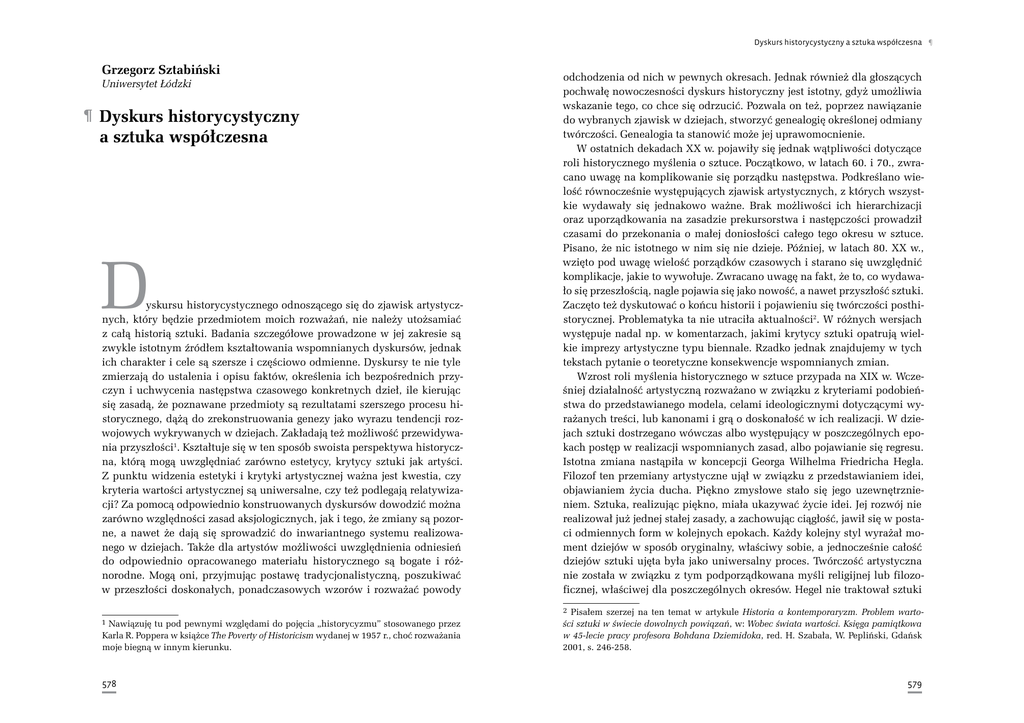 Dyskurs historycystyczny a sztuka współczesna ¶ Grzegorz Sztabiński Uniwersytet Łódzki ¶ Dyskurs historycystyczny a sztuka współczesna D yskursu historycystycznego odnoszącego się do zjawisk artystycznych, który będzie przedmiotem moich rozważań, nie należy utożsamiać z całą historią sztuki. Badania szczegółowe prowadzone w jej zakresie są zwykle istotnym źródłem kształtowania wspomnianych dyskursów, jednak ich charakter i cele są szersze i częściowo odmienne. Dyskursy te nie tyle zmierzają do ustalenia i opisu faktów, określenia ich bezpośrednich przyczyn i uchwycenia następstwa czasowego konkretnych dzieł, ile kierując się zasadą, że poznawane przedmioty są rezultatami szerszego procesu historycznego, dążą do zrekonstruowania genezy jako wyrazu tendencji rozwojowych wykrywanych w dziejach. Zakładają też możliwość przewidywania przyszłości1. Kształtuje się w ten sposób swoista perspektywa historyczna, którą mogą uwzględniać zarówno estetycy, krytycy sztuki jak artyści. Z punktu widzenia estetyki i krytyki artystycznej ważna jest kwestia, czy kryteria wartości artystycznej są uniwersalne, czy też podlegają relatywizacji? Za pomocą odpowiednio konstruowanych dyskursów dowodzić można zarówno względności zasad aksjologicznych, jak i tego, że zmiany są pozorne, a nawet że dają się sprowadzić do inwariantnego systemu realizowanego w dziejach. Także dla artystów możliwości uwzględnienia odniesień do odpowiednio opracowanego materiału historycznego są bogate i różnorodne. Mogą oni, przyjmując postawę tradycjonalistyczną, poszukiwać w przeszłości doskonałych, ponadczasowych wzorów i rozważać powody 1 Nawiązuję tu pod pewnymi względami do pojęcia „historycyzmu” stosowanego przez Karla R. Poppera w książce The Poverty of Historicism wydanej w 1957 r., choć rozważania moje biegną w innym kierunku. 578 odchodzenia od nich w pewnych okresach. Jednak również dla głoszących pochwałę nowoczesności dyskurs historyczny jest istotny, gdyż umożliwia wskazanie tego, co chce się odrzucić. Pozwala on też, poprzez nawiązanie do wybranych zjawisk w dziejach, stworzyć genealogię określonej odmiany twórczości. Genealogia ta stanowić może jej uprawomocnienie. W ostatnich dekadach XX w. pojawiły się jednak wątpliwości dotyczące roli historycznego myślenia o sztuce. Początkowo, w latach 60. i 70., zwracano uwagę na komplikowanie się porządku następstwa. Podkreślano wielość równocześnie występujących zjawisk artystycznych, z których wszystkie wydawały się jednakowo ważne. Brak możliwości ich hierarchizacji oraz uporządkowania na zasadzie prekursorstwa i następczości prowadził czasami do przekonania o małej doniosłości całego tego okresu w sztuce. Pisano, że nic istotnego w nim się nie dzieje. Później, w latach 80. XX w., wzięto pod uwagę wielość porządków czasowych i starano się uwzględnić komplikacje, jakie to wywołuje. Zwracano uwagę na fakt, że to, co wydawało się przeszłością, nagle pojawia się jako nowość, a nawet przyszłość sztuki. Zaczęto też dyskutować o końcu historii i pojawieniu się twórczości posthistorycznej. Problematyka ta nie utraciła aktualności2. W różnych wersjach występuje nadal np. w komentarzach, jakimi krytycy sztuki opatrują wielkie imprezy artystyczne typu biennale. Rzadko jednak znajdujemy w tych tekstach pytanie o teoretyczne konsekwencje wspomnianych zmian. Wzrost roli myślenia historycznego w sztuce przypada na XIX w. Wcześniej działalność artystyczną rozważano w związku z kryteriami podobieństwa do przedstawianego modela, celami ideologicznymi dotyczącymi wyrażanych treści, lub kanonami i grą o doskonałość w ich realizacji. W dziejach sztuki dostrzegano wówczas albo występujący w poszczególnych epokach postęp w realizacji wspomnianych zasad, albo pojawianie się regresu. Istotna zmiana nastąpiła w koncepcji Georga Wilhelma Friedricha Hegla. Filozof ten przemiany artystyczne ujął w związku z przedstawianiem idei, objawianiem życia ducha. Piękno zmysłowe stało się jego uzewnętrznieniem. Sztuka, realizując piękno, miała ukazywać życie idei. Jej rozwój nie realizował już jednej stałej zasady, a zachowując ciągłość, jawił się w postaci odmiennych form w kolejnych epokach. Każdy kolejny styl wyrażał moment dziejów w sposób oryginalny, właściwy sobie, a jednocześnie całość dziejów sztuki ujęta była jako uniwersalny proces. Twórczość artystyczna nie została w związku z tym podporządkowana myśli religijnej lub filozoficznej, właściwej dla poszczególnych okresów. Hegel nie traktował sztuki 2 Pisałem szerzej na ten temat w artykule Historia a kontemporaryzm. Problem wartości sztuki w świecie dowolnych powiązań, w: Wobec świata wartości. Księga pamiątkowa w 45-lecie pracy profesora Bohdana Dziemidoka, red. H. Szabała, W. Pepliński, Gdańsk 2001, s. 246-258. 579 ¶ Grzegorz Sztabiński jako wtórnej, jako odbicie czy wyraz innych rodzajów myśli, lecz przypisywał jej swoistość. Uważał, że jest odrębnym stanem świadomości, ma znaczenie sama przez się i na swój sposób realizuje zasadę postępu – w każdej kolejnej epoce wyraża więcej od dzieł czasów poprzednich. Opisywał też stadia tych przemian wskazując ich kierunek. Brał pod uwagę nie tyle osiągnięcia poszczególnych artystów, co proces dziejowy. Eksponował rolę powszechnej historii sztuki, oceniając z jej perspektywy dokonania lokalne czy indywidualne. Według Lionella Venturi koncepcja Heglowska miała podstawowe znaczenie przy kształtowaniu się idei historii sztuki3. Zakres tego oddziaływania i jego rola były jednak przez innych badaczy różnie oceniane. W bardzo szerokim zakresie ujmował wpływ systemu Heglowskiego Ernst H. Gombrich, chociaż, jak podkreślał, ma dla niego niewiele wyrozumiałości. Myśl niemieckiego fil