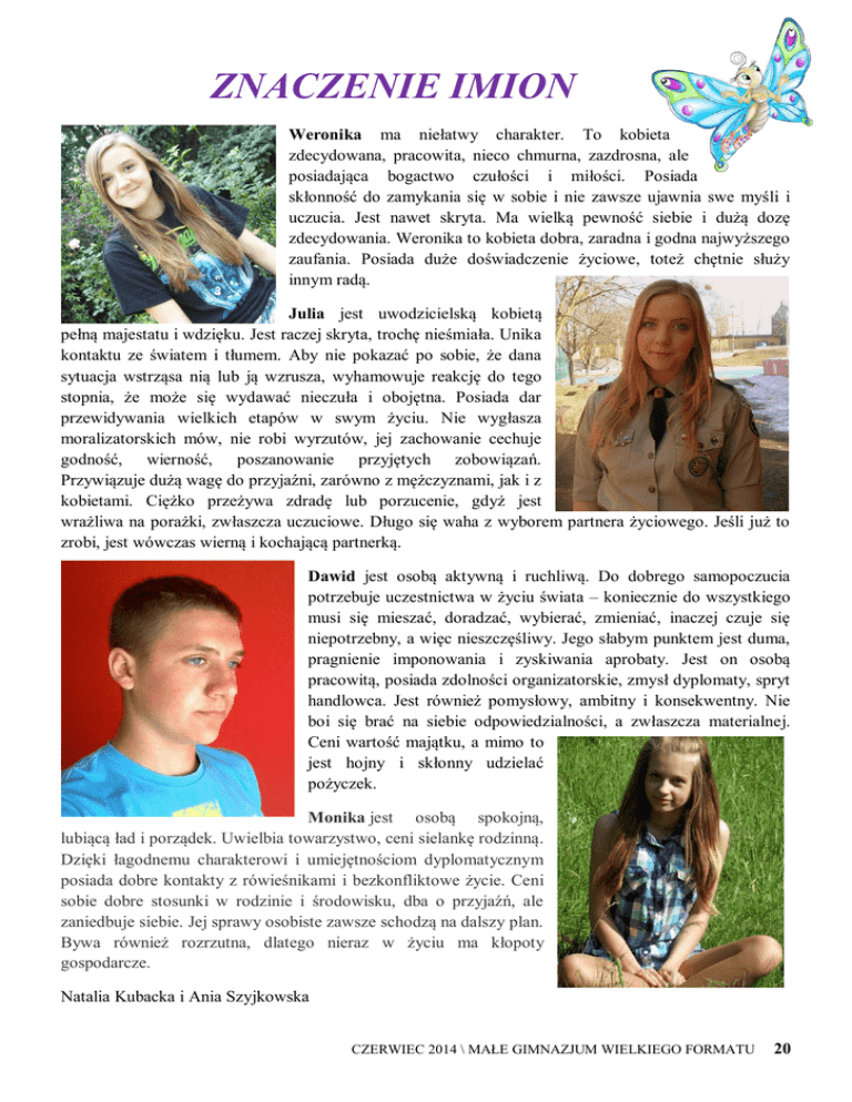 ZNACZENIE IMION Weronika ma niełatwy charakter. To kobieta zdecydowana, pracowita, nieco chmurna, zazdrosna, ale posiadająca bogactwo czułości i miłości. Posiada skłonność do zamykania się w sobie i nie zawsze ujawnia swe myśli i uczucia. Jest nawet skryta. Ma wielką pewność siebie i dużą dozę zdecydowania. Weronika to kobieta dobra, zaradna i godna najwyższego zaufania. Posiada duże doświadczenie życiowe, toteż chętnie służy innym radą. Julia jest uwodzicielską kobietą pełną majestatu i wdzięku. Jest raczej skryta, trochę nieśmiała. Unika kontaktu ze światem i tłumem. Aby nie pokazać po sobie, że dana sytuacja wstrząsa nią lub ją wzrusza, wyhamowuje reakcję do tego stopnia, że może się wydawać nieczuła i obojętna. Posiada dar przewidywania wielkich etapów w swym życiu. Nie wygłasza moralizatorskich mów, nie robi wyrzutów, jej zachowanie cechuje godność, wierność, poszanowanie przyjętych zobowiązań. Przywiązuje dużą wagę do przyjaźni, zarówno z mężczyznami, jak i z kobietami. Ciężko przeżywa zdradę lub porzucenie, gdyż jest wrażliwa na porażki, zwłaszcza uczuciowe. Długo się waha z wyborem partnera życiowego. Jeśli już to zrobi, jest wówczas wierną i kochającą partnerką. Dawid jest osobą aktywną i ruchliwą. Do dobrego samopoczucia potrzebuje uczestnictwa w życiu świata – koniecznie do wszystkiego musi się mieszać, doradzać, wybierać, zmieniać, inaczej czuje się niepotrzebny, a więc nieszczęśliwy. Jego słabym punktem jest duma, pragnienie imponowania i zyskiwania aprobaty. Jest on osobą pracowitą, posiada zdolności organizatorskie, zmysł dyplomaty, spryt handlowca. Jest również pomysłowy, ambitny i konsekwentny. Nie boi się brać na siebie odpowiedzialności, a zwłaszcza materialnej. Ceni wartość majątku, a mimo to jest hojny i skłonny udzielać pożyczek. Monika jest osobą spokojną, lubiącą ład i porządek. Uwielbia towarzystwo, ceni sielankę rodzinną. Dzięki łagodnemu charakterowi i umiejętnościom dyplomatycznym posiada dobre kontakty z rówieśnikami i bezkonfliktowe życie. Ceni sobie dobre stosunki w rodzinie i środowisku, dba o przyjaźń, ale zaniedbuje siebie. Jej sprawy osobiste zawsze schodzą na dalszy plan. Bywa również rozrzutna, dlatego nieraz w życiu ma kłopoty gospodarcze. Natalia Kubacka i Ania Szyjkowska CZERWIEC 2014 \ MAŁE GIMNAZJUM WIELKIEGO FORMATU 20