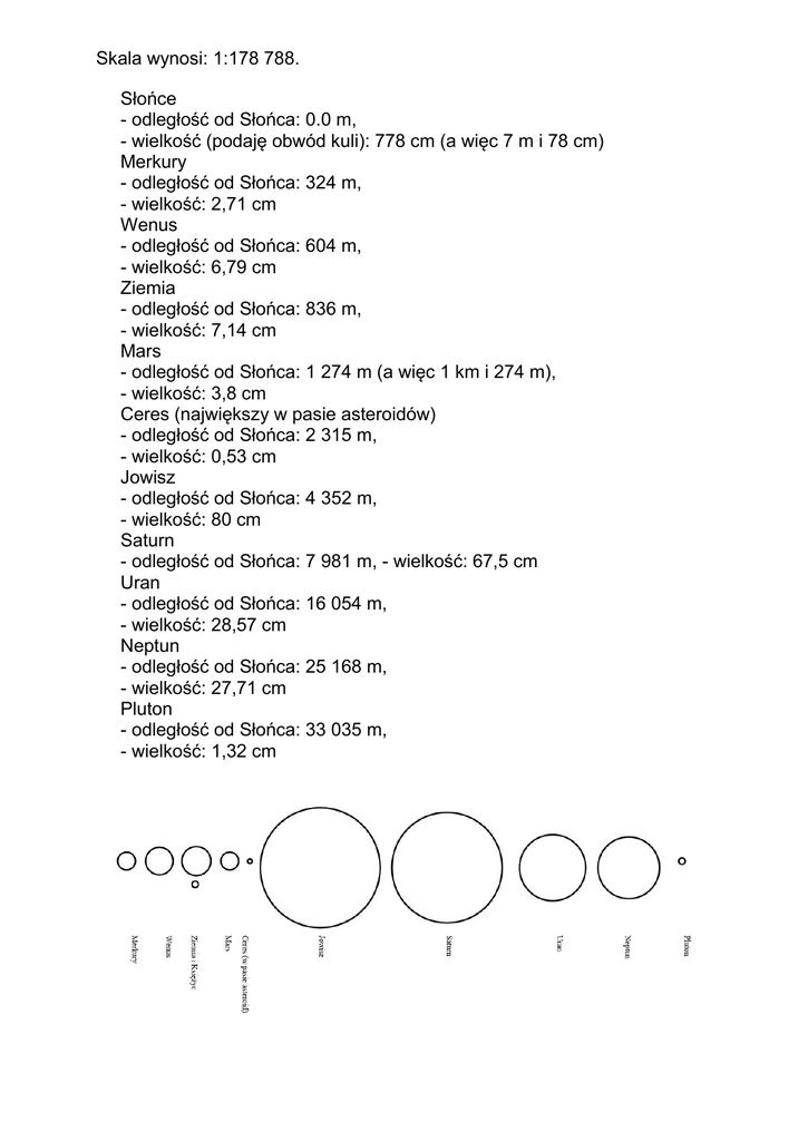 Skala wynosi: 1:178 788. Słońce - odległość od Słońca: 0.0 m, - wielkość (podaję obwód kuli): 778 cm (a więc 7 m i 78 cm) Merkury - odległość od Słońca: 324 m, - wielkość: 2,71 cm Wenus - odległość od Słońca: 604 m, - wielkość: 6,79 cm Ziemia - odległość od Słońca: 836 m, - wielkość: 7,14 cm Mars - odległość od Słońca: 1 274 m (a więc 1 km i 274 m), - wielkość: 3,8 cm Ceres (największy w pasie asteroidów) - odległość od Słońca: 2 315 m, - wielkość: 0,53 cm Jowisz - odległość od Słońca: 4 352 m, - wielkość: 80 cm Saturn - odległość od Słońca: 7 981 m, - wielkość: 67,5 cm Uran - odległość od Słońca: 16 054 m, - wielkość: 28,57 cm Neptun - odległość od Słońca: 25 168 m, - wielkość: 27,71 cm Pluton - odległość od Słońca: 33 035 m, - wielkość: 1,32 cm