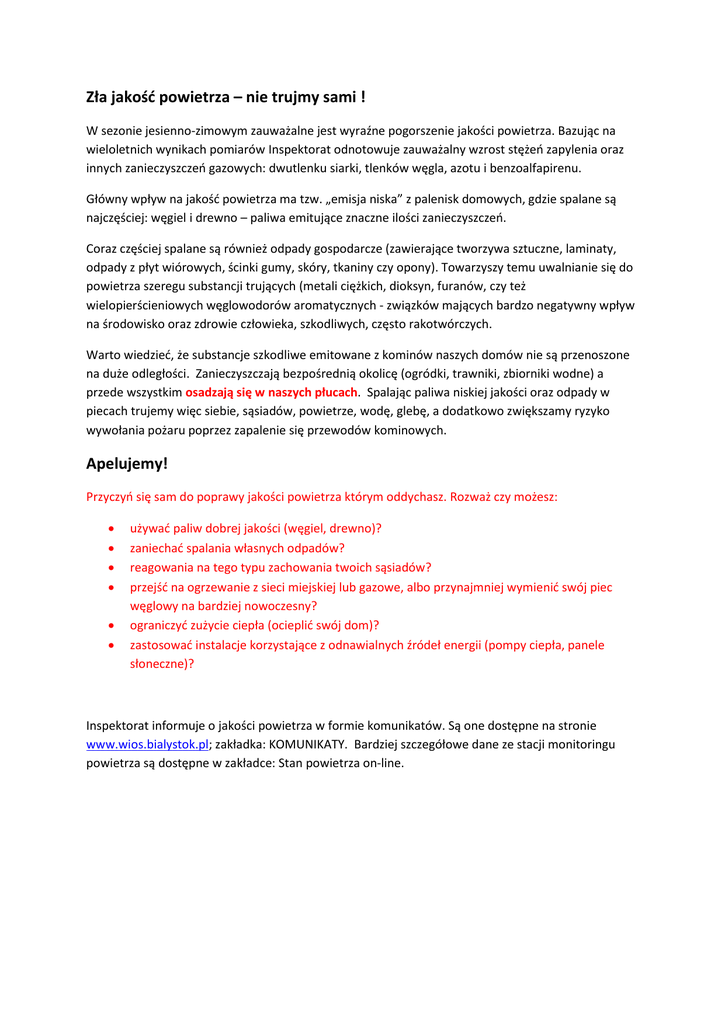 Zła jakość powietrza – nie trujmy sami ! W sezonie jesienno-zimowym zauważalne jest wyraźne pogorszenie jakości powietrza. Bazując na wieloletnich wynikach pomiarów Inspektorat odnotowuje zauważalny wzrost stężeń zapylenia oraz innych zanieczyszczeń gazowych: dwutlenku siarki, tlenków węgla, azotu i benzoalfapirenu. Główny wpływ na jakość powietrza ma tzw. „emisja niska” z palenisk domowych, gdzie spalane są najczęściej: węgiel i drewno – paliwa emitujące znaczne ilości zanieczyszczeń. Coraz częściej spalane są również odpady gospodarcze (zawierające tworzywa sztuczne, laminaty, odpady z płyt wiórowych, ścinki gumy, skóry, tkaniny czy opony). Towarzyszy temu uwalnianie się do powietrza szeregu substancji trujących (metali ciężkich, dioksyn, furanów, czy też wielopierścieniowych węglowodorów aromatycznych - związków mających bardzo negatywny wpływ na środowisko oraz zdrowie człowieka, szkodliwych, często rakotwórczych. Warto wiedzieć, że substancje szkodliwe emitowane z kominów naszych domów nie są przenoszone na duże odległości. Zanieczyszczają bezpośrednią okolicę (ogródki, trawniki, zbiorniki wodne) a przede wszystkim osadzają się w naszych płucach. Spalając paliwa niskiej jakości oraz odpady w piecach trujemy więc siebie, sąsiadów, powietrze, wodę, glebę, a dodatkowo zwiększamy ryzyko wywołania pożaru poprzez zapalenie się przewodów kominowych. Apelujemy! Przyczyń się sam do poprawy jakości powietrza którym oddychasz. Rozważ czy możesz: używać paliw dobrej jakości (węgiel, drewno)? zaniechać spalania własnych odpadów? reagowania na tego typu zachowania twoich sąsiadów? przejść na ogrzewanie z sieci miejskiej lub gazowe, albo przynajmniej wymienić swój piec węglowy na bardziej nowoczesny? ograniczyć zużycie ciepła (ocieplić swój dom)? zastosować instalacje korzystające z odnawialnych źródeł energii (pompy ciepła, panele słoneczne)? Inspektorat informuje o jakości powietrza w formie komunikatów. Są one dostępne na stronie www.wios.bialystok.pl; zakładka: KOMUNIKATY. Bardziej szczegółowe dane ze stacji monitoringu powietrza są dostępne w zakładce: Stan powietrza on-line.