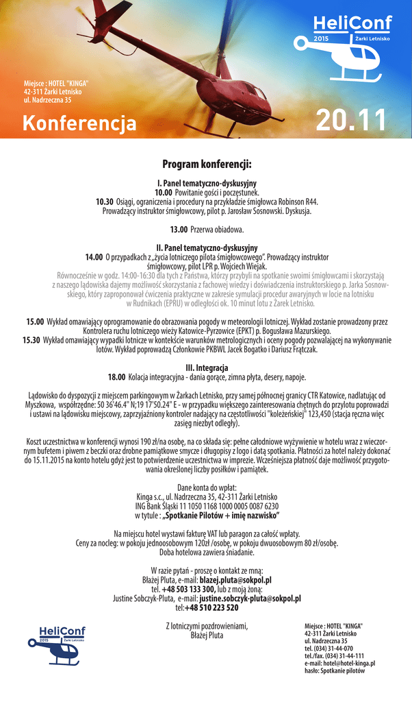 Miejsce : HOTEL "KINGA" 42-311 Żarki Letnisko ul. Nadrzeczna 35 20.11 Konferencja Program konferencji: I. Panel tematyczno-dyskusyjny 10.00 Powitanie gości i poczęstunek. 10.30 Osiągi, ograniczenia i procedury na przykładzie śmigłowca Robinson R44. Prowadzący instruktor śmigłowcowy, pilot p. Jarosław Sosnowski. Dyskusja. 13.00 Przerwa obiadowa. II. Panel tematyczno-dyskusyjny 14.00 O przypadkach z „życia lotniczego pilota śmigłowcowego”. Prowadzący instruktor śmigłowcowy, pilot LPR p. Wojciech Wiejak. Równocześnie w godz. 14:00-16:30 dla tych z Państwa, którzy przybyli na spotkanie swoimi śmigłowcami i skorzystają z naszego lądowiska dajemy możliwość skorzystania z fachowej wiedzy i doświadczenia instruktorskiego p. Jarka Sosnowskiego, który zaproponował ćwiczenia praktyczne w zakresie symulacji procedur awaryjnych w locie na lotnisku w Rudnikach (EPRU) w odległości ok. 10 minut lotu z Żarek Letnisko. 15.00 Wykład omawiający oprogramowanie do obrazowania pogody w meteorologii lotniczej. Wykład zostanie prowadzony przez Kontrolera ruchu lotniczego wieży Katowice-Pyrzowice (EPKT) p. Bogusława Mazurskiego. 15.30 Wykład omawiający wypadki lotnicze w kontekście warunków metrologicznych i oceny pogody pozwalającej na wykonywanie lotów. Wykład poprowadzą Członkowie PKBWL Jacek Bogatko i Dariusz Frątczak. III. Integracja 18.00 Kolacja integracyjna - dania gorące, zimna płyta, desery, napoje. Lądowisko do dyspozycji z miejscem parkingowym w Żarkach Letnisko, przy samej północnej granicy CTR Katowice, nadlatując od Myszkowa, współrzędne: 50 36'46.4" N;19 17'50.24" E - w przypadku większego zainteresowania chętnych do przylotu poprowadzi i ustawi na lądowisku miejscowy, zaprzyjaźniony kontroler nadający na częstotliwości "koleżeńskiej" 123,450 (stacja ręczna więc zasięg niezbyt odległy). Koszt uczestnictwa w konferencji wynosi 190 zł/na osobę, na co składa się: pełne całodniowe wyżywienie w hotelu wraz z wieczornym bufetem i piwem z beczki oraz drobne pamiątkowe smycze i długopisy z logo i datą spotkania. Płatności za hotel należy dokonać do 15.11.2015 na konto hotelu gdyż jest to potwierdzenie uczestnictwa w imprezie. Wcześniejsza płatność daje możliwość przygotowania określonej liczby posiłków i pamiątek. Dane konta do wpłat: Kinga s.c., ul. Nadrzeczna 35, 42-311 Żarki Letnisko ING Bank Śląski 11 1050 1168 1000 0005 0087 6230 w tytule : „Spotkanie Pilotów + imię nazwisko” Na miejscu hotel wystawi fakturę VAT lub paragon za całość wpłaty. Ceny za nocleg: w pokoju jednoosobowym 120zł /osobę, w pokoju dwuosobowym 80 zł/osobę. Doba hotelowa zawiera śniadanie. W razie pytań - proszę o kontakt ze mną: Błażej Pluta, e-mail: [email protected] tel. +48 503 133 300, lub z moją żoną: Justine Sobczyk-Pluta, e-mail: [email protected] tel:+48 510 223 520 Z lotniczymi pozdrowieniami, Błażej Pluta Miejsce : HOTEL "KINGA" 42-311 Żarki Letnisko ul. Nadrzeczna 35 tel. (034) 31-44-070 tel./fax. (034) 31-44-111 e-mail: [email protected] hasło: Spotkanie pilotów