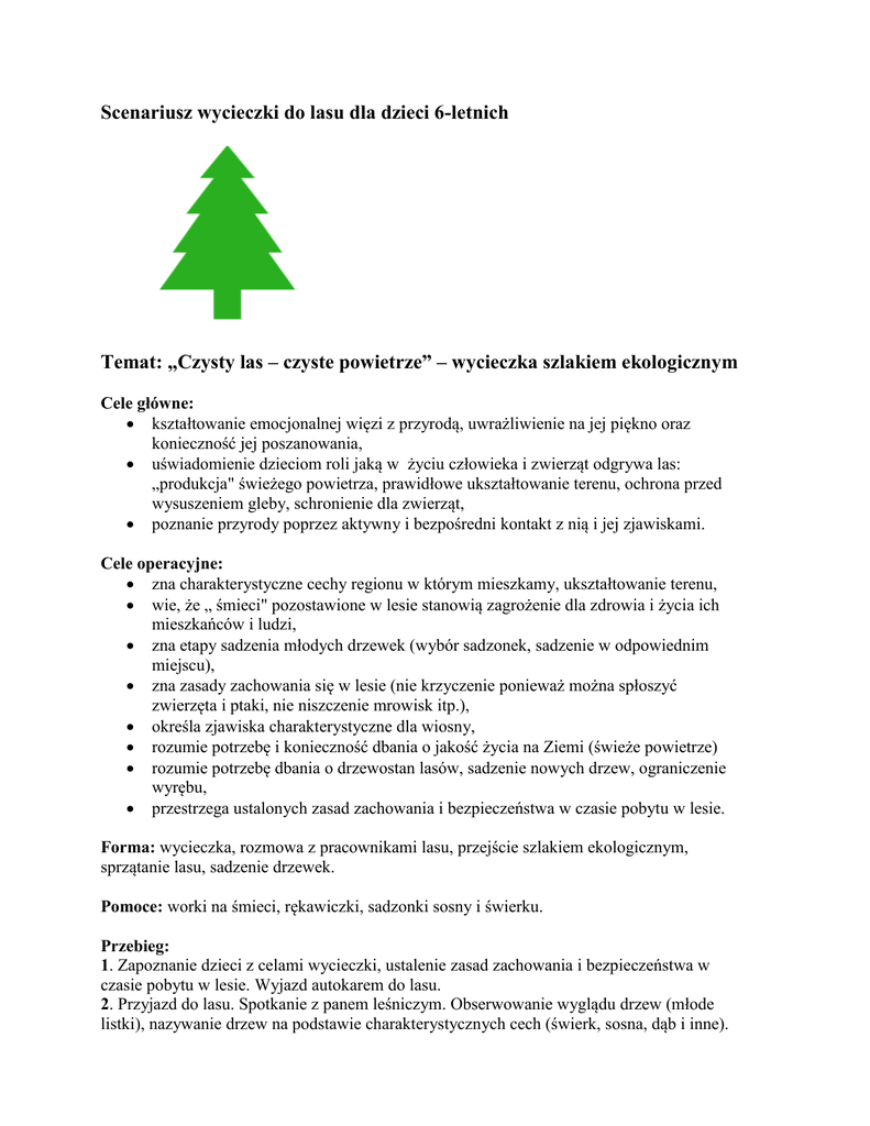 Scenariusz wycieczki do lasu dla dzieci 6-letnich Temat: „Czysty las – czyste powietrze” – wycieczka szlakiem ekologicznym Cele główne: kształtowanie emocjonalnej więzi z przyrodą, uwrażliwienie na jej piękno oraz konieczność jej poszanowania, uświadomienie dzieciom roli jaką w życiu człowieka i zwierząt odgrywa las: „produkcja" świeżego powietrza, prawidłowe ukształtowanie terenu, ochrona przed wysuszeniem gleby, schronienie dla zwierząt, poznanie przyrody poprzez aktywny i bezpośredni kontakt z nią i jej zjawiskami. Cele operacyjne: zna charakterystyczne cechy regionu w którym mieszkamy, ukształtowanie terenu, wie, że „ śmieci" pozostawione w lesie stanowią zagrożenie dla zdrowia i życia ich mieszkańców i ludzi, zna etapy sadzenia młodych drzewek (wybór sadzonek, sadzenie w odpowiednim miejscu), zna zasady zachowania się w lesie (nie krzyczenie ponieważ można spłoszyć zwierzęta i ptaki, nie niszczenie mrowisk itp.), określa zjawiska charakterystyczne dla wiosny, rozumie potrzebę i konieczność dbania o jakość życia na Ziemi (świeże powietrze) rozumie potrzebę dbania o drzewostan lasów, sadzenie nowych drzew, ograniczenie wyrębu, przestrzega ustalonych zasad zachowania i bezpieczeństwa w czasie pobytu w lesie. Forma: wycieczka, rozmowa z pracownikami lasu, przejście szlakiem ekologicznym, sprzątanie lasu, sadzenie drzewek. Pomoce: worki na śmieci, rękawiczki, sadzonki sosny i świerku. Przebieg: 1. Zapoznanie dzieci z celami wycieczki, ustalenie zasad zachowania i bezpieczeństwa w czasie pobytu w lesie. Wyjazd autokarem do lasu. 2. Przyjazd do lasu. Spotkanie z panem leśniczym. Obserwowanie wyglądu drzew (młode listki), nazywanie drzew na podstawie charakterystycznych cech (świerk, sosna, dąb i inne). 3. Rozmowa z panem leśniczym na temat odpowiedniego zachowania się w lesie - nie wolno hałasować ponieważ można spłoszyć zwierzęta, nie należy niszczyć mrowisk ani ptasich gniazd, nie można rozpalać ognia (tylko w wyznaczonych miejscach), po lesie poruszamy się po wyznaczonych drogach. 4. Zwrócenie uwagi na stan zanieczyszczenia lasu. Wspólne sprzątanie wyznaczonego terenu, umieszczenie „śmieci" w workach, złożenie w wyznaczonym miejscu. 5. Wspólnie z rodzicami przejście „szlakiem ekologicznym" (przypomnienie zasad zachowania się podczas marszu wytyczoną i oznaczoną trasą): - obserwacja przyrody, dzielenie się spostrzeżeniami( liczenie drzew, porównywanie ich wysokości, słuchanie odgłosów lasu, - obserwacja mrowiska i pracy mrówek (zwrócenie uwagi na ich krzątaninę i wzorowy porządek wokół), - obserwacja misternie utkanych pajęczyn (dzieci z rodzicami wspólnie podziwiają i fotografują), - zwrócenie uwagi na ślady zwierząt na szlaku, obserwacja ptaków. 6. Spotkanie z pracownikami szkółki leśnej. Rozmowa na temat etapów sadzenia lasu, odpowiedni wybór sadzonek, stwarzanie warunków do ich wzrostu, wyznaczenie miejsca zalesienia. Obserwowanie czynności, które są wykonywane podczas sadzenia drzewek. Posadzenie drzewek przez dzieci i rodziców, indywidualne oznaczenie imieniem i nazwiskiem posadzonego drzewka, fotografowanie posadzonego „lasu". 7. Swobodne rozmowy na temat roli lasów w życiu człowieka i potrzebie ich ochrony. Opowiadanie leśniczego o tym jak o lasy dbają jego pracownicy (stosowanie środków chemicznych do wałki ze szkodnikami, zalesienie nowych terenów, prowadzenie wyrębu zniszczonych drzew itp.) 8. Zapalenie ogniska w specjalnie do tego przeznaczonym miejscu, wspólne pieczenie kiełbasek i ziemniaków, wspólny śpiew piosenek o tematyce ekologicznej oraz podsumowanie spostrzeżeń, wykonanie wspólnej fotografii. 9. Pożegnanie się z leśniczym i powrót do przedszkola. Uzupełnienie: 1 .Po wywołaniu zdjęć dzieci odtworzą kolejność zdarzeń i sporządzą kronikę wycieczki. 2.Wykonają prace plastyczne na temat odbytej wycieczki (dowolna technika). Literatura: Gałczyńska T., „Ten piękny tajemniczy świat", Łada-Grodzicka A., ,,ABC... Program wychowania przedszkolnego XXI wieku". Opracowanie Jolanta Czarnecka i Beata Maksimowicz-Kowalska nauczycielki Przedszkola nr 9 w Lęborku