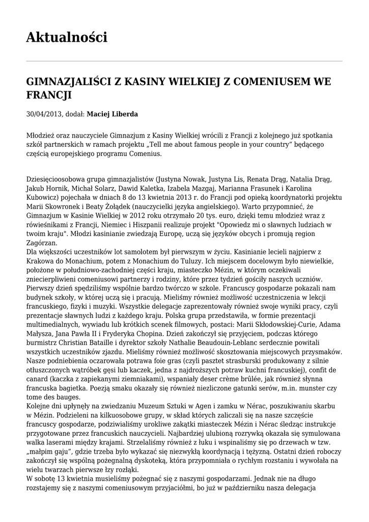 Aktualności GIMNAZJALIŚCI Z KASINY WIELKIEJ Z COMENIUSEM WE FRANCJI 30/04/2013, dodał: Maciej Liberda Młodzież oraz nauczyciele Gimnazjum z Kasiny Wielkiej wrócili z Francji z kolejnego już spotkania szkół partnerskich w ramach projektu „Tell me about famous people in your country” będącego częścią europejskiego programu Comenius. Dziesięcioosobowa grupa gimnazjalistów (Justyna Nowak, Justyna Lis, Renata Drąg, Natalia Drąg, Jakub Hornik, Michał Solarz, Dawid Kaletka, Izabela Mazgaj, Marianna Frasunek i Karolina Kubowicz) pojechała w dniach 8 do 13 kwietnia 2013 r. do Francji pod opieką koordynatorki projektu Marii Skowronek i Beaty Żołądek (nauczycielki języka angielskiego). Warto przypomnieć, że Gimnazjum w Kasinie Wielkiej w 2012 roku otrzymało 20 tys. euro, dzięki temu młodzież wraz z rówieśnikami z Francji, Niemiec i Hiszpanii realizuje projekt "Opowiedz mi o sławnych ludziach w twoim kraju". Młodzi kasinianie zwiedzają Europę, uczą się języków obcych i promują region Zagórzan. Dla większości uczestników lot samolotem był pierwszym w życiu. Kasinianie lecieli najpierw z Krakowa do Monachium, potem z Monachium do Tuluzy. Ich miejscem docelowym było niewielkie, położone w południowo-zachodniej części kraju, miasteczko Mézin, w którym oczekiwali zniecierpliwieni comeniusowi partnerzy i rodziny, które przez tydzień gościły naszych uczniów. Pierwszy dzień spędziliśmy wspólnie bardzo twórczo w szkole. Francuscy gospodarze pokazali nam budynek szkoły, w której uczą się i pracują. Mieliśmy również możliwość uczestniczenia w lekcji francuskiego, fizyki i muzyki. Wszystkie delegacje zaprezentowały również swoje wyniki pracy, czyli prezentacje sławnych ludzi z każdego kraju. Polska grupa przedstawiła, w formie prezentacji multimedialnych, wywiadu lub krótkich scenek filmowych, postaci: Marii Skłodowskiej-Curie, Adama Małysza, Jana Pawła II i Fryderyka Chopina. Dzień zakończył się przyjęciem, podczas którego burmistrz Christian Bataille i dyrektor szkoły Nathalie Beaudouin-Leblanc serdecznie powitali wszystkich uczestników zjazdu. Mieliśmy również możliwość skosztowania miejscowych przysmaków. Nasze podniebienia oczarowała potrawa foie gras (czyli pasztet strasburski produkowany z silnie otłuszczonych wątróbek gęsi lub kaczek, jedna z najdroższych potraw kuchni francuskiej), confit de canard (kaczka z zapiekanymi ziemniakami), wspaniały deser crème brûlée, jak również słynna francuska bagietka. Poezją smaku okazały się również niezliczone gatunki serów, m.in. munster czy tome des bauges. Kolejne dni upłynęły na zwiedzaniu Muzeum Sztuki w Agen i zamku w Nérac, poszukiwaniu skarbu w Mézin. Podzieleni na kilkuosobowe grupy, w skład których zaliczali się na nasze szczęście francuscy gospodarze, podziwialiśmy urokliwe zakątki miasteczek Mézin i Nérac śledząc instrukcje przygotowane przez francuskich nauczycieli. Najbardziej ulubioną rozrywką okazała się symulowana walka laserami między krajami. Strzelaliśmy również z łuku i wspinaliśmy się po drzewach w tzw. „małpim gaju”, gdzie trzeba było wykazać się niezwykłą koordynacją i tężyzną. Ostatni dzień roboczy zakończył się wspólną pożegnalną dyskoteką, która przypomniała o rychłym rozstaniu i wywołała na wielu twarzach pierwsze łzy rozłąki. W sobotę 13 kwietnia musieliśmy pożegnać się z naszymi gospodarzami. Jednak nie na długo rozstajemy się z naszymi comeniusowym przyjaciółmi, bo już w październiku nasza delegacja pojedzie na następne spotkanie projektu, ale tym razem do Niemiec. red. Maria Skowronek zdjęcia