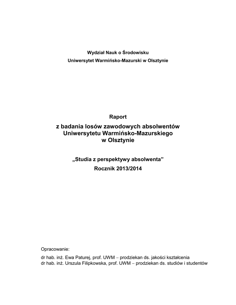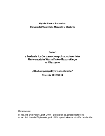 Wydział Nauk o Środowisku Uniwersytet Warmińsko-Mazurski w Olsztynie Raport z badania losów zawodowych absolwentów Uniwersytetu Warmińsko-Mazurskiego w Olsztynie „Studia z perspektywy absolwenta” Rocznik 2013/2014 Opracowanie: dr hab. inż. Ewa Paturej, prof. UWM prodziekan ds. jakości kształcenia dr hab. inż. Urszula Filipkowska, prof. UWM prodziekan ds. studiów i studentów Wstęp Zgodnie z przepisami Zarządzenia Nr 51/2013 Rektora Uniwersytetu WarmińskoMazurskiego w Olsztynie z dnia 31 maja 2013 r. w sprawie określenia obszarów procesu dydaktycznego objętych badaniami ankietowymi, wzorów kwestionariuszy ankiet oraz procedur przeprowadzania badań ankietowych w Uniwersytecie, przeprowadzono badania losów zawodowych absolwentów „Studia z perspektywy absolwenta UWM w Olsztynie”. Celem badania było zebranie informacji o losach zawodowych absolwentów UWM w Olsztynie, w tym Wydziału Nauk o Środowisku, oraz opinii na temat wykorzystania i przydatności w karierze zawodowej absolwentów zdobytej wiedzy, uzyskanych umiejętności i kompetencji, a także pozyskanie informacji na temat zakresów kompetencji, które z perspektywy i doświadczenia zawodowego absolwenta, powinny być rozwijane podczas studiów. Badaniem ilościowym objęci zostali absolwenci rocznika 2013/2014 wszystkich kierunków i form kształcenia realizowanych na Wydziale Nauk o Środowisku, w przedziale czasowym: 6 miesięcy po ukończeniu studiów. Zgodnie z procedurą, właściwej grupie respondentów przesłano drogą e-mailową zaproszenie do udziału w badaniu ankietowym, z prośbą o wypełnienie elektronicznego kwestionariusza ankiety, dostępnego pod adresem linku przesłanego w zaproszeniu. Po upływie tygodnia od pierwszego terminu zaproszenia do udziału w badaniu, ponownie przesłano zaproszenie respondentom, którzy nie wypełnili formularza ankiety. Brak odpowiedzi w ciągu tygodnia na powtórne zaproszenie, uznano za odmowę uczestnictwa w badaniu ankietowym. Prodziekani właściwi ds. kształcenia uzyskali dostęp do wyników dotyczących absolwentów Wydziału oraz instrukcję obsługi programu służącego do analizy i sporządzania sprawozdania. 1. CHARAKTERYSTYKA BADANEJ POPULACJI Studia na Wydziale Nauk o Środowisku w roku akademickim 2013/2014 ukończyło 307 absolwentów. W badaniu wzięło udział 61 respondentów co stanowi 19,9% w tym: 2 absolwentów kierunku rybactwo (6% absolwentów), 13 absolwentów kierunku ochrona środowiska (12,9% absolwentów), 17 absolwentów kierunku inżynieria środowiska (21,5% absolwentów) i 29 absolwentów kierunku turystyka i rekreacja (30,9% absolwentów). Wyk. I. Procentowy udział respondentów w badaniu w zależności od kierunku studiów Najliczniejszą grupę wśród ankietowanych stanowili absolwenci kierunku turystyka i rekreacja. Wśród ankietowanych kobiety stanowiły zdecydowaną większość na kierunku ochrona środowiska oraz turystyka i rekreacja. Mężczyźni zaś zdecydowanie przeważali na kierunku inżynieria środowiska i rybactwo. 2. OCENA POZIOMU WIEDZY, UMIEJĘTNOŚCI I KOMPETENCJI ZDOBYTYCH W TRAKCIE STUDIÓW Poziom zdobytej wiedzy absolwenci ocenili jako przeciętny/wysoki. Natomiast pojedynczy respondenci kierunków inżynieria środowiska oraz turystyka i rekreacja ocenili zdobytą wiedzę nisko. Wyk. II. Ocena poziomu zdobytej wiedzy Respondenci kierunku rybactwo ocenili oceniło zdobyte umiejętności i kompetencje bardzo wysoko i wysoko, natomiast na pozostałych kierunkach umiejętności i kompetencje zostały ocenione wysoko i przeciętni. Jedynie wśród respondentów kierunku turystyka i rekreacja pojawiły się oceny bardzo niskie. Wyk. III. Ocena poziomu zdobytych umiejętności i kompetencji 3. OCENA ROLI BLOKU DYPLOMOWEGO (SEMINARIA, PRACA DYPLOMOWA), WSPÓŁPRACY Z OPIEKUNEM PRACY DYPLOMOWEJ/PROMOTOREM Ponad 50 % absolwentów badanych kierunków oceniło wysoko i bardzo wysoko blok dyplomowy (seminaria i praca dyplomowa). Z tego wynika, że absolwenci widzą dużą role bloku dyplomowego w rozwoju kompetencji tj.: zdolności samokształcenia, aktywizowania do pracy w grupie, umiejętności prowadzenia dyskusji, poszanowania praw autorskich, itp. Analiza wyników badań ankietowych dotyczących poszczególnych kierunków wskazuje, że największy wpływ bloku dyplomowego na rozwijanie własnych kompetencji dostrzegają absolwenci kierunku inżynieria środowiska. Jednocześnie wśród respondentów kierunków: inżynieria środowiska, ochrona środowiska oraz turystyka i rekreacja (z wyjątkiem kierunku rybactwo) pojawiły się oceny niskie i bardzo niskie w przedziale od 13 do 23%. Wyk. IV. Ocena roli bloku dyplomowego w rozwijaniu własnych kompetencji Bardzo wysoko i wysoko tj. powyżej 50 % respondentów kierunku rybactwo i ochrona środowiska oceniło rolę praktyk w rozwijaniu własnych kompetencji. Największe zróżnicowanie w ocenie praktyk studenckich stwierdzono na kierunku inżynieria środowiska oraz turystyka i rekreacja. Oceny bardzo wysokie i wysokie stanowiły odpowiednio: 41 i 27%, oraz niskie i bardzo niskie około 24% na obu kierunkach. Wyk. V. Rola praktyk w rozwijaniu własnych kompetencji Respondenci bardzo wysoko ocenili współpracę z opiekunem podczas realizacji pracy dyplomowej na wszystkich kierunkach kształcenia (50 i ponad 50 %). Jedynie na kierunku inżynieria środowiska około 6% absolwentów oceniło współpracę z promotorem bardzo nisko. Wyk. VI. Ocena współpracy z opiekunem pracy dyplomowej/promotorem 4. OCENA TECHNICZNYCH I ORGANIZACYJNYCH WARUNKÓW STUDIOWANIA Absolwenci Wydziału Nauk o Środowisku ocenili wyposażenie sal dydaktycznych znacznie niżej niż absolwenci rocznika 2012/2013. Wszyscy respondenci kierunku rybactwo wysoko ocenili wyposażenie sal wykładowych przeciętnie. jedynie respondenci kierunku inżynieria środowiska wyrazili pozytywną opinię w ponad 60%. Absolwenci kierunków turystyka i rekreacja oraz ochrona środowiska wyrazili du