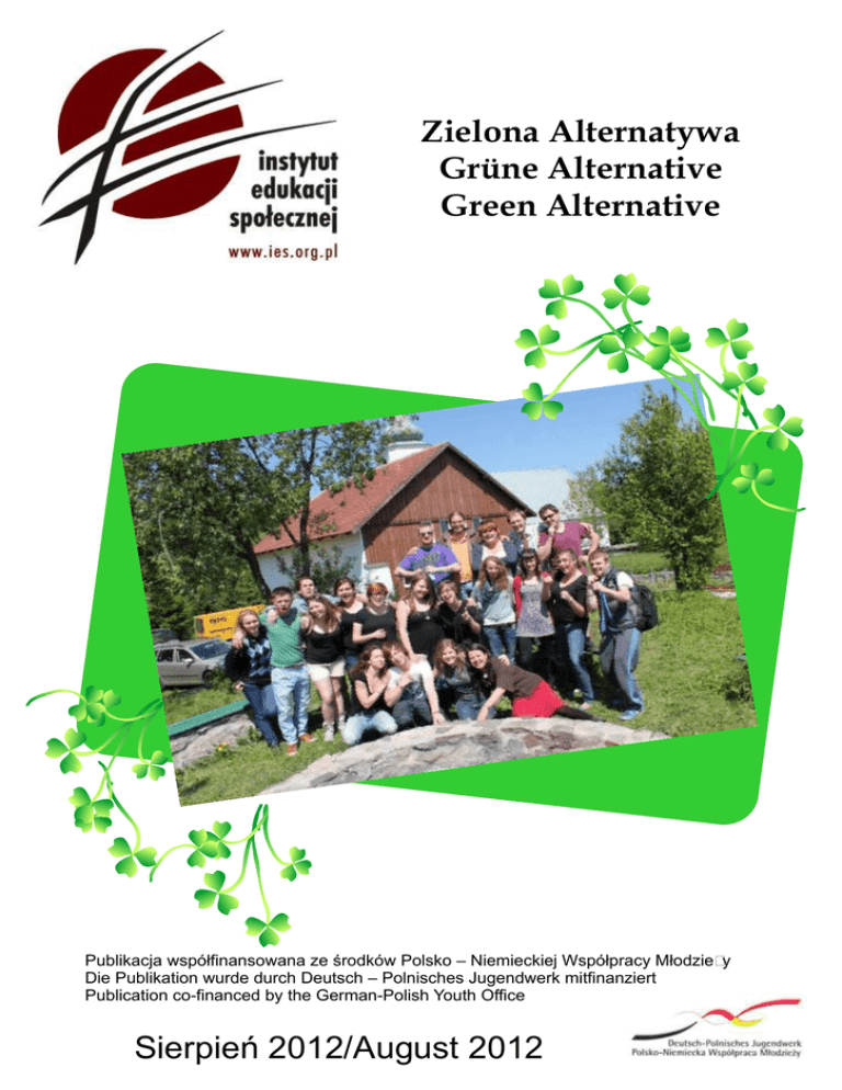 Zielona Alternatywa Grüne Alternative Green Alternative Publikacja współfinansowana ze środków Polsko – Niemieckiej Współpracy Młodzieży Die Publikation wurde durch Deutsch – Polnisches Jugendwerk mitfinanziert Publication co-financed by the German-Polish Youth Office Sierpień 2012/August 2012 SPIS TREŚCI / INHALT / CONTENTS 1. Tytułem wstępu / Einführung / Introduction 2. Okiem specjalisty / Laut Spezialisten A specialists point of view 3. Zielony tydzień / Grüne Woche / Green week 4. Na koniec / Zum Schluss / At the end Tytułem wstępu … / Einführung... / Introduction … Kinga Ekert (Instytut Edukacji Społecznej) „Zielona alternatywa” to polsko – niemiecko – brytyjska wymiana młodzieżowa, która odbyła się w maju 2012 roku w Gniewoszowie, w Polsce. Sześć dni niezapomnianych wrażeń, nowa wiedza, doświadczenia i znajomości. Poruszaliśmy się w sferze zrównoważonego rozwoju. Ta tematyka staje się coraz bardziej modna, zwłaszcza wśród młodych. Coraz więcej osób zauważa również wpływ i bezpośrednie przełożenie różnych jej aspektów na codzienne życie. Jest to związane z troską o przyszłość własną i następnych pokoleń. Z takiej troski i zainteresowania wyrósł nasz projekt. Nikt z nas nie był w tej dziedzinie specjalistą, ale zauważamy potrzebę aby na ten temat rozmawiać. A jeśli w dodatku temat rozmowy może stać się płaszczyzną do spotkania w międzynarodowym gronie i do poznania się, tym bardziej staje się atrakcyjny. Każda z grup narodowościowych przygotowała jedno z zagadnień, które przedstawiła reszcie uczestników. I tak wspólnie próbowaliśmy poznać sens recyklingu próbując nadać przedmiotom „drugie życie”, dowiedzieliśmy się co to jest Slow Food i jak zrobić własny kompostownik oraz na własnej skórze doświadczyliśmy jak wygląda światowy handel. „Zielona Alternatywa” to również (a właściwie przede wszystkim) ludzie! 6 dni to fascynujący proces poznawania się i wymiany. To prawdziwe SPOTKANIE! Próbując odpowiedzieć sobie na pytanie – co po wymianie, prezentujemy tą oto publikację. Pragniemy podzielić się z Wami tym, co odkryliśmy oraz zainspirować do działania. Bądź zielony – zmieniaj siebie – zmieniaj Świat! Grüne Alternative ist ein polnisch-deutsch-britischer Jugendaustausch, der im Mai 2012 in Gniewoschow (Polen) stattfand. Sechs Tagen der unvergesslichen Erlebnisse, neuen Kenntnisse und Bekanntaschaften. Wir haben uns in dem Bereich der ausgeglichenen Entwicklung bewegt. Dieses Thema wird immer popülerer, vor allem unter den Jugendlichen. Immer mehr Menschen bemerkt auch den Einfluss und die unmittelbare Verbindung ihrer verschiedenen Aspekten im Alltag. Diese ausgegliechene Entwicklung ist mit der Sorge sowohl um die eigene, als auch um die Zukunft kommenden Generationen. Aus solchen Sorgen und Interessen ist unser Projekt herangewachsen. Keiner von uns war ein Spezialist in diesem Bereich, jedoch jeder fühlte ein Bedürfniss, daüber zu diskutieren. Und wenn so ein Thema eine Gelegenheit zum Treffen in einem internationalen Kreis sein kann, desto atraktiver ist er. Jeder von den drei Nationalitätsgruppen hat sich mit einem bestimmten Problem beschäftigt, das anschließend allen presäntiert wurde. Und so haben wir versucht den Sinn des Reciklings kennenzulernen, indem wir verschiednen Sachen «ein zweites Leben» geben wollten, wir haben erfährt, was Slow Food ist und wie man ein eigenes Kompost machen kann. Wir haben auch das Wesen des Welthandels über eigene Haut erfahren. ?Grüne Altenative'' bedeutet auch ( und eigentlich vor allem) Menschen! Diese 6 Tage waren ein faszinierendes Prozess des gegenseitigen Kennenlernens und Austausch. Das war ein richtiges TREFFEN. Diese Publkiation ist ein Versuch der Antwort auf die Frage, was nun weiter damit. Wir möchten mit Euch unsere neue Entdeckungen mit Euch teilen und zur Mitwirkung zu inspirieren. Sei grün! - Ändere Menschen! - Ändere Welt! „Green alternative” is polish – german – british youth exchange, that took place In May 2012 in Gniewoszów (village in Poland). It was six days of unforgettable memories, new knowledge, new experiences and estabilishing new contacts. We were exploring area of sustainable development. This subject is trendy nowadays, especially among the youth. More and more people start to see its influence and direct impact on daily life. It is connected with concern about one's future and future of next generations. This concern and interest is what gave birth to our project. None of us is specialist in this domain, but we see need to explore the topic. And if that exploration is a reason to meet an international group of people and get to know each other, then it makes it even more appealing. Group from every country prepared one topic and later on presented it to other participants. Together we tried to grasp the idea of recycling and gave things the “second life”, we learned what Slow Food is and how to make composter, finally we experienced for ourselves what global trade looks like. „Zielona Alternatywa” is also (or especially) people! Six days is a fascinating process of getting to know each other and exchanging experiences. It is a real MEETING! We present this publication hoping to answer a question – what's after the Exchange? We want to share things we discovered with you and inspire you to act. Be green – change yourself – change the World! Okiem specjalisty … / Laut Spezialsten ... A specialists point of view … Kasia Szajda Założycielka Centrum Inicjatyw UNESCO. Koordynatorka projektów edukacyjnych, zarówno na poziomie lokalnym jak i międzynarodowym. Prowadzi szkolenia z zakresu edukacji międzykulturowej, aktywnej partycypacji oraz pracy metodą projektu dla nauczycieli i pracowników naukowych z całej Europy. Pierwszą wymianę młodzieżową zorganizowała w roku 2006. Najważniejszą – „be happy“, w czerw