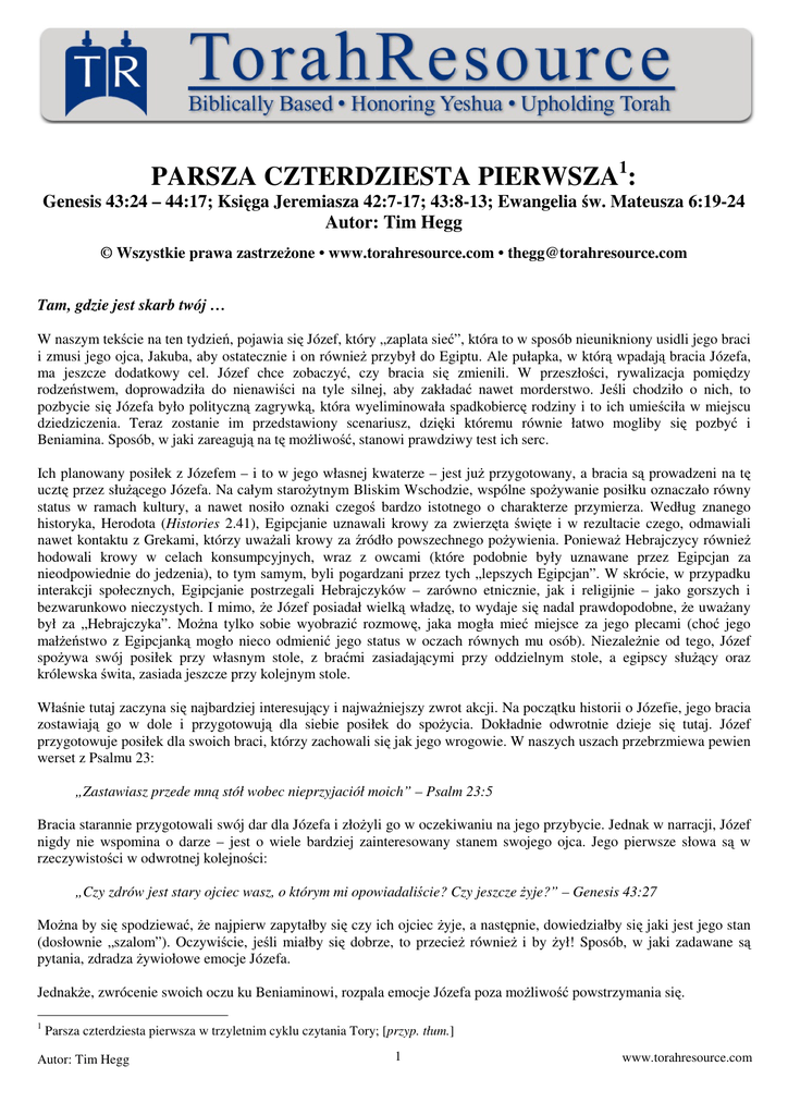 PARSZA CZTERDZIESTA PIERWSZA1: Genesis 43:24 – 44:17; Księga Jeremiasza 42:7-17; 43:8-13; Ewangelia św. Mateusza 6:19-24 Autor: Tim Hegg © Wszystkie prawa zastrzeżone • www.torahresource.com • [email protected] Tam, gdzie jest skarb twój … W naszym tekście na ten tydzień, pojawia się Józef, który „zaplata sieć”, która to w sposób nieunikniony usidli jego braci i zmusi jego ojca, Jakuba, aby ostatecznie i on również przybył do Egiptu. Ale pułapka, w którą wpadają bracia Józefa, ma jeszcze dodatkowy cel. Józef chce zobaczyć, czy bracia się zmienili. W przeszłości, rywalizacja pomiędzy rodzeństwem, doprowadziła do nienawiści na tyle silnej, aby zakładać nawet morderstwo. Jeśli chodziło o nich, to pozbycie się Józefa było polityczną zagrywką, która wyeliminowała spadkobiercę rodziny i to ich umieściła w miejscu dziedziczenia. Teraz zostanie im przedstawiony scenariusz, dzięki któremu równie łatwo mogliby się pozbyć i Beniamina. Sposób, w jaki zareagują na tę możliwość, stanowi prawdziwy test ich serc. Ich planowany posiłek z Józefem – i to w jego własnej kwaterze – jest już przygotowany, a bracia są prowadzeni na tę ucztę przez służącego Józefa. Na całym starożytnym Bliskim Wschodzie, wspólne spożywanie posiłku oznaczało równy status w ramach kultury, a nawet nosiło oznaki czegoś bardzo istotnego o charakterze przymierza. Według znanego historyka, Herodota (Histories 2.41), Egipcjanie uznawali krowy za zwierzęta święte i w rezultacie czego, odmawiali nawet kontaktu z Grekami, którzy uważali krowy za źródło powszechnego pożywienia. Ponieważ Hebrajczycy również hodowali krowy w celach konsumpcyjnych, wraz z owcami (które podobnie były uznawane przez Egipcjan za nieodpowiednie do jedzenia), to tym samym, byli pogardzani przez tych „lepszych Egipcjan”. W skrócie, w przypadku interakcji społecznych, Egipcjanie postrzegali Hebrajczyków – zarówno etnicznie, jak i religijnie – jako gorszych i bezwarunkowo nieczystych. I mimo, że Józef posiadał wielką władzę, to wydaje się nadal prawdopodobne, że uważany był za „Hebrajczyka”. Można tylko sobie wyobrazić rozmowę, jaka mogła mieć miejsce za jego plecami (choć jego małżeństwo z Egipcjanką mogło nieco odmienić jego status w oczach równych mu osób). Niezależnie od tego, Józef spożywa swój posiłek przy własnym stole, z braćmi zasiadającymi przy oddzielnym stole, a egipscy służący oraz królewska świta, zasiada jeszcze przy kolejnym stole. Właśnie tutaj zaczyna się najbardziej interesujący i najważniejszy zwrot akcji. Na początku historii o Józefie, jego bracia zostawiają go w dole i przygotowują dla siebie posiłek do spożycia. Dokładnie odwrotnie dzieje się tutaj. Józef przygotowuje posiłek dla swoich braci, którzy zachowali się jak jego wrogowie. W naszych uszach przebrzmiewa pewien werset z Psalmu 23: „Zastawiasz przede mną stół wobec nieprzyjaciół moich” – Psalm 23:5 Bracia starannie przygotowali swój dar dla Józefa i złożyli go w oczekiwaniu na jego przybycie. Jednak w narracji, Józef nigdy nie wspomina o darze – jest o wiele bardziej zainteresowany stanem swojego ojca. Jego pierwsze słowa są w rzeczywistości w odwrotnej kolejności: „Czy zdrów jest stary ojciec wasz, o którym mi opowiadaliście? Czy jeszcze żyje?” – Genesis 43:27 Można by się spodziewać, że najpierw zapytałby się czy ich ojciec żyje, a następnie, dowiedziałby się jaki jest jego stan (dosłownie „szalom”). Oczywiście, jeśli miałby się dobrze, to przecież również i by żył! Sposób, w jaki zadawane są pytania, zdradza żywiołowe emocje Józefa. Jednakże, zwrócenie swoich oczu ku Beniaminowi, rozpala emocje Józefa poza możliwość powstrzymania się. 1 Parsza czterdziesta pierwsza w trzyletnim cyklu czytania Tory; [przyp. tłum.] Autor: Tim Hegg 1 www.torahresource.com Józef: „Wzruszył się do głębi widokiem brata swego” – Genesis 43:30, dosłownie: „Jego litość była rozgrzana, wezbrała” (por. I Księga Królewska 3:26), i tylko łzy mogły przynieść ulgę. Dlatego spiesznie opuszcza to pomieszczenie, aby zapłakać na osobności. Po raz kolejny narracja pokazuje nam obraz wnętrza Józefa. Po tych wszystkich trudnościach, pozostaje człowiekiem miłosierdzia. Z powodu wyrządzonego mu zła, jego serce nie stało się zatwardziałe, ale pozostało zdolne do prawdziwego współczucia oraz miłości. W naszym nowoczesnym społeczeństwie, męskość cechuje stoicyzm, niewzruszenie oraz brak emocji. Łzy nie przystoją prawdziwemu mężczyźnie. Jednak w rzeczywistości, prawdą jest odwrotność tego. Mężczyzna uczuciowy i dojrzały, to mężczyzna na tyle silny, aby zapłakać – mężczyzna zdolny do okazania prawdziwego współczucia. Widzimy tę samą męską siłę w naszym Mistrzu. Przygnieciony przez śmierć Swojego przyjaciela Łazarza, zapłakał. „I zapłakał Jezus” – Ewangelia św. Jana 11:35 Jako mężczyźni, musimy odrzucić fałszywy obraz męskości, przedstawiany nam przez nasze „postawione na głowie” społeczeństwo, i ponownie ustanowić oraz przywrócić mężczyzn takich, jak Józef i Jeszua jako naszych bohaterów do naśladowania. Delikatne współczucie, które przejawia się w prawdziwych emocjach, jest bardzo męską rzeczą. I odwrotnie, gniew, który zdaje się cechować wielu mężczyzn w naszym społeczeństwie, to w rzeczywistości słabość, która poświadcza o żałosnym egocentryzmie łatwo wykorzystywanym przez szatana. W naszej opowieści, Józef musiał zapłakać na osobności, ponieważ jeszcze nie mógł ujawnić swojej tożsamości. Jego godzina jeszcze nie nadeszła. Zatem, po obmyciu swojej twarzy i odzyskaniu spokoju, powraca do miejsca, gdzie podawany był posiłek i daje komendę do rozpoczęcia uczty. Oczywiście poinstruował swoje sługi co do kolejności w jakiej jego brac