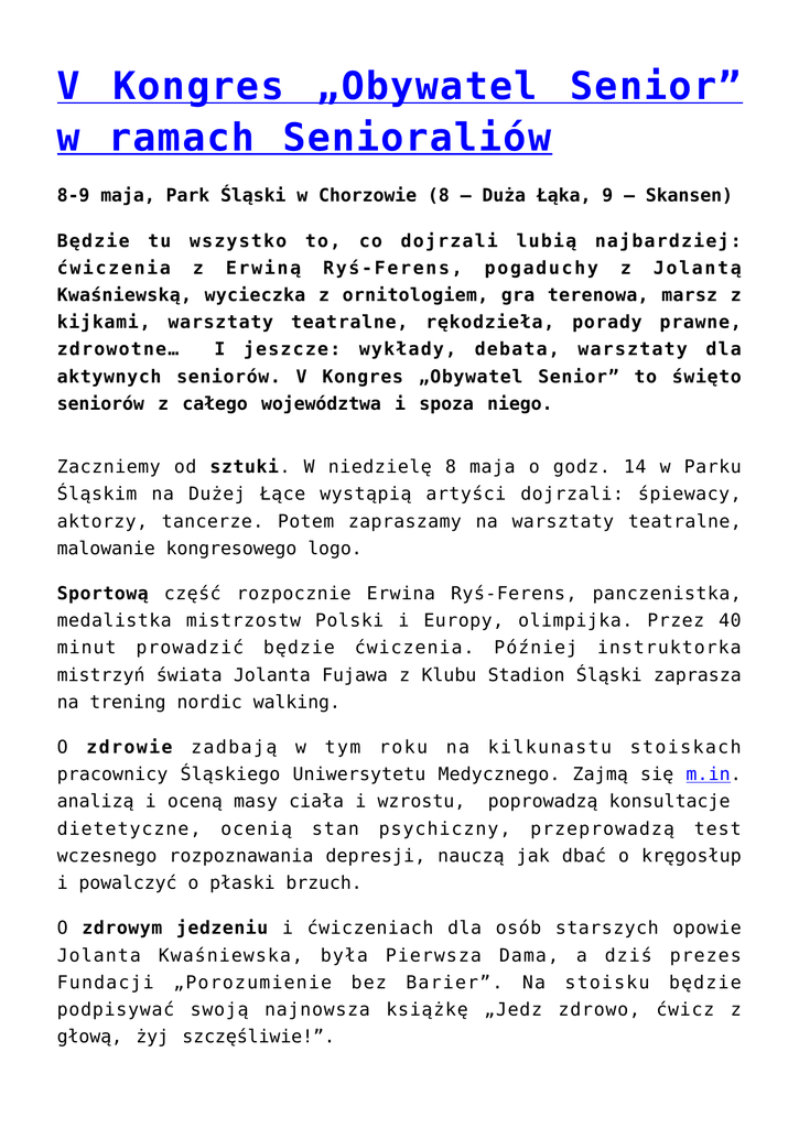 V Kongres „Obywatel Senior” w ramach Senioraliów 8-9 maja, Park Śląski w Chorzowie (8 – Duża Łąka, 9 – Skansen) Będzie tu wszystko to, co dojrzali lubią najbardziej: ćwiczenia z Erwiną Ryś-Ferens, pogaduchy z Jolantą Kwaśniewską, wycieczka z ornitologiem, gra terenowa, marsz z kijkami, warsztaty teatralne, rękodzieła, porady prawne, zdrowotne… I jeszcze: wykłady, debata, warsztaty dla aktywnych seniorów. V Kongres „Obywatel Senior” to święto seniorów z całego województwa i spoza niego. Zaczniemy od sztuki. W niedzielę 8 maja o godz. 14 w Parku Śląskim na Dużej Łące wystąpią artyści dojrzali: śpiewacy, aktorzy, tancerze. Potem zapraszamy na warsztaty teatralne, malowanie kongresowego logo. Sportową część rozpocznie Erwina Ryś-Ferens, panczenistka, medalistka mistrzostw Polski i Europy, olimpijka. Przez 40 minut prowadzić będzie ćwiczenia. Później instruktorka mistrzyń świata Jolanta Fujawa z Klubu Stadion Śląski zaprasza na trening nordic walking. O zdrowie zadbają w tym roku na kilkunastu stoiskach pracownicy Śląskiego Uniwersytetu Medycznego. Zajmą się m.in. analizą i oceną masy ciała i wzrostu, poprowadzą konsultacje dietetyczne, ocenią stan psychiczny, przeprowadzą test wczesnego rozpoznawania depresji, nauczą jak dbać o kręgosłup i powalczyć o płaski brzuch. O zdrowym jedzeniu i ćwiczeniach dla osób starszych opowie Jolanta Kwaśniewska, była Pierwsza Dama, a dziś prezes Fundacji „Porozumienie bez Barier”. Na stoisku będzie podpisywać swoją najnowsza książkę „Jedz zdrowo, ćwicz z głową, żyj szczęśliwie!”. Będą też stoiska z rękodziełem (zrób sobie – pod okiem specjalistki – bransoletkę, broszkę, origami, haft matematyczny), porady (prawo, bezpieczeństwo, emerytury, pomoc społeczna), pasjonujące doświadczenia, treningi z psami, symulator wypadków, wycieczki i gra terenowa po atrakcyjnych miejscach Parku i posiłek na Kartę Seniora, czyli… dowód osobisty dla osoby przynajmniej 60-letniej. Poniedziałek zaczniemy w Skansenie roboczo: od warsztatów prawnych, dla rad seniorów i dla liderów. W ramach bloku Gminy Przyjazne Seniorom posłuchamy m.in. gości z Kraju Basków, którzy opowiedzą o projektach dla seniorów, wyników ankiet dotyczących warunków życia seniorów w naszym województwie oraz pomysłów na działania dla seniorów z całej Polski. O certyfikat Gmina Przyjazna Seniorom starają się w tym roku gminy z całej Polski. Kto dostanie wyróżnienie – okaże się w poniedziałek ok. godz. 14. Gminy pochwaliły się: zaprojektowanym przez seniorów parkiem z szachami, siłownią, torem do gry w boule; bezpłatnymi szczepienia przeciw różnym chorobom; gminną bezpłatna wypożyczalnia sprzętu rehabilitacji, imprezami, wycieczkami, szkoleniami… do Będzie też naukowo. Seks po sześćdziesiątce – czy skazany jest na emeryturę? O tym opowie prof. Violeta Skrzypulec-Plinta ze Śląskiego Uniwersytetu Medycznego w poniedziałek 9 maja o godz. 10.30 w Skansenie. A o tym, czy bakterie chorują, są nieśmiertelne, uprawiają seks – dr Aleksandra ZiembińskaBuczyńska z Politechniki Śląskiej (godz. 16.30). Wszystkie wydarzenia, atrakcje Kongresu są bezpłatne. Kontakt: Ewa Kulisz, [email protected], 666 031 514 Cały program, wszystkie informacje, formularz zgłoszeniowy na www.obywatelsenior.pl