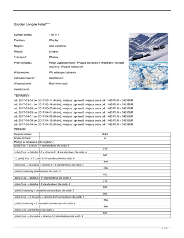 Garden Livigno Hotel*** Symbol oferty: 115/111 Państwo: Włochy Region: Alta Valtellina Miasto: Livigno Transport: Własny Profil wyjazdu: Pobyt wypoczynkowy, Wyjazd dla dzieci i młodzieży, Wyjazd Wyżywienie: We własnym zakresie Zakwaterowanie: Apartament Wyposażenie: Brak informacji rodzinny, Wyjazd narciarski świadczenia: TERMINY: od: 2017-03-04 do: 2017-03-11 (8 dni), miejsca: sprawdź miejsca cena od: 1485 PLN = 342 EUR od: 2017-03-11 do: 2017-03-18 (8 dni), miejsca: sprawdź miejsca cena od: 1485 PLN = 342 EUR od: 2017-03-18 do: 2017-03-25 (8 dni), miejsca: sprawdź miejsca cena od: 1485 PLN = 342 EUR od: 2017-03-25 do: 2017-04-01 (8 dni), miejsca: sprawdź miejsca cena od: 1485 PLN = 342 EUR od: 2017-04-01 do: 2017-04-08 (8 dni), miejsca: sprawdź miejsca cena od: 1485 PLN = 342 EUR od: 2017-04-08 do: 2017-04-15 (8 dni), miejsca: sprawdź miejsca cena od: 1485 PLN = 342 EUR od: 2017-04-15 do: 2017-04-22 (8 dni), miejsca: sprawdź miejsca cena od: 1485 PLN = 342 EUR CENNIK: Długość pobytu: 8 dni Grupa cenowa: A Pobyt w obiekcie (do wyboru) pokój 2-os. + dziecko 0-1 standardowo dla osób: 3 pokój 2-os. + dziecko 0-2 + dziecko 2-14 standardowo dla osób: 4 (*) pokój 2-os. + 2 dzieci 2-14 standardowo dla osób: 4 pokój 2os. + dostawka + dziecko 2-14 standardowo dla osób: 4 pokój 2-osobowy standardowo dla osób: 2 pokój 2-os. + dziecko 6-14 standardowo dla osób: 3 pokój 3-os. + dziecko 0-2 standardowo dla osób: 4 pokój 2-osobowy + dostawka standardowo dla osób: 3 pokój 2-os. + 2 dostawki + dziecko 0-2 standardowo dla osób: 4 pokój 2-osobowy + 2 dostawki standardowo dla osób: 4 pokój 3-os. standardowo dla osób: 3 pokój 2-os. + dostawka + dziecko 0-3 standardowo dla osób: 4 470 667 1340 1050 450 742 890 900 1280 1280 880 1/2 Bilety karnet narciarski 6-dniowy dorosły (*) ---bez karnetu narciarskiego--karnet narciarski 6-dniowy senior karnet narciarski dziecko do 14 lat Ubezpieczenie (do wyboru) ubezpieczenie NW, KL, SKI (*) ubezpieczenie NW, KL Ubezpieczenie (opcjonalne) ubezpieczenie kosztów rezygnacji 920 (-) (-) 175 140 15 7 2.5 % Waluta: EUR Aktualne ceny z systemu S.A.R.T. (-) - cena usługi, podatku kalkulowana przy osobie lub gratis (*) - kwota wliczona w cenę standardową 2/2