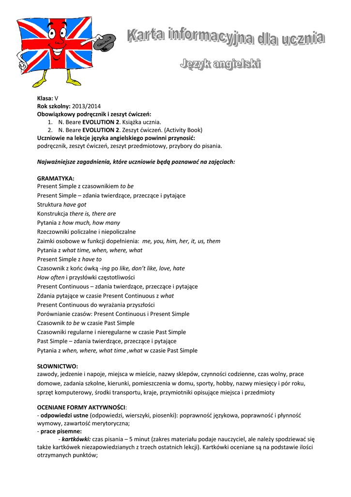 Klasa: V Rok szkolny: 2013/2014 Obowiązkowy podręcznik i zeszyt ćwiczeń: 1. N. Beare EVOLUTION 2. Książka ucznia. 2. N. Beare EVOLUTION 2. Zeszyt ćwiczeń. (Activity Book) Uczniowie na lekcje języka angielskiego powinni przynosić: podręcznik, zeszyt ćwiczeń, zeszyt przedmiotowy, przybory do pisania. Najważniejsze zagadnienia, które uczniowie będą poznawać na zajęciach: GRAMATYKA: Present Simple z czasownikiem to be Present Simple – zdania twierdzące, przeczące i pytające Struktura have got Konstrukcja there is, there are Pytania z how much, how many Rzeczowniki policzalne i niepoliczalne Zaimki osobowe w funkcji dopełnienia: me, you, him, her, it, us, them Pytania z what time, when, where, what Present Simple z have to Czasownik z końc ówką -ing po like, don’t like, love, hate How often i przysłówki częstotliwości Present Continuous – zdania twierdzące, przeczące i pytające Zdania pytające w czasie Present Continuous z what Present Continuous do wyrażania przyszłości Porównianie czasów: Present Continuous i Present Simple Czasownik to be w czasie Past Simple Czasowniki regularne i nieregularne w czasie Past Simple Past Simple – zdania twierdzące, przeczące i pytające Pytania z when, where, what time ,what w czasie Past Simple SŁOWNICTWO: zawody, jedzenie i napoje, miejsca w mieście, nazwy sklepów, czynności codzienne, czas wolny, prace domowe, zadania szkolne, kierunki, pomieszczenia w domu, sporty, hobby, nazwy miesięcy i pór roku, sprzęt komputerowy, środki transportu, kraje, przymiotniki opisujące miejsca i przedmioty OCENIANE FORMY AKTYWNOŚCI: - odpowiedzi ustne (odpowiedzi, wierszyki, piosenki): poprawność językowa, poprawność i płynność wymowy, zawartość merytoryczna; - prace pisemne: - kartkówki: czas pisania – 5 minut (zakres materiału podaje nauczyciel, ale należy spodziewać się także kartkówek niezapowiedzianych z trzech ostatnich lekcji). Kartkówki oceniane są na podstawie ilości otrzymanych punktów; - testy: czas pisania – 45 minut (sprawdzają znajomość wyraźnie określonej partii programu nauczania). Test jest zapowiedziany co najmniej tydzień wcześniej. Poprawiony test nauczyciel zwraca w terminie do dwóch tygodni. Nieobecność ucznia na teście zobowiązuje go do zaliczenia danej partii materiału w terminie wyznaczonym przez nauczyciela. Testy oceniane są na podstawie ilości otrzymanych punktów; - aktywność podczas lekcji: czynny udział w wykonywaniu zadań wskazanych przez nauczyciela wyraża się otrzymaniem plusa. W sytuacji, gdy uczeń nie bierze udziału w lekcji (jest nieprzygotowany, nie uważa na lekcji, nie wykonuje zadanych ćwiczeń, nie robi notatek podawanych przez nauczyciela, przeszkadza innym), otrzymuje minus. Za pięć plusów uczeń otrzymuje ocenę bardzo dobrą. Pięć minusów oznacza ocenę niedostateczną z aktywności na lekcji; - zadania domowe: nauczyciel sprawdza pracę domową u wybranych uczniów, oceniając ją; - projekty i prace tematyczne, indywidualne lub zespołowe: wykonywane są na lekcji lub w domu, przynajmniej raz w semestrze. Każdy z uczniów w danej grupie projektowej powinien wykazać się takim samym wkładem pracy, aby otrzymać ocenę za wykonane zadanie; - zeszyt ćwiczeń: uczeń zobowiązany jest do starannego prowadzenia zeszytu ćwiczeń i wykonywania w nim zadań wskazanych przez nauczyciela; - zeszyt przedmiotowy – uczeń zobowiązany jest do starannego prowadzenia zeszytu przedmiotowego oraz systematycznego wykonywania notatek. Postanowienia końcowe: Przy ustalaniu oceny końcowej bierze się pod uwagę oceny cząstkowe zgodnie z Zasadami Oceniania zawartymi w Statucie SP nr 6 w Oleśnicy.
