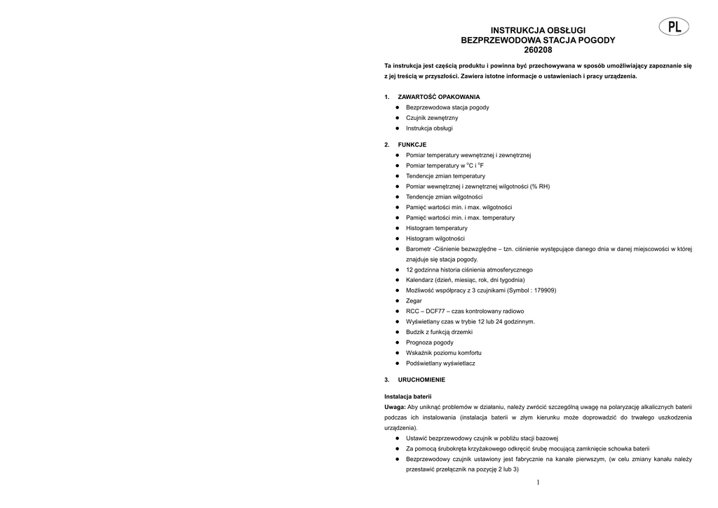 INSTRUKCJA OBSŁUGI BEZPRZEWODOWA STACJA POGODY 260208 Ta instrukcja jest częścią produktu i powinna być przechowywana w sposób umożliwiający zapoznanie się z jej treścią w przyszłości. Zawiera istotne informacje o ustawieniach i pracy urządzenia. 1. ZAWARTOŚĆ OPAKOWANIA Bezprzewodowa stacja pogody Czujnik zewnętrzny Instrukcja obsługi 2. FUNKCJE Pomiar temperatury wewnętrznej i zewnętrznej o o Pomiar temperatury w C i F Tendencje zmian temperatury Pomiar wewnętrznej i zewnętrznej wilgotności (% RH) Tendencje zmian wilgotności Pamięć wartości min. i max. wilgotności Pamięć wartości min. i max. temperatury Histogram temperatury Histogram wilgotności Barometr -Ciśnienie bezwzględne – tzn. ciśnienie występujące danego dnia w danej miejscowości w której znajduje się stacja pogody. 12 godzinna historia ciśnienia atmosferycznego Kalendarz (dzień, miesiąc, rok, dni tygodnia) Możliwość współpracy z 3 czujnikami (Symbol : 179909) Zegar RCC – DCF77 – czas kontrolowany radiowo Wyświetlany czas w trybie 12 lub 24 godzinnym. Budzik z funkcją drzemki Prognoza pogody Wskaźnik poziomu komfortu Podświetlany wyświetlacz 3. URUCHOMIENIE Instalacja baterii Uwaga: Aby uniknąć problemów w działaniu, należy zwrócić szczególną uwagę na polaryzację alkalicznych baterii podczas ich instalowania (instalacja baterii w złym kierunku może doprowadzić do trwałego uszkodzenia urządzenia). Ustawić bezprzewodowy czujnik w pobliżu stacji bazowej Za pomocą śrubokręta krzyżakowego odkręcić śrubę mocującą zamknięcie schowka baterii Bezprzewodowy czujnik ustawiony jest fabrycznie na kanale pierwszym, (w celu zmiany kanału należy przestawić przełącznik na pozycję 2 lub 3) 1 WARUNKI GWARANCJI Włożyć dwie baterie AAA (LR03) do bezprzewodowego czujnika. Nacisnąć przycisk C/F w celu zmiany jednostki wyświetlania temperatury Otworzyć pokrywę baterii znajdującą się na tylnej części stacji bazowej Włożyć dwie baterie AAA do stacji pogody. Po włożeniu baterii do stacji pogody słychać będzie krótki dźwięk i zapalą się na 3 s wszystkie segmenty wyświetlacza LCD. Stacja rozpocznie synchronizację z bezprzewodowym czujnikiem. Uwaga: Istnieje konieczność ręcznego ustawienia wartości ciśnienia bezwzględnego panującego na danym terenie (można je sprawdzić w internecie lub w lokalnej stacji METEO). Po uruchomieniu stacji wartość ciśnienia zacznie migać, naciskając przyciski UP lub DOWN ustawić początkową wartość. Zatwierdzić ustawienia przyciskiem HISTORY. Od tego momentu stacja będzie wskazywała aktualne ciśnienie w odniesieniu do ustawionej wartości początkowej. Zamknąć pokrywę baterii w stacji bazowej. W celu przyśpieszenia synchronizacji stacji bazowej z czujką należy nacisnąć przycisk TEST znajdujący się na czujniku. Poczekać do 3 minut aż pojawią się na wyświetlaczu odczyty z zewnętrznego czujnika bezprzewodowego UWAGA: Nie naciskać żadnych przycisków przed pojawieniem się zewnętrznych wskazań. Zamknąć pokrywę baterii w czujniku bezprzewodowym. Aby odczytywać zewnętrzną temperaturę należy umieścić czujnik na zewnątrz pomieszczenia. Czujnik będzie mierzył i wysyłał zarejestrowane wartości z miejsca, w którym jest zamontowany. Każdorazowo, gdy w czujniku zewnętrznym wymieniane są baterie, do stacji wysyłany jest losowy kod ochronny. Powinna nastąpić automatyczna synchronizacja obu urządzeń. Zaleca się jednak, aby w przypadku wymiany 1. Niniejsza gwarancja jest udzielana przez firmę BIOWIN Sp. z o.o. z siedzibą przy ul. Pryncypalnej 129/141; 93-373 Łódź - Polska, nazywaną w dalszej części gwarancji Gwarantem. 2. Niniejsza gwarancja dotyczy wyłącznie sprzętu używanego na terytorium Polski. 3. Okres gwarancji wynosi 12 miesięcy od daty zakupu sprzętu. 4. W przypadku wad uniemożliwiających korzystanie ze sprzętu okres gwarancji ulega przedłużeniu o czas od dnia zgłoszenia wady do dnia wykonania naprawy. 5. Gwarancja uprawnia do bezpłatnych napraw nabytego sprzętu, polegających na usunięciu wad fizycznych, które ujawniły się w okresie gwarancyjnym, z zastrzeżeniem punktu 9. 6. Zgłoszenie wady sprzętu powinno zawierać: • dowód zakupu towaru; • nazwę i model towaru; • datę sprzedaży (bez skreśleń i poprawek); • podpis i pieczątkę sprzedawcy. 7. Gwarant w terminie 14 dni roboczych od daty zgłoszenia wady ustosunkuje się do zgłoszonej reklamacji. Jeżeli do dokonania naprawy wystąpi konieczność sprowadzenia części zamiennych z zagranicy termin naprawy może ulec przedłużeniu do czasu sprowadzenia niezbędnej elementów, lecz maksymalnie do 30 dni roboczych od daty otrzymania towaru do naprawy. 8. Reklamujący powinien dostarczyć towar odpowiednio zabezpieczony przed uszkodzeniem w czasie transportu. 9. Gwarancja nie obejmuje: • uszkodzeń mechanicznych, chemicznych, termicznych i korozji; • uszkodzeń spowodowanych działaniem czynników zewnętrznych, niezależnych od producenta, a w szczególności wynikających z użytkowania niezgodnego z Instrukcją Obsługi; • usterek powstałych w wyniku niewłaściwego montażu sprzętu • samowolnych, dokonywanych przez użytkownika lub inne nieupoważnione osoby napraw, przeróbek lub zmian konstrukcyjnych. 10. Niniejsza gwarancja nie ogranicza, nie zawiesza ani nie wyłącza uprawnień kupującego w stosunku do sprzedawcy, wynikających z niezgodności towaru konsumpcyjnego z umową. 11. W przypadku gdy naprawa, bądź wymiana urządzenia na nowe jest niemożliwa, reklamującemu przysługuje prawo do zwrotu zapłaconej kwoty. baterii w czujniku, zrestartować również stację pogody przez chwilowe wyjęcie baterii. Umożliwi to Nazwa i model odzyskanie kontaktu z czujnikiem. Data sprzedaży Uwaga: Po pojawieniu się na wyświetlaczu wszystkich (wew. i zew.) mierzonych wartości, można umieścić bezprzewodowy czujnik na zewnątrz, a stację w wybra
