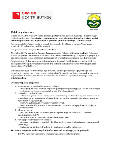 Kolektory słoneczne Gmina Solec-Zdrój wraz z 9-cioma gminami partnerskimi z powiatu buskiego i pińczowskiego realizuje projekt pn.: „Instalacja systemów energii odnawialnej na budynkach użyteczności publicznej oraz domach prywatnych w gminach powiatu buskiego i pińczowskiego". Projekt uzyskał dofinansowanie w ramach Szwajcarsko-Polskiego programu Współpracy w wysokości 75 % kosztów kwalifikowanych. Szwajcarsko-Polski Program Współpracy (SPPW) 20 grudnia 2007 r. pomiędzy Rządem Rzeczypospolitej Polskiej a Szwajcarską Radą Federalną została podpisana Umowa ramowa o wdrażaniu Szwajcarsko-Polskiego Programu Współpracy w celu zmniejszenia różnic społeczno-gospodarczych w obrębie rozszerzonej Unii Europejskiej. Podpisanie tego dokumentu oznaczało uruchomienie ponad 1 mld franków szwajcarskich dla dziesięciu nowych państw członkowskich. Dla Polski Fundusz szwajcarski przewiduje niemal połowę (ok. 489 mln CHF). Beneficjentami tych środków mogą być instytucje sektora publicznego i prywatnego oraz organizacje pozarządowe, przy czym co najmniej 40 % zostanie rozdysponowanych w czterech województwach ściany południowo-wschodniej: lubelskim, małopolskim, podkarpackim i świętokrzyskim. Obszary wsparcia programu: 1. bezpieczeństwo, stabilność, wsparcie reform: - inicjatywy na rzecz rozwoju regionalnego regionów peryferyjnych i słabo rozwiniętych - zwiększenie ochrony wschodnich granic Unii Europejskiej 2. środowisko i infrastruktura: - odbudowa, przebudowa i rozbudowa infrastruktury środowiskowej oraz poprawa stanu środowiska (m.in. zarządzanie odpadami stałymi, systemy energii odnawialnej, poprawa wydajności energetycznej); - poprawa publicznych systemów transportowych; - bioróżnorodność i ochrona ekosystemów oraz wsparcie transgranicznych inicjatyw środowiskowych 3. sektor prywatny: - poprawa środowiska biznesowego i dostępu do kapitału dla małych i średnich przedsiębiorstw (MŚP) - rozwój sektora prywatnego i promocja eksportu MŚP 4. rozwój społeczny i zasobów ludzkich: - ochrona zdrowia (m.in. profilaktyka i kampanie promocji zdrowia oraz poprawa opieki społecznej) - badania i rozwój (m.in. Fundusz Stypendialny, projekty badawcze). W ramach programu można uzyskać dofinansowanie na następującym poziomie: • do 60 % całkowitych kosztów kwalifikowalnych projektu/programu, • do 85 % całkowitych kosztów kwalifikowalnych w przypadku projektów/programów otrzymujących dodatkowe środki finansowe z budżetu jednostek administracji publicznej szczebla centralnego, regionalnego lub lokalnego, • do 90 % całkowitych kosztów kwalifikowalnych w przypadku projektów realizowanych przez organizacje pozarządowe, • do 100 %. całkowitych kosztów w przypadku projektów dotyczących budowy zdolności instytucjonalnych oraz pomocy technicznej. Szczegółowe informacje na temat Szwajcarsko-Polskiego Programu Współpracy można uzyskać na głównych witrynach internetowych SPPW: http://www.programszwajcarski.gov.pl/ http://www.swiss-contribution.admin.ch/poland/ Projekt pn.: Instalacja systemów energii odnawialnej na budynkach użyteczności publicznej oraz domach prywatnych w gminach powiatu buskiego i pińczowskiego. Geneza projektu W marcu 2009 roku samorządy powiatu buskiego i pińczowskiego, zainteresowane wspólną realizacją projektu o roboczej nazwie “Kolektory słoneczne”, podpisały list intencyjny w sprawie przygotowania i wdrożenia projektu oraz pozyskania na ten cel zewnętrznych środków finansowych. W dniu 17 kwietnia 2009 roku w siedzibie Władzy Wdrażającej Programy Europejskie (WWPE) został złożony Zarys Projektu pn.: „Instalacja systemów energii odnawialnej na budynkach użyteczności publicznej oraz domach prywatnych w gminach powiatu buskiego i pińczowskiego”. Dokument ten stanowił wstępną deklarację udziału w Szwajcarsko-Polskim Programie Współpracy w ramach 2 obszaru priorytetowego – Środowisko i infrastruktura. Zarys projektu został ostatecznie zaakceptowany przez stronę szwajcarską w sierpniu 2010 roku. Kolejnym etapem związanym z procedurą pozyskania dofinansowania było złożenie Kompletnej Propozycji Projektu (KPP) – szczegółowego wniosku wraz z załącznikami – m.in. studium wykonalności projektu. Jednym z dokumentów niezbędnych do złożenia KPP było porozumienie między gminami partnerskimi, regulujące wzajemne prawa i obowiązki w trakcie przygotowania i realizacji projektu. Porozumienie takie, między Gminą Busko-Zdrój jako Instytucją Realizującą a gminami: Gnojno, Nowy Korczyn, Pacanów, Solec-Zdrój, Stopnica, Tuczępy, Wiślica, Pińczów i Kije, zostało podpisane w dniu 18 stycznia 2011 roku. W dniu 14 marca 2011r. została złożona do Władzy Wdrażającej Programy Europejskie w Warszawie Kompletna Propozycja Projektu. Umowa w sprawie projektu między stroną polską (MRR) i stroną szwajcarską została podpisana w dniu 16 stycznia 2012 r. W dniu 20 lutego 2012 r. Gmina Busko-Zdrój, jako Instytucja Realizująca, podpisała umowę w sprawie realizacji projektu z WWPE. Zakres rzeczowy projektu Zakres rzeczowy projektu obejmuje montaż kolektorów słonecznych w celu efektywnego pozyskania energii słonecznej do ogrzania ciepłej wody użytkowej. Szacunkowe koszty realizacji projektu, które zostały określone w studium wykonalności, wynoszą ogółem ok. 67 mln zł. Kwota dofinansowania projektu w ramach SPPW wynosi ok. 50 mln zł, co stanowi 75% kosztów kwalifikowanych. Projekt będzie realizowany w latach: 2012 – 2015