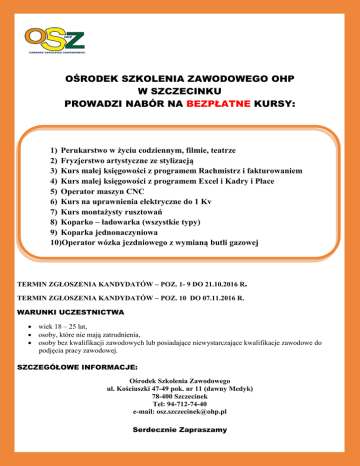 OŚRODEK SZKOLENIA ZAWODOWEGO OHP W SZCZECINKU PROWADZI NABÓR NA BEZPŁATNE KURSY: 1) Perukarstwo w życiu codziennym, filmie, teatrze 2) Fryzjerstwo artystyczne ze stylizacją 3) Kurs małej księgowości z programem Rachmistrz i fakturowaniem 4) Kurs malej księgowości z programem Excel i Kadry i Płace 5) Operator maszyn CNC 6) Kurs na uprawnienia elektryczne do 1 Kv 7) Kurs montażysty rusztowań 8) Koparko – ładowarka (wszystkie typy) 9) Koparka jednonaczyniowa 10)Operator wózka jezdniowego z wymianą butli gazowej TERMIN ZGŁOSZENIA KANDYDATÓW – POZ. 1- 9 DO 21.10.2016 R. TERMIN ZGŁOSZENIA KANDYDATÓW – POZ. 10 DO 07.11.2016 R. WARUNKI UCZESTNICTWA wiek 18 – 25 lat, osoby, które nie mają zatrudnienia, osoby bez kwalifikacji zawodowych lub posiadające niewystarczające kwalifikacje zawodowe do podjęcia pracy zawodowej. SZCZEGÓŁOWE INFORMACJE: Ośrodek Szkolenia Zawodowego ul. Kościuszki 47-49 pok. nr 11 (dawny Medyk) 78-400 Szczecinek Tel: 94-712-74-40 e-mail: [email protected] Serdecznie Zapraszamy